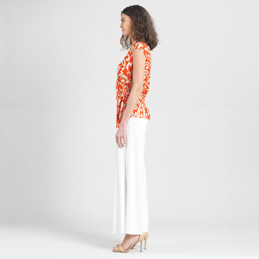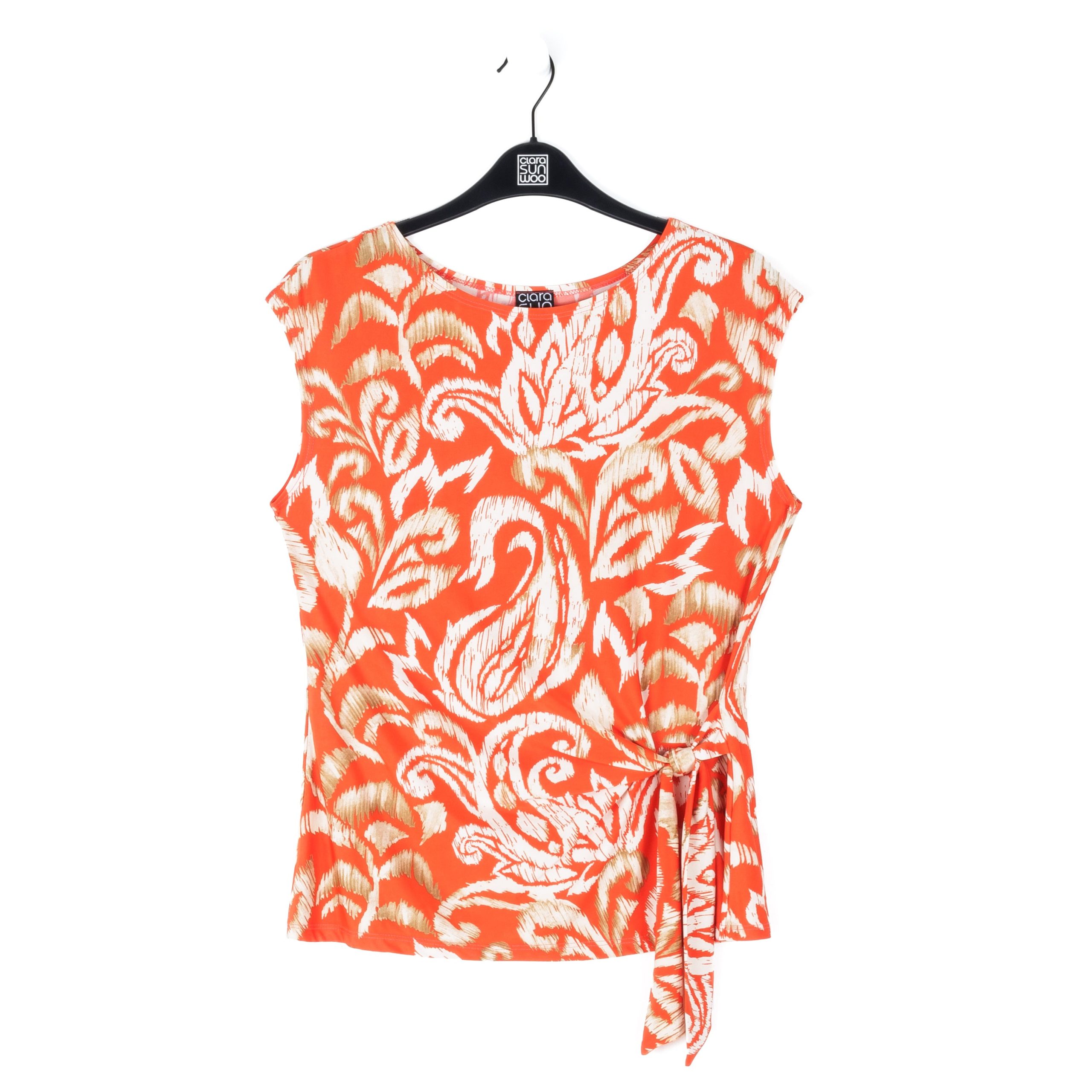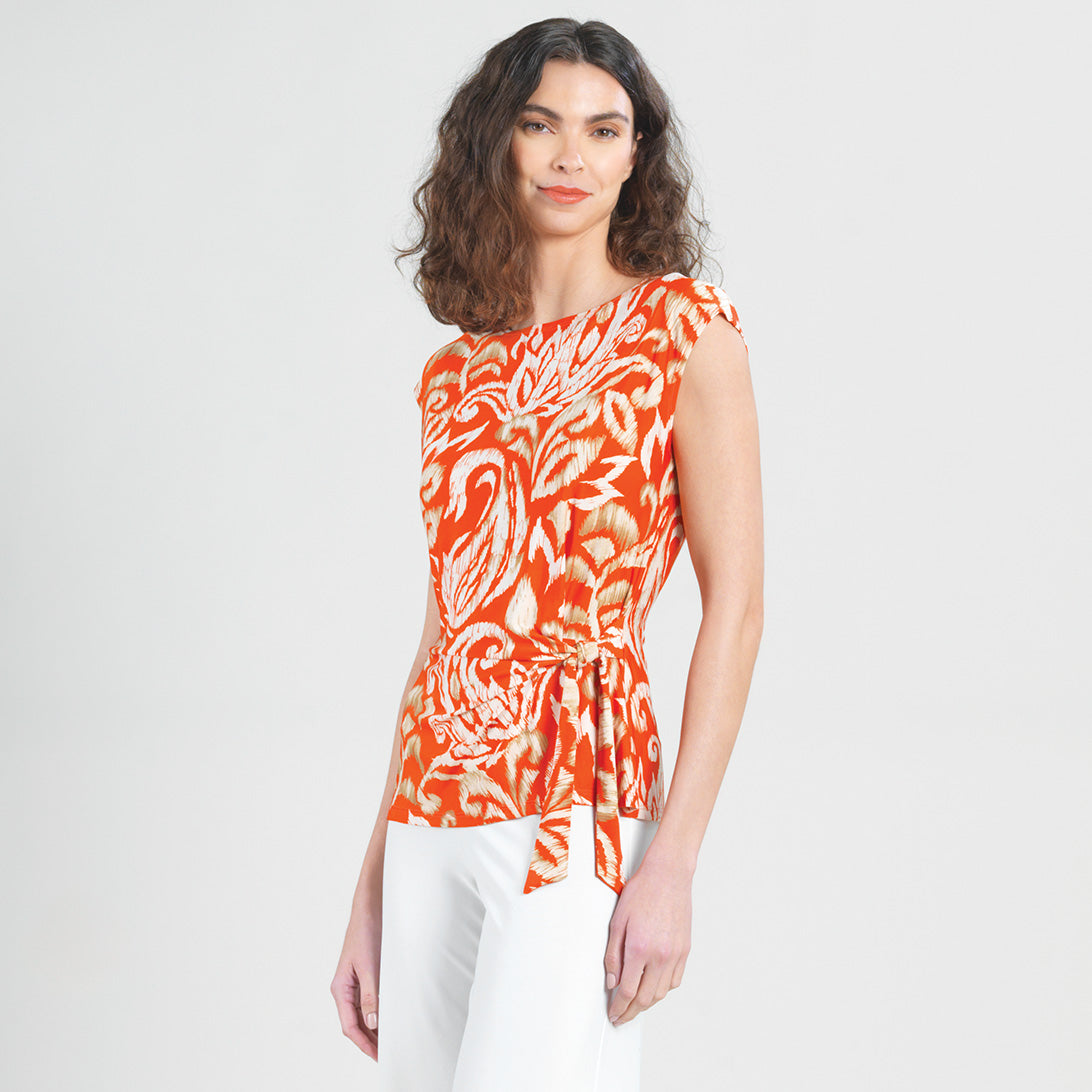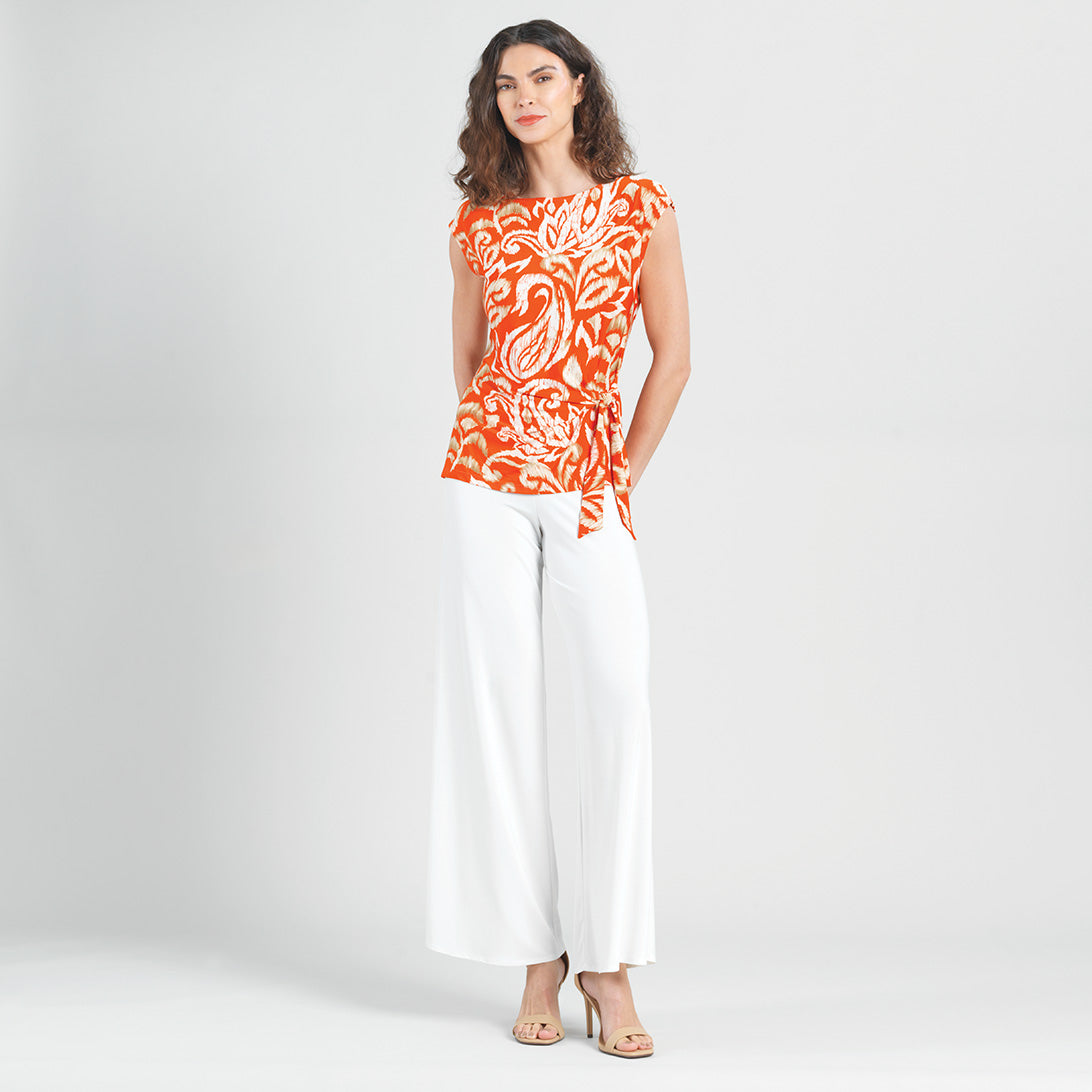 Are you looking for that perfect style that will instantly refresh your wardrobe? Well, our Paisley Lotus Butter Knit Cap Sleeve Side Tie Top is sure to breathe new life into it! This style features a scoop neckline, cap sleeves, a side tie detail that allows you to create a silhouette to your liking, and a straight hemline. An elegantly feminine print displaying a large-scale paisley design in lotus flower shapes, comprised of a warm, orange-toned coral, ivory, and shades of tan. ♥ Each piece is a unique, one-of-a-kind print and print placement will vary. An elegant, translucent fabric, inspired by luxe satin fibers. Designed to beautifully drape against the body, with the softest, velvety-silken-like finish, while being cool and smooth to the touch. Carefree Travel Fabric – Soft Silky Buttery Knit Our signature poly blend fibers create an ultra-soft, buttery feel that’s wrinkle-free and perfect for traveling. Enjoy the luxurious sensation and an indulgent touch of our fabric – you’ll never want to take it off!Wrinkle Free Travel Friendly Ultra Lightweight Soft Buttery Knit Fabric Breathable Jersey-Like Feel
