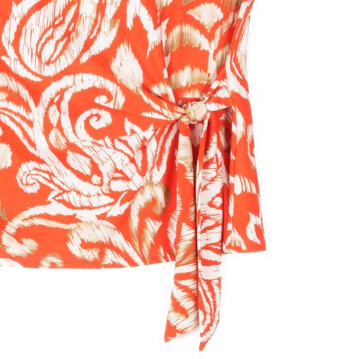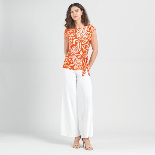 Are you looking for that perfect style that will instantly refresh your wardrobe? Well, our Paisley Lotus Butter Knit Cap Sleeve Side Tie Top is sure to breathe new life into it! This style features a scoop neckline, cap sleeves, a side tie detail that allows you to create a silhouette to your liking, and a straight hemline. An elegantly feminine print displaying a large-scale paisley design in lotus flower shapes, comprised of a warm, orange-toned coral, ivory, and shades of tan. ♥ Each piece is a unique, one-of-a-kind print and print placement will vary. An elegant, translucent fabric, inspired by luxe satin fibers. Designed to beautifully drape against the body, with the softest, velvety-silken-like finish, while being cool and smooth to the touch. Carefree Travel Fabric – Soft Silky Buttery Knit Our signature poly blend fibers create an ultra-soft, buttery feel that’s wrinkle-free and perfect for traveling. Enjoy the luxurious sensation and an indulgent touch of our fabric – you’ll never want to take it off!Wrinkle Free Travel Friendly Ultra Lightweight Soft Buttery Knit Fabric Breathable Jersey-Like Feel