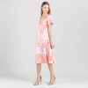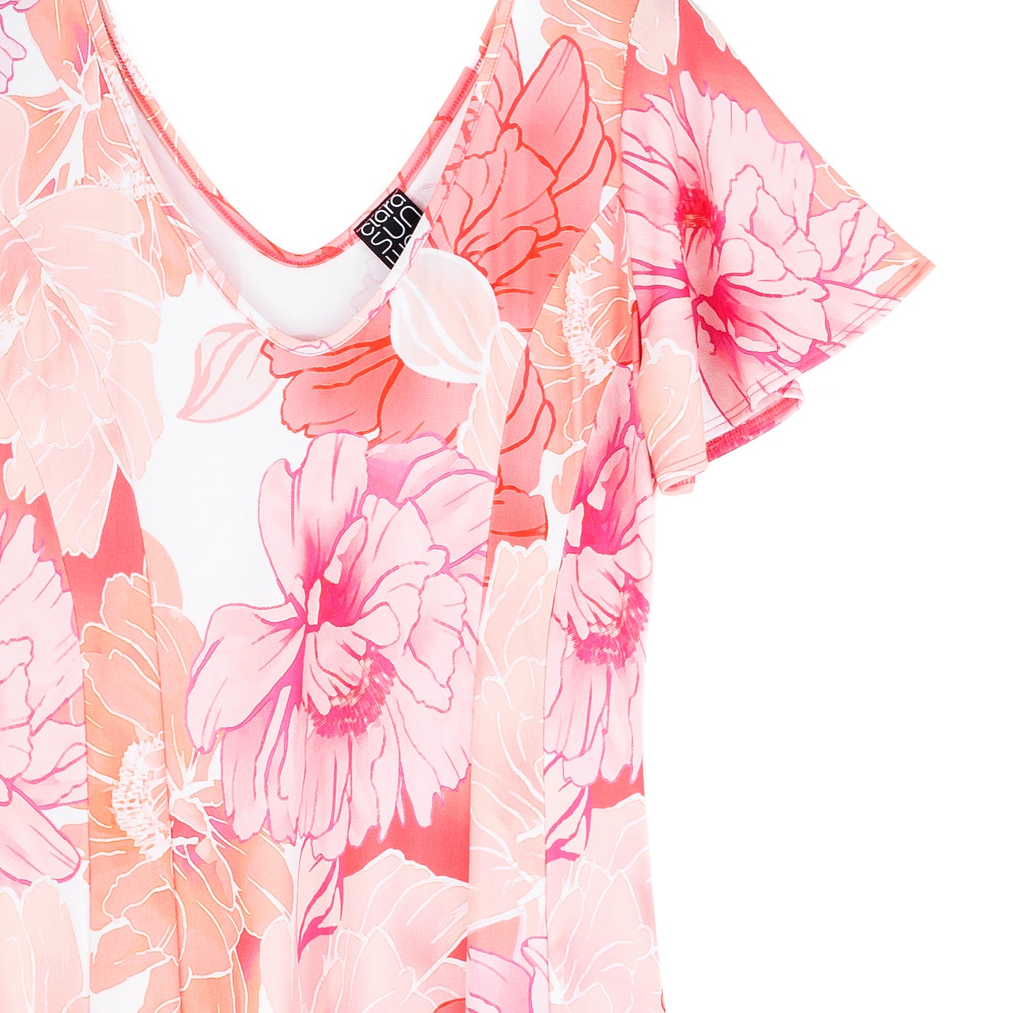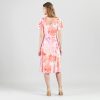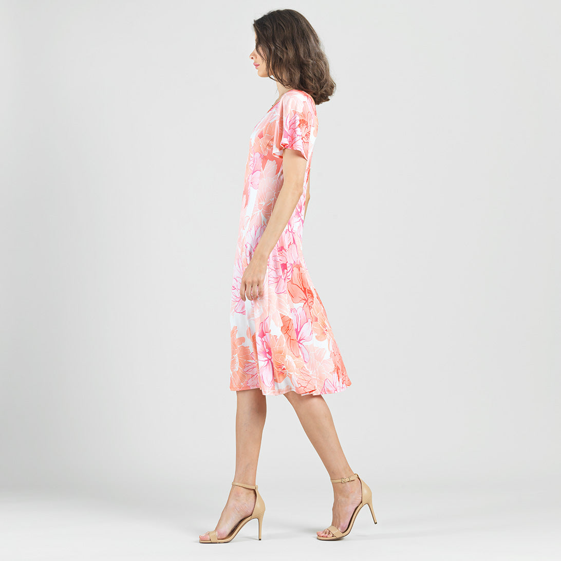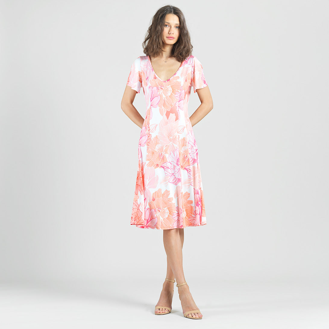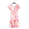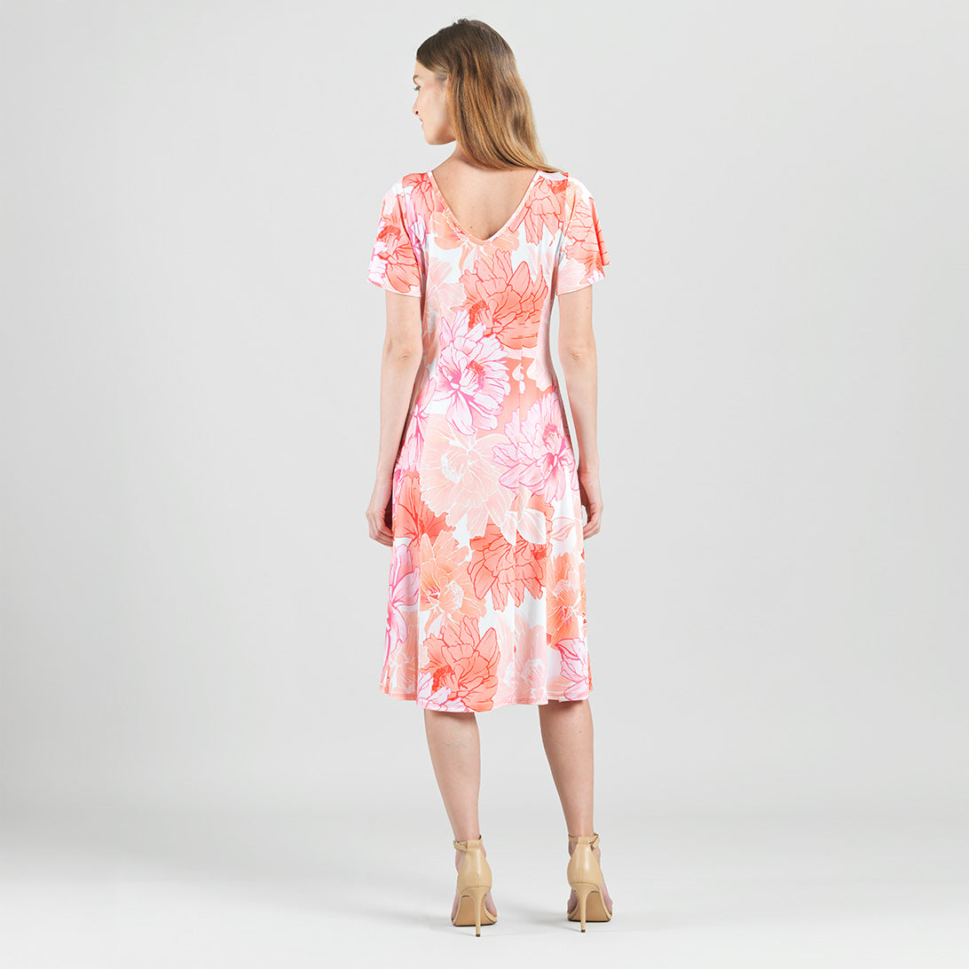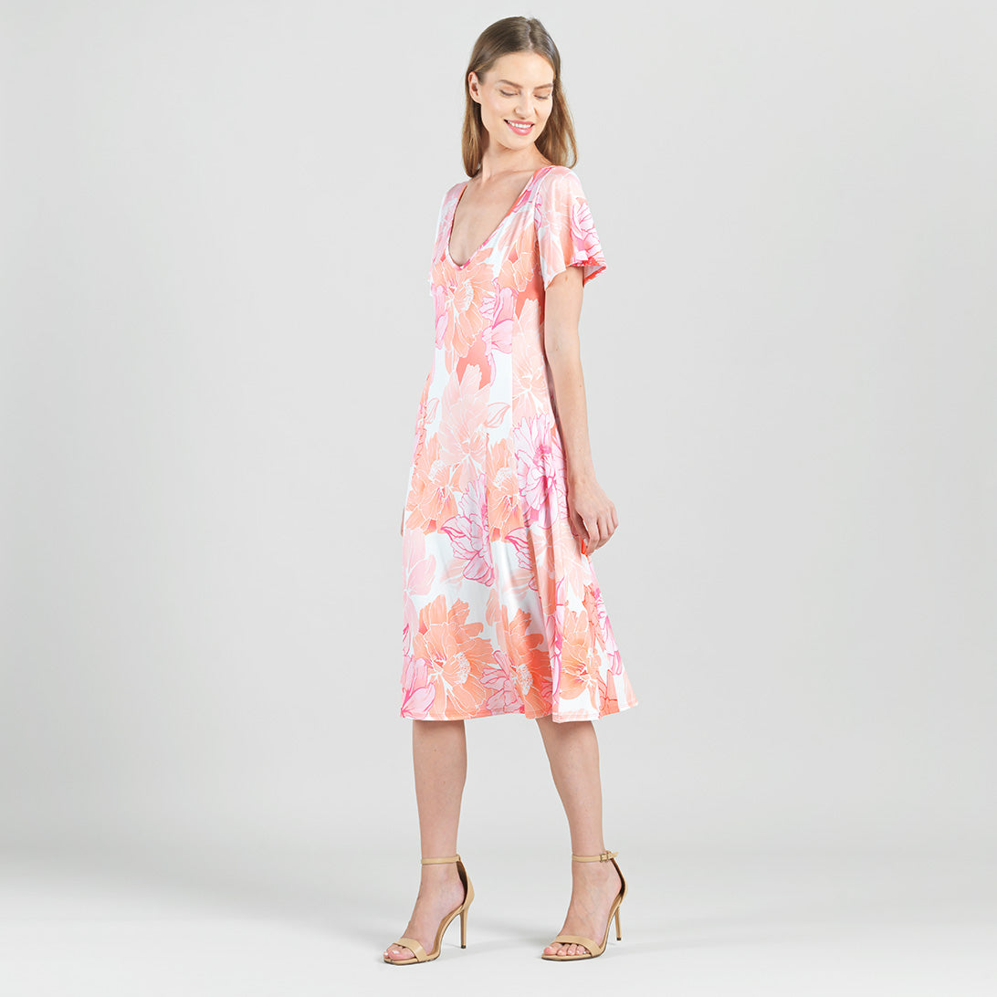 Experience the beauty of a golden hour in our Sunset Petals Butter Knit Flutter Sleeve A-Line Midi Dress! This stunning dress features a v-neckline, charming short flounce sleeves, and vertical princess seams that cascade down a flattering A-line silhouette with a midi hemline that creates a beautiful drape. A delicate arrangement of large-scale flowers in shades of coral, peach, pink, and subtle hints of white that create gentle gradients that mimic the fluidity of watercolors. ♥ Each piece is a unique, one-of-a-kind print and print placement will vary. An elegant, translucent fabric, inspired by luxe satin fibers. Designed to beautifully drape against the body, with the softest, velvety-silken-like finish, while being cool and smooth to the touch. Carefree Travel Fabric – Soft Silky Buttery Knit Our signature poly blend fibers create an ultra-soft, buttery feel that’s wrinkle-free and perfect for traveling. Enjoy the luxurious sensation and an indulgent touch of our fabric – you’ll never want to take it off!V-Neckline Wrinkle Free Travel Friendly Ultra Lightweight Soft Buttery Knit Fabric Breathable Jersey-Like Feel