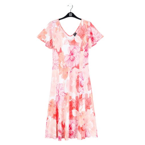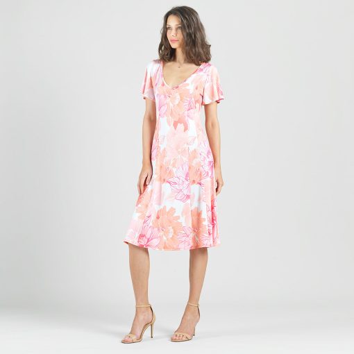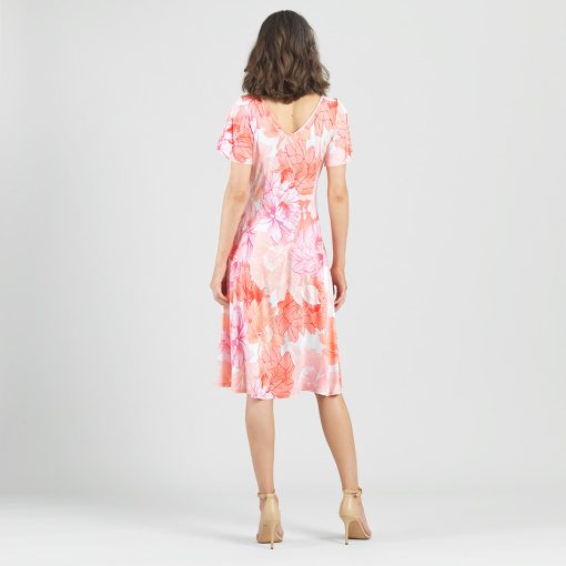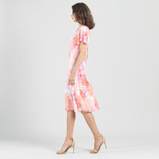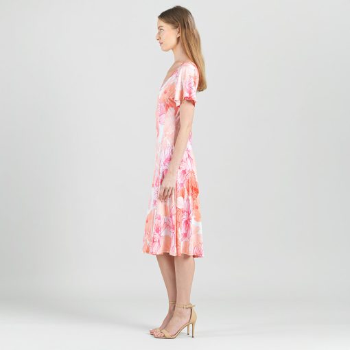 Experience the beauty of a golden hour in our Sunset Petals Butter Knit Flutter Sleeve A-Line Midi Dress! This stunning dress features a v-neckline, charming short flounce sleeves, and vertical princess seams that cascade down a flattering A-line silhouette with a midi hemline that creates a beautiful drape. A delicate arrangement of large-scale flowers in shades of coral, peach, pink, and subtle hints of white that create gentle gradients that mimic the fluidity of watercolors. ♥ Each piece is a unique, one-of-a-kind print and print placement will vary. An elegant, translucent fabric, inspired by luxe satin fibers. Designed to beautifully drape against the body, with the softest, velvety-silken-like finish, while being cool and smooth to the touch. Carefree Travel Fabric – Soft Silky Buttery Knit Our signature poly blend fibers create an ultra-soft, buttery feel that’s wrinkle-free and perfect for traveling. Enjoy the luxurious sensation and an indulgent touch of our fabric – you’ll never want to take it off!V-Neckline Wrinkle Free Travel Friendly Ultra Lightweight Soft Buttery Knit Fabric Breathable Jersey-Like Feel