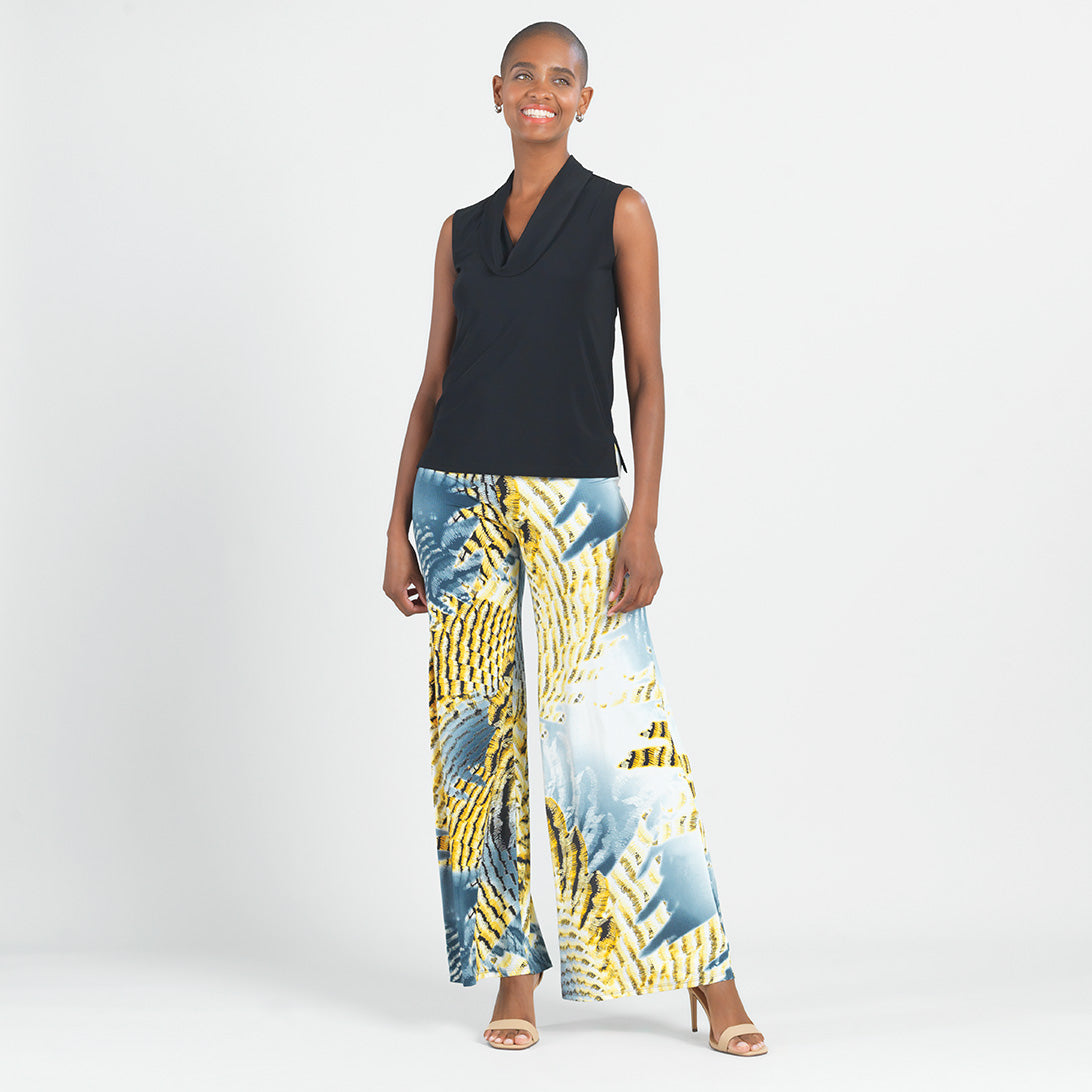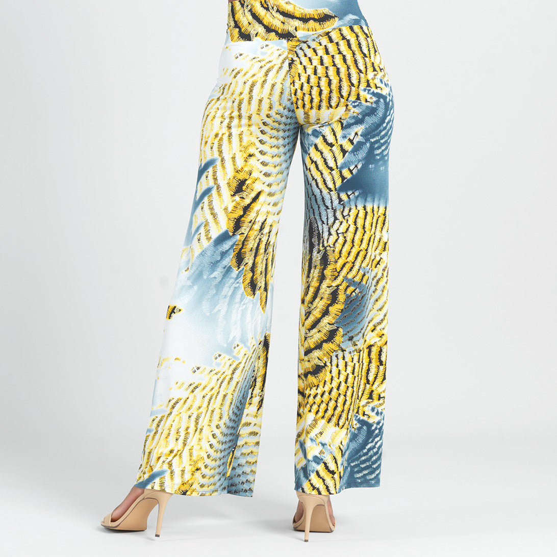 Spread your wings and soar to new fashion heights in our Palm Feather Palazzo Pant! Featuring a 3” pull-on soft waistband and ultra-flattering wide-leg silhouette that naturally flows against the body. A one-of-a-kind print, displaying graphic feathers comprised of yellow and black in palm leaf shapes, encompassed by an ivory and silver-grey gradient effect. ♥ Each piece is a unique, one-of-a-kind print and print placement will vary. An elegant, translucent fabric, inspired by luxe satin fibers. Designed to beautifully drape against the body, with the softest, velvety-silken-like finish, while being cool and smooth to the touch. Carefree Travel Fabric – Soft Silky Buttery Knit Our signature poly blend fibers create an ultra-soft, buttery feel that’s wrinkle-free and perfect for traveling. Enjoy the luxurious sensation and an indulgent touch of our fabric – you’ll never want to take it off!Wrinkle Free Travel Friendly Ultra Lightweight Soft Buttery Knit Fabric Breathable Jersey-Like Feel