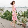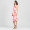 Experience the beauty of a golden hour in our Sunset Petals Butter Knit Side Slit Midi Dress! This stunning dress features a high draped neckline, cap sleeves, a ruched side bodice that creates a flattering draped silhouette, and a 10″ left side slit with a midi hemline. A delicate arrangement of large-scale flowers in shades of coral, peach, pink, and subtle hints of white that create gentle gradients that mimic the fluidity of watercolors. ♥ Each piece is a unique, one-of-a-kind print and print placement will vary. An elegant, translucent fabric, inspired by luxe satin fibers. Designed to beautifully drape against the body, with the softest, velvety-silken-like finish, while being cool and smooth to the touch. Carefree Travel Fabric – Soft Silky Buttery Knit Our signature poly blend fibers create an ultra-soft, buttery feel that’s wrinkle-free and perfect for traveling. Enjoy the luxurious sensation and an indulgent touch of our fabric – you’ll never want to take it off!10″ Left Side Slit Wrinkle Free Travel Friendly Ultra Lightweight Soft Buttery Knit Fabric Breathable Jersey-Like Feel