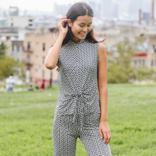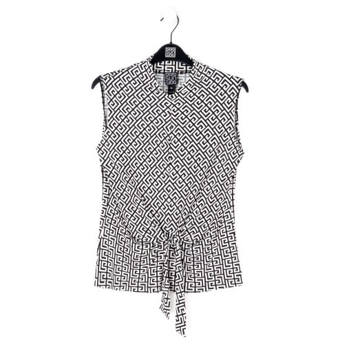 Our Greek Key Butter Knit Sleeveless Center Front Tie Top gives new meaning to the phrase “eternal fashion”! This flattering sleeveless top features a v-bottle neckline, a vertical neck-to-hem center seam, and a front-center waist tie that creates a beautiful draped effect that accentuates your natural figure. A graphic print that displays a geometric design of Greek keys formatted in a linear placement that helps to accentuate and flatter the figure. ♥ Each piece is a unique, one-of-a-kind print and print placement will vary. An elegant, translucent fabric, inspired by luxe satin fibers. Designed to beautifully drape against the body, with the softest, velvety-silken-like finish, while being cool and smooth to the touch. Carefree Travel Fabric – Soft Silky Buttery Knit Our signature poly blend fibers create an ultra-soft, buttery feel that’s wrinkle-free and perfect for traveling. Enjoy the luxurious sensation and an indulgent touch of our fabric – you’ll never want to take it off!Wrinkle Free Travel Friendly Ultra Lightweight Soft Buttery Knit Fabric Breathable Jersey-Like Feel