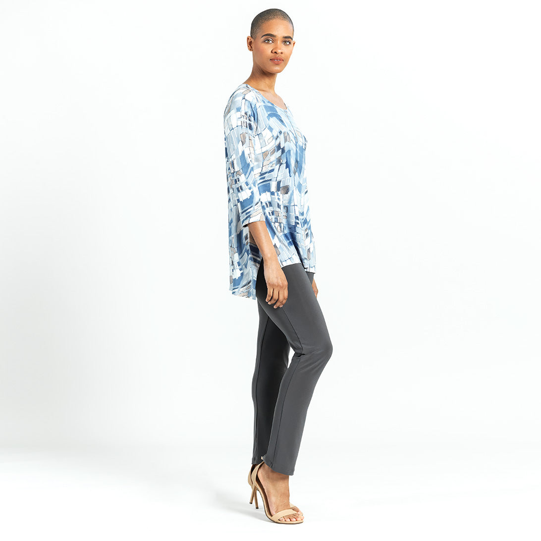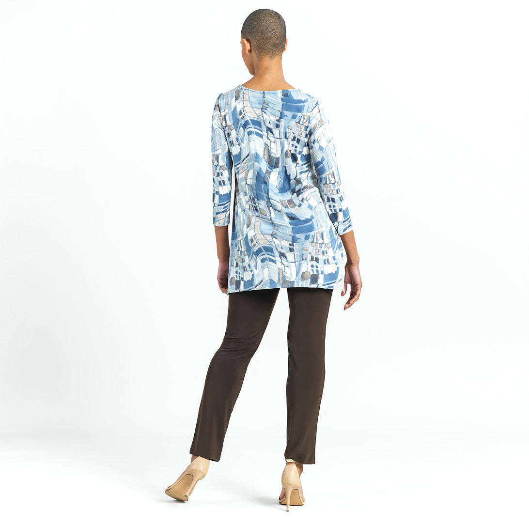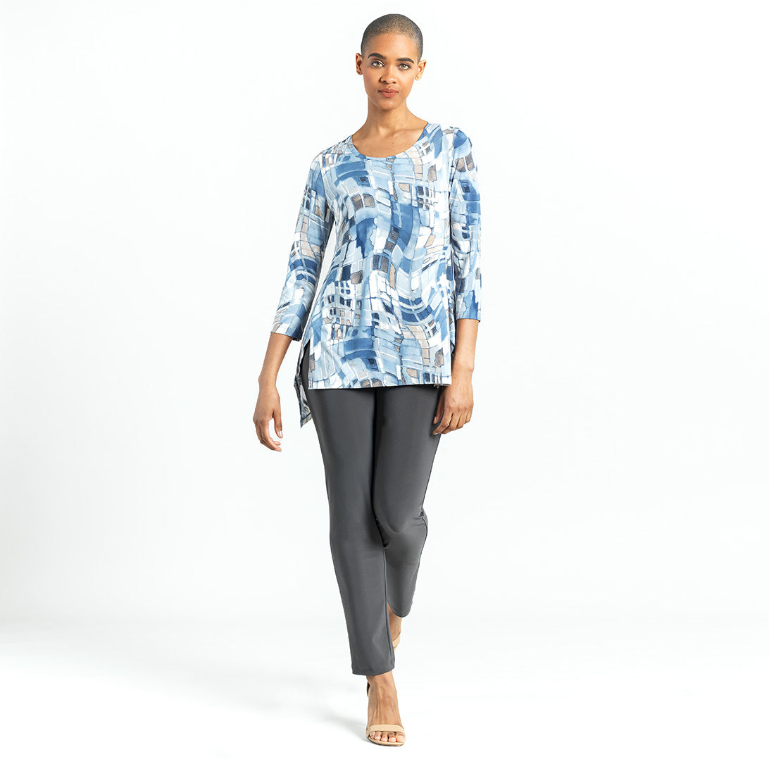 While a picture may be worth a thousand words, our Mosaic Tile Textured Parachute Hem Tunic is that much more beautiful in person! Featuring a round neckline, 3/4 length sleeves, and a side vent parachute hemline. A visually appealing print, featuring an arrangement of tile squares in mosaic shapes displayed in shades of powder and denim blue, and light grey, encompassed by dark and light shades of taupe, with a white embossed texture that creates a 3-dimensional contrast. ♥ Each piece is a unique, one-of-a-kind print and print placement will vary. An elegant, translucent fabric, inspired by luxe satin fibers. Designed to beautifully drape against the body, with the softest, velvety-silken-like finish, while being cool and smooth to the touch. Carefree Travel Fabric – Soft Silky Buttery Knit w/ Embossed Textured Our signature poly blend fibers create an ultra-soft, buttery feel, that’s wrinkle-free and perfect for traveling, featuring an embossed texture. Enjoy the luxurious sensation and an indulgent touch of our fabric – you’ll never want to take it off!Wrinkle Free Travel Friendly Ultra Lightweight Soft Buttery Knit Fabric Breathable Jersey-Like Feel Embossed Threading Detail