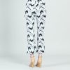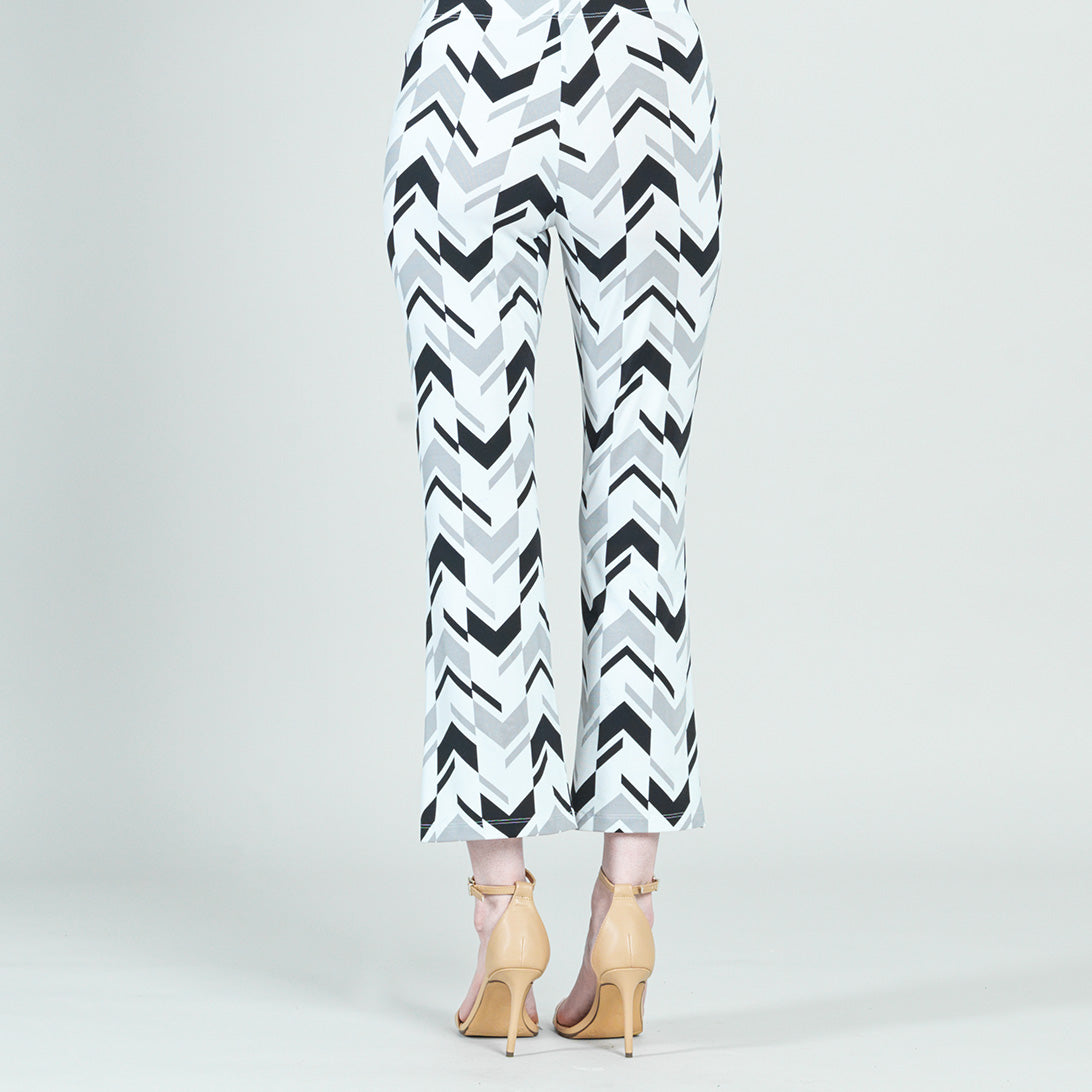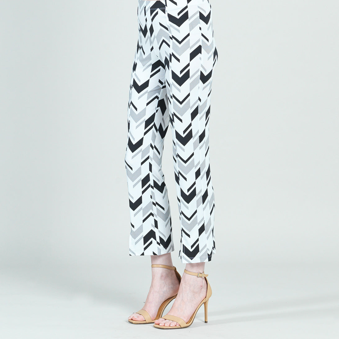 Don’t pass up our Chevron Stripe Center Seam Front Slit Ankle Pant… you’ve earned it! This stylish pant features a 1” pull-on elastic waistband, vertical center leg seam with a flared ankle-length hem, and sleek front leg slit. Made to provide a slimming silhouette in the hip and thigh area while gradually flaring towards the hem. A graphic print, comprised of scattered chevron shapes in a stripe-like formation, in shades of black and cool-toned grey, against a white background. ♥ Each piece is a unique, one-of-a-kind print and print placement will vary. Carefree Travel Fabric – Soft Silky Knit Our signature poly blend fibers offer luxurious softness with lightweight, wrinkle-free comfort. This easy-care fabric is quick drying and cooler than linen or cotton, making it perfect for on-the-go wear.1″ Elastic Waistband 4.5″ to 5″ Front Slit Flared Opening Center Seam Detail Wrinkle Free Travel Friendly Ultra Lightweight Soft Knit Fabric Breathable Jersey-Like Feel