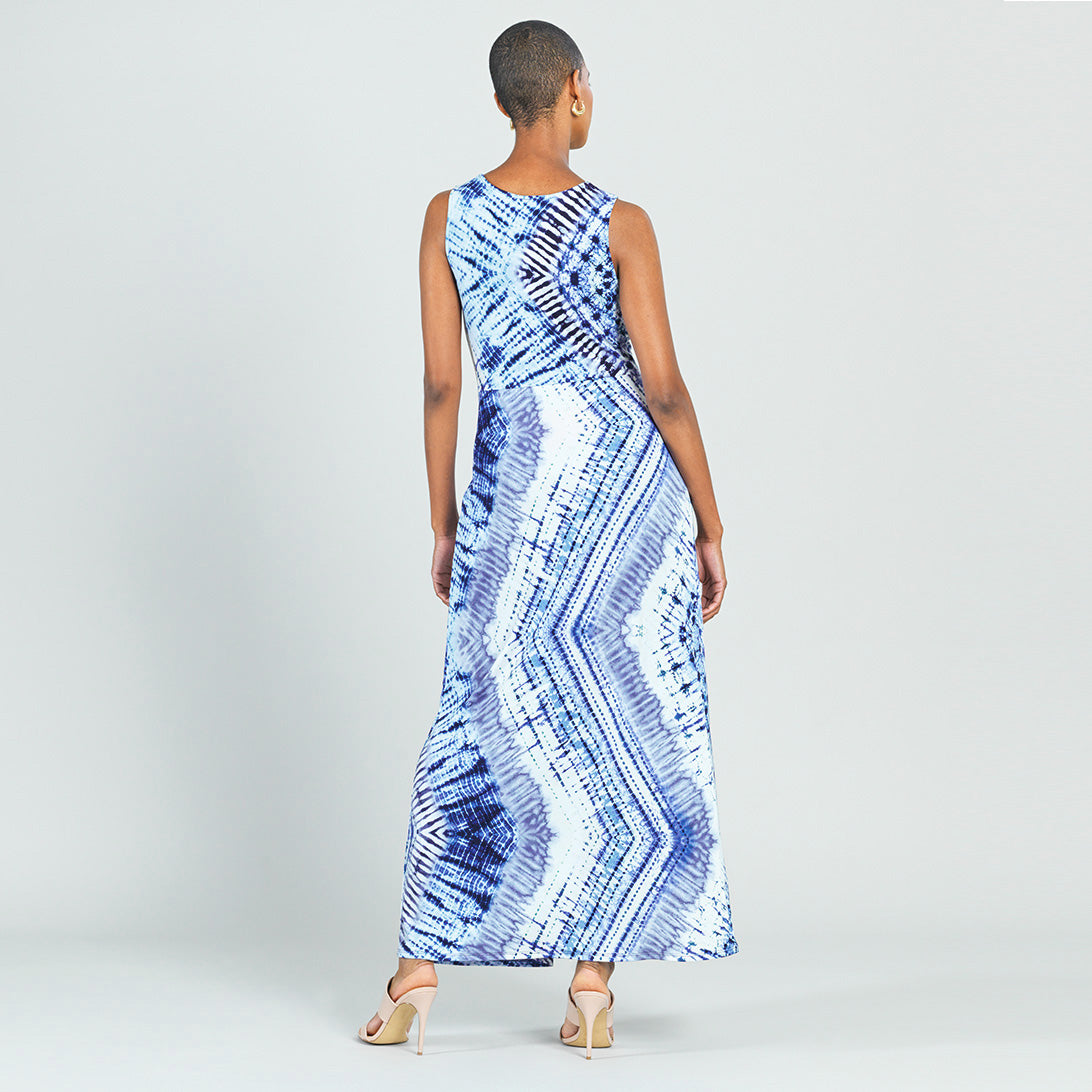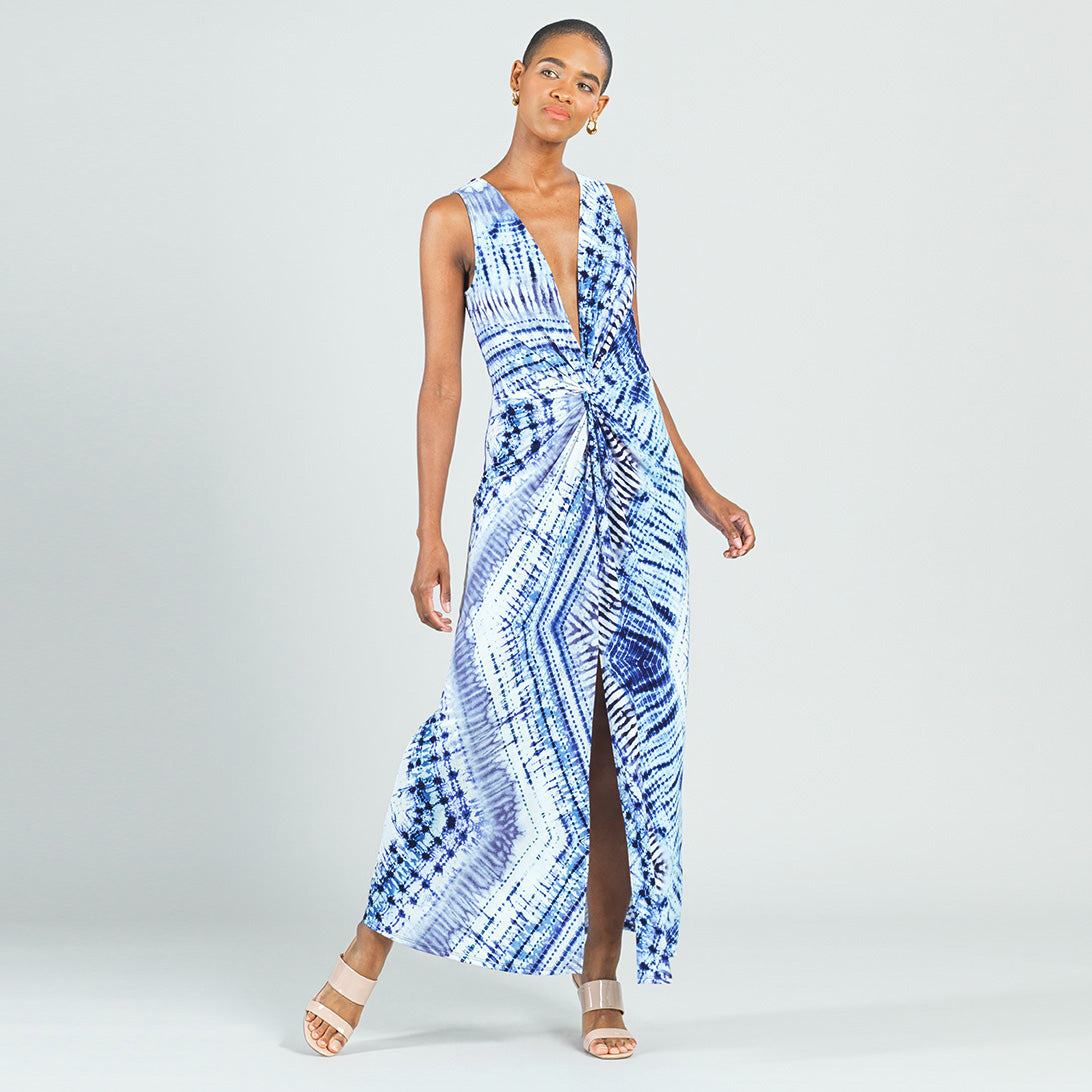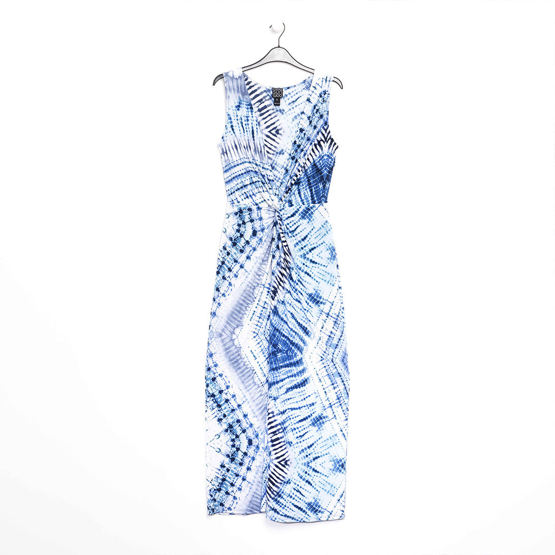 Our Acid Wash Center Slit Maxi Dress is to dye for! This stunning sleeveless dress features a deep v-neckline, wide shoulder coverage, and a knotted twist bodice detail, that accentuates the waist while creating a flattering draped silhouette, with a 24″ front center slit and flowing maxi hemline. A stunning acid wash print, comprised of oceanic shades of navy, sky, baby blues, and white, with subtle hints of teal and beige, that display a tie-dye effect, in sunburst shapes. ♥ Each piece is a unique, one-of-a-kind print and print placement will vary. Carefree Travel Fabric – Soft Silky Knit Our signature poly blend fibers offer luxurious softness with lightweight, wrinkle-free comfort. This easy-care fabric is quick drying and cooler than linen or cotton, making it perfect for on-the-go wear.Wrinkle Free Travel Friendly Ultra Lightweight Soft Knit Fabric Breathable Jersey-Like Feel 24″ Center Front Slit