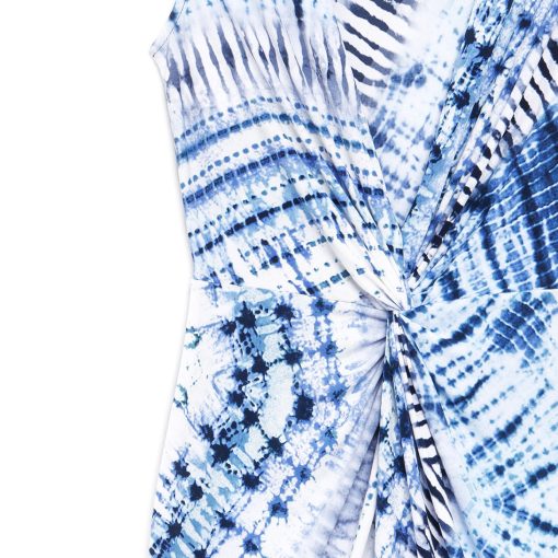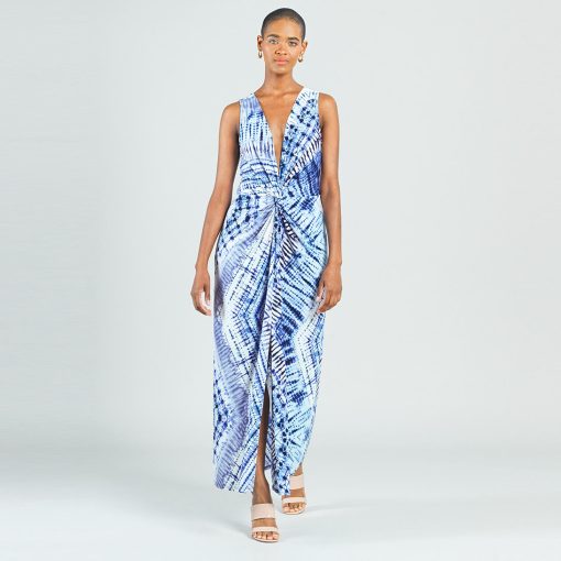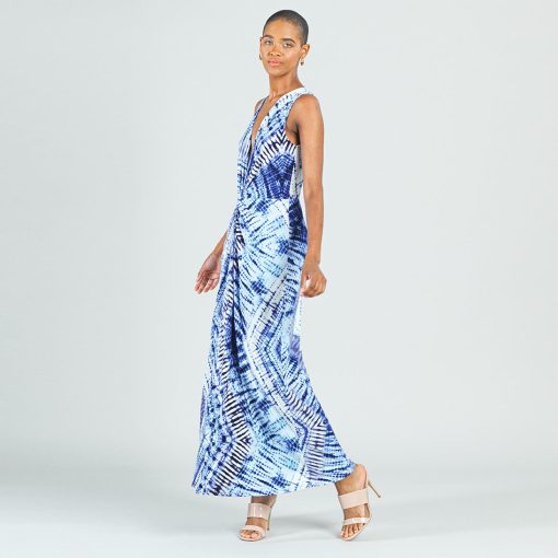 Our Acid Wash Center Slit Maxi Dress is to dye for! This stunning sleeveless dress features a deep v-neckline, wide shoulder coverage, and a knotted twist bodice detail, that accentuates the waist while creating a flattering draped silhouette, with a 24″ front center slit and flowing maxi hemline. A stunning acid wash print, comprised of oceanic shades of navy, sky, baby blues, and white, with subtle hints of teal and beige, that display a tie-dye effect, in sunburst shapes. ♥ Each piece is a unique, one-of-a-kind print and print placement will vary. Carefree Travel Fabric – Soft Silky Knit Our signature poly blend fibers offer luxurious softness with lightweight, wrinkle-free comfort. This easy-care fabric is quick drying and cooler than linen or cotton, making it perfect for on-the-go wear.Wrinkle Free Travel Friendly Ultra Lightweight Soft Knit Fabric Breathable Jersey-Like Feel 24″ Center Front Slit
