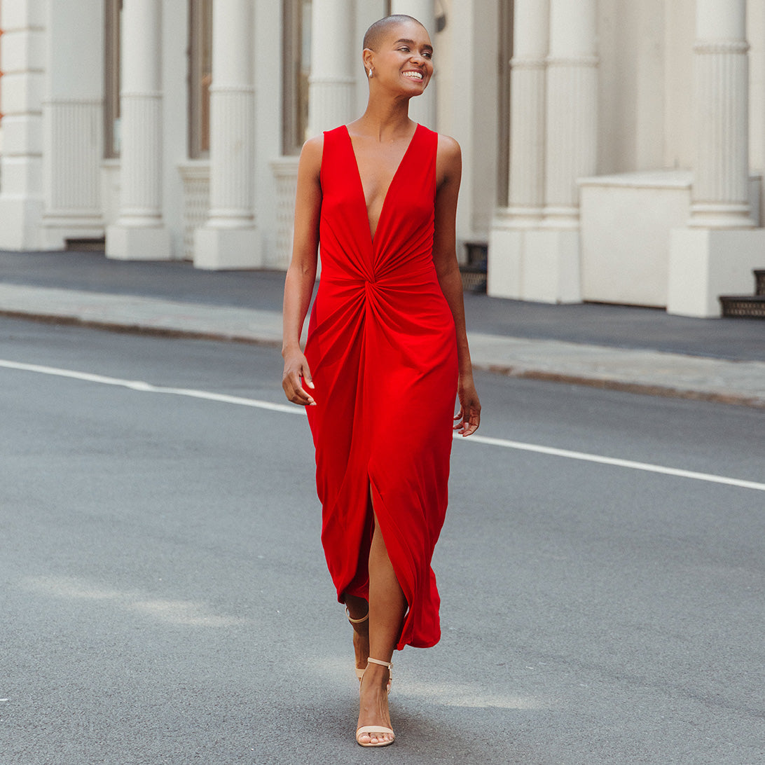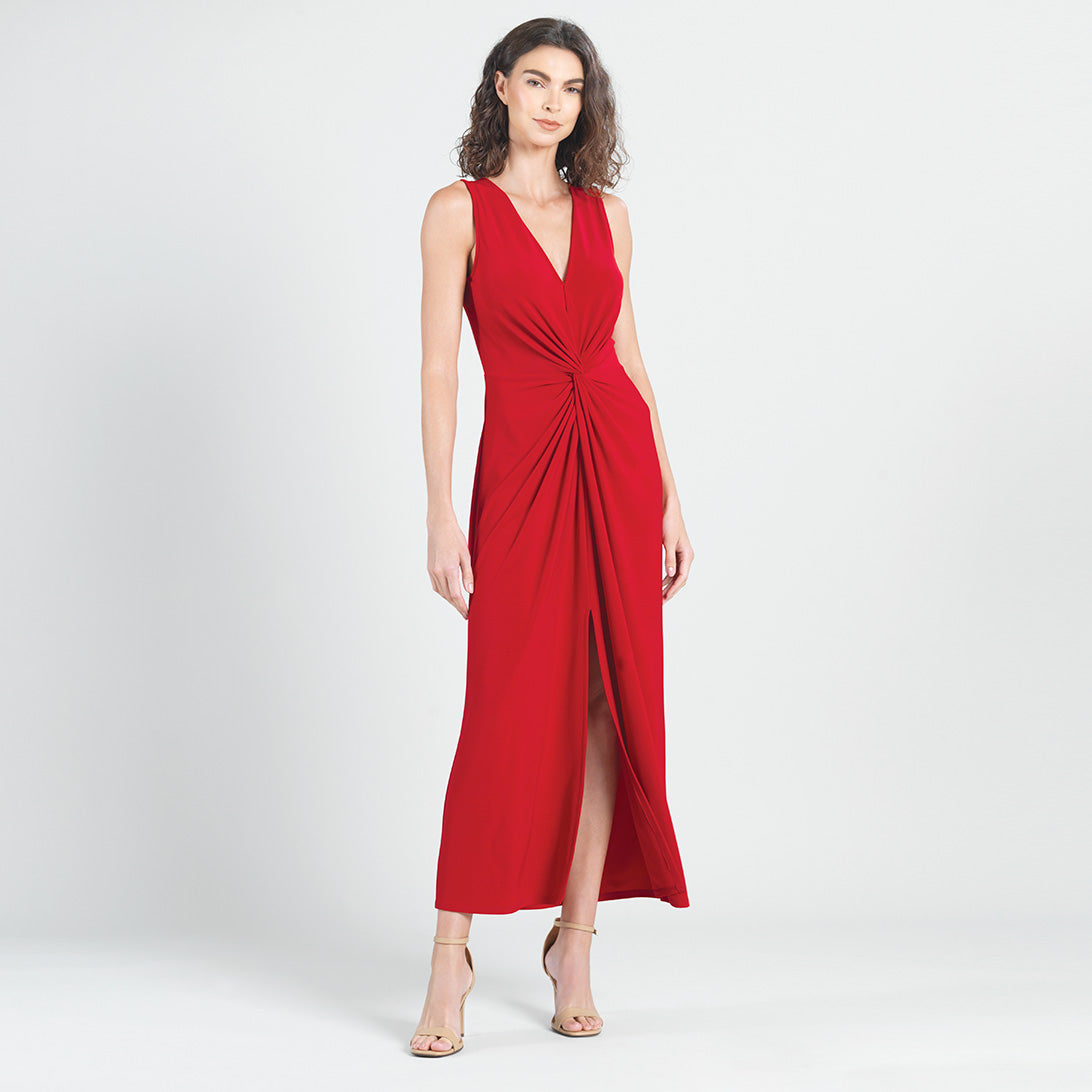 Our Center Slit Maxi Dress is a dress you’ll never mind committing to! This stunning sleeveless dress features a deep v-neckline, wide shoulder coverage, and a knotted twist bodice detail, that accentuates the waist while creating a flattering draped silhouette, with a 24″ front center slit and flowing maxi hemline. Our Red shade is a true red color with subtle brick undertones. Carefree Travel Fabric – Soft Silky Knit Our signature poly blend fibers offer luxurious softness with lightweight, wrinkle-free comfort. This easy-care fabric is quick drying and cooler than linen or cotton, making it perfect for on-the-go wear.Wrinkle Free Travel Friendly Ultra Lightweight Soft Knit Fabric Breathable Jersey-Like Feel 24″ Center Front Slit