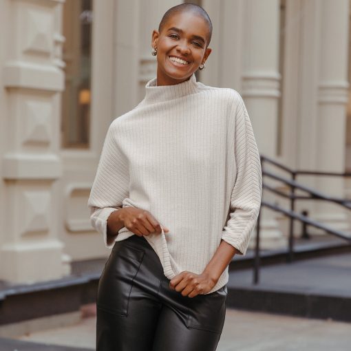 If you’re looking for a style that combines contemporary fashion with luxurious warmth, then look no further than our Chunky Ribbed Funnel Neck Modern Sweater Top! This sweater features a cozy funnel neckline, 3/4 length dolman sleeves, and a straight hemline. Our Sand color is a creamy nude shade with neutral eggshell undertones.Chunky Cotton-Ribbed Sweater Knit Our Poly-Cotton Blend sweater knit is constructed from a thicker, mid-heavy weight fabric. Its sturdy ribbed texture is meant to provide substantial warmth and a heavy drape, with a chunky structure that retains its shape for long-lasting use. Known to get softer with each wear while maintaining exceptional durability that is easy to care for and travel-friendly!Travel Friendly Chunky Ribbed Texture Thicker, Mid-Heavy Weight Fabric