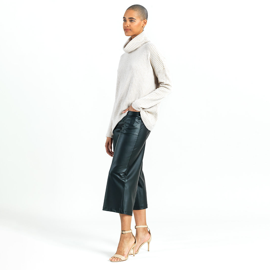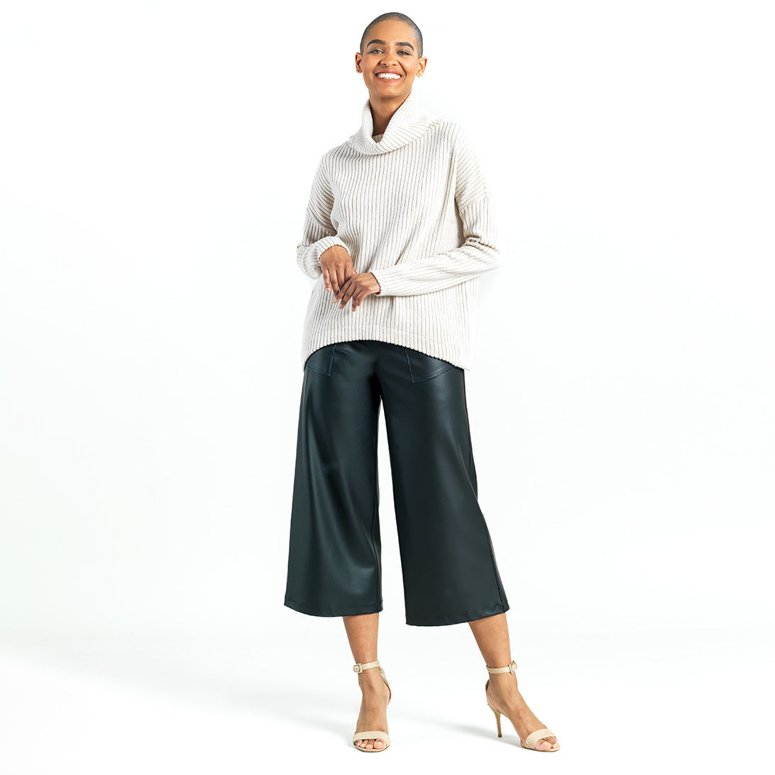 If you’re looking for a style that combines contemporary fashion with luxurious warmth, then look no further than our Chunky Ribbed Tipped Hem Sweater Top! This sweater features a cowl-style turtleneck, long sleeves, and a tipped hemline. Our Sand color is a creamy nude shade with neutral eggshell undertones.Chunky Cotton-Ribbed Sweater Knit Our Poly-Cotton Blend sweater knit is constructed from a thicker, mid-heavy weight fabric. Its sturdy ribbed texture is meant to provide substantial warmth and a heavy drape, with a chunky structure that retains its shape for long-lasting use. Known to get softer with each wear while maintaining exceptional durability that is easy to care for and travel-friendly!Travel Friendly Chunky Ribbed Texture Thicker, Mid-Heavy Weight Fabric