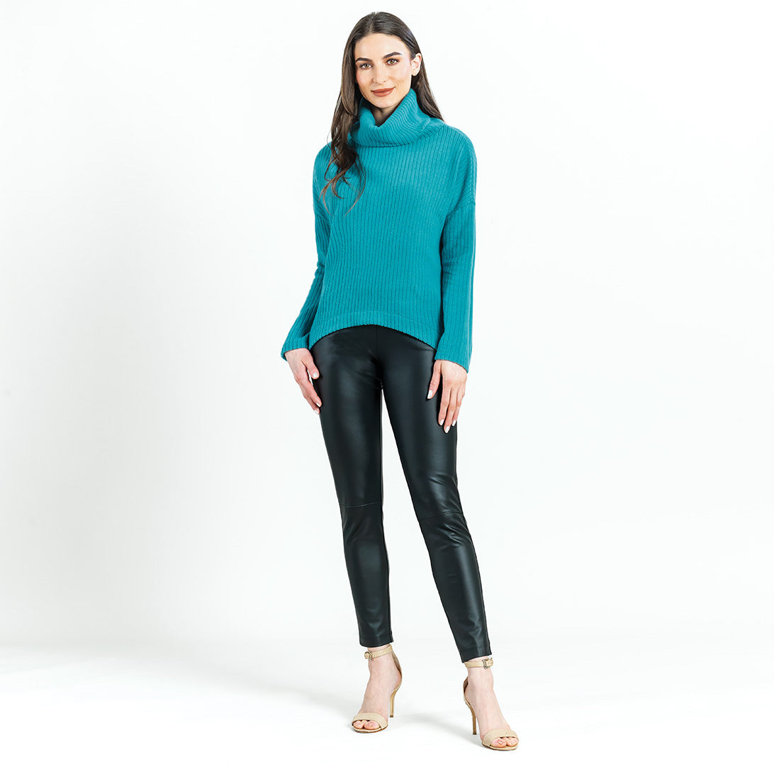 If you’re looking for a style that combines contemporary fashion with luxurious warmth, then look no further than our Chunky Ribbed Tipped Hem Sweater Top! This sweater features a cowl-style turtleneck, long sleeves, and a tipped hemline. Our Teal color is a warm, light teal shade with blue-aquamarine undertones.Chunky Cotton-Ribbed Sweater Knit Our Poly-Cotton Blend sweater knit is constructed from a thicker, mid-heavy weight fabric. Its sturdy ribbed texture is meant to provide substantial warmth and a heavy drape, with a chunky structure that retains its shape for long-lasting use. Known to get softer with each wear while maintaining exceptional durability that is easy to care for and travel-friendly!Travel Friendly Chunky Ribbed Texture Thicker, Mid-Heavy Weight Fabric
