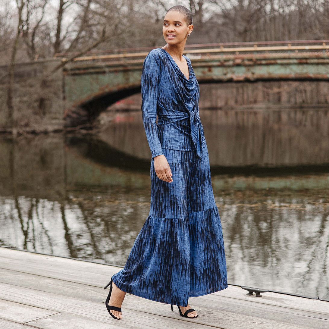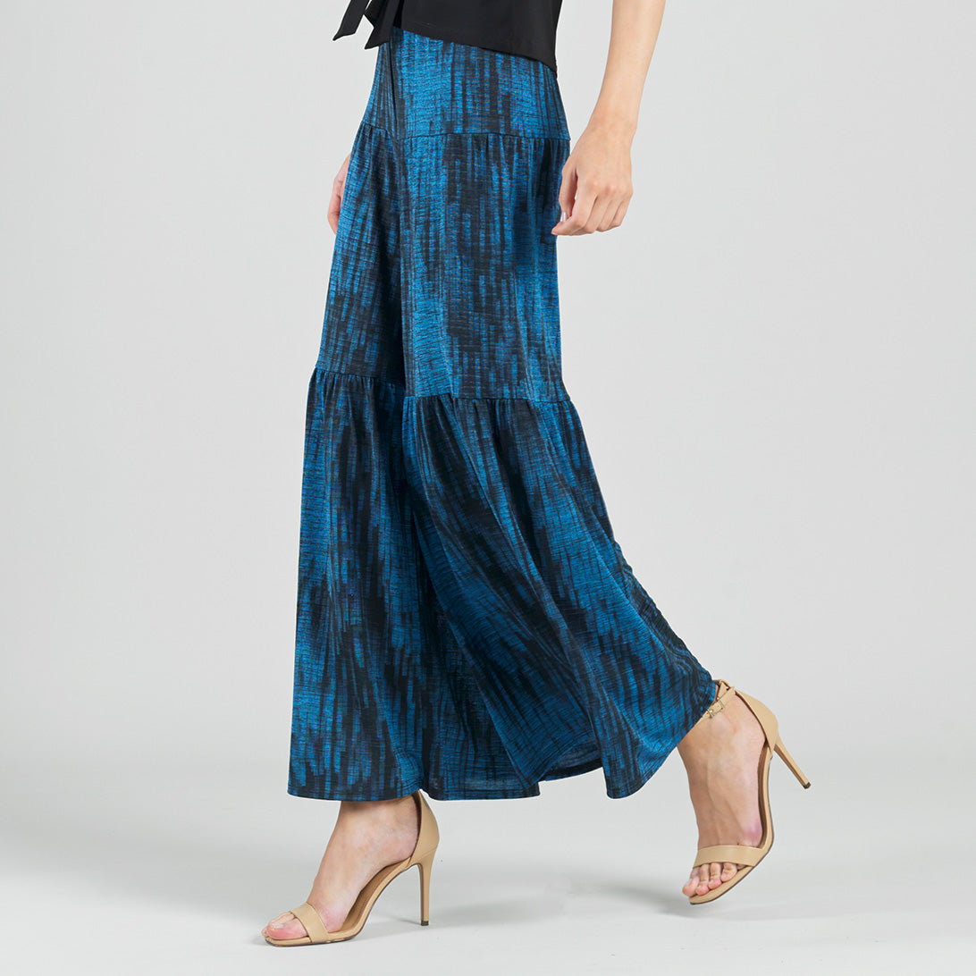 Your fashion tide is sure to rise, wearing our Water Ripple Crinkle Pleat Tiered Skirt-Pant! This one-of-a-kind style features a 1.5” pull-on elastic waistband, an ultra wide-leg silhouette that visually looks like a skirt, and provides beautiful, fluid movement with double-tier details which create a gorgeous drape that naturally flows against the body. **cardigan & tank twinset sold separately An abstract print that displays a mesmerizing pattern reminiscent of the subtle movement of tranquil water drops, comprised of shades of cobalt blue and black. A new, high-quality fabric inspired by crinkle-pleat fibers. Designed with a distinct texture thanks to its lusciously soft ridges. It is durable, retains its shape, and creates a beautiful drape with a luxurious finish, and pleasant breathability.Carefree Travel Fabric – Soft Crinkle Pleat Knit Our signature poly-spandex blend fabric provides a finish that is rich in texture while being soft, providing lightweight stretch, and is breathable with quick-drying properties. This delicate fabric offers refined durability with crinkled dimension for visual interest. Perfect for warm or transitional weather, you can pack it up and go with ease! 1.5″ Elastic Waistband 20″ Leg Hemline Wrinkle Free Travel Friendly Durable and Lightweight Soft Crinkle-Texture