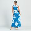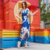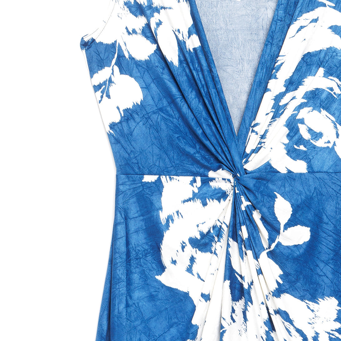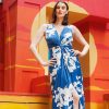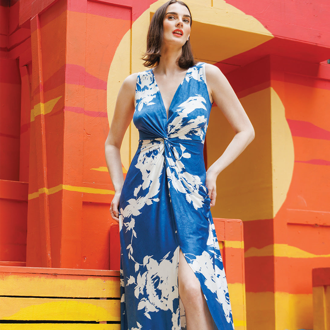 Our Dreamy Floral Crushed Silk Center Slit Maxi Dress is what sweet dreams are made of! This stunning sleeveless dress features a deep v-neckline, wide shoulder coverage, and a knotted twist bodice detail, that accentuates the waist while creating a flattering draped silhouette, with a 24″ front center slit and flowing maxi hemline. A beautiful feminine print, featuring white, large-scale flower heads, with soft petal stems, displayed against a silky sapphire blue background. ♥ Each piece is a unique, one-of-a-kind print and print placement will vary. A new, luxuriously romantic fabric, inspired by delicate dupioni-silk fibers. Designed with a distinct, soft crushed texture, that gives off a sheen-like radiance, while being cool and smooth to the touch. Carefree Travel Fabric – Crushed-Silk Knit Our signature soft stretch poly blend mimics the texture of crushed silk, providing a lightweight and breathable fabric with easy care and quick-drying properties. This fabric is more breathable and cool to the touch compared to linen and cotton, perfect for warm-weather clothing. Pack it up and go with ease!Wrinkle Free Travel Friendly Ultra Lightweight Soft Knit Fabric Crushed Silky Texture 24″ Center Front Slit