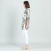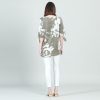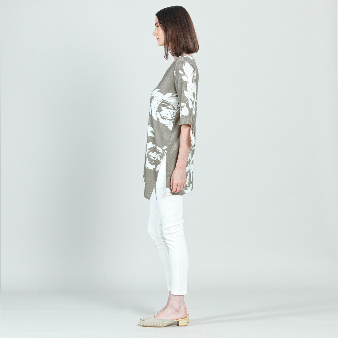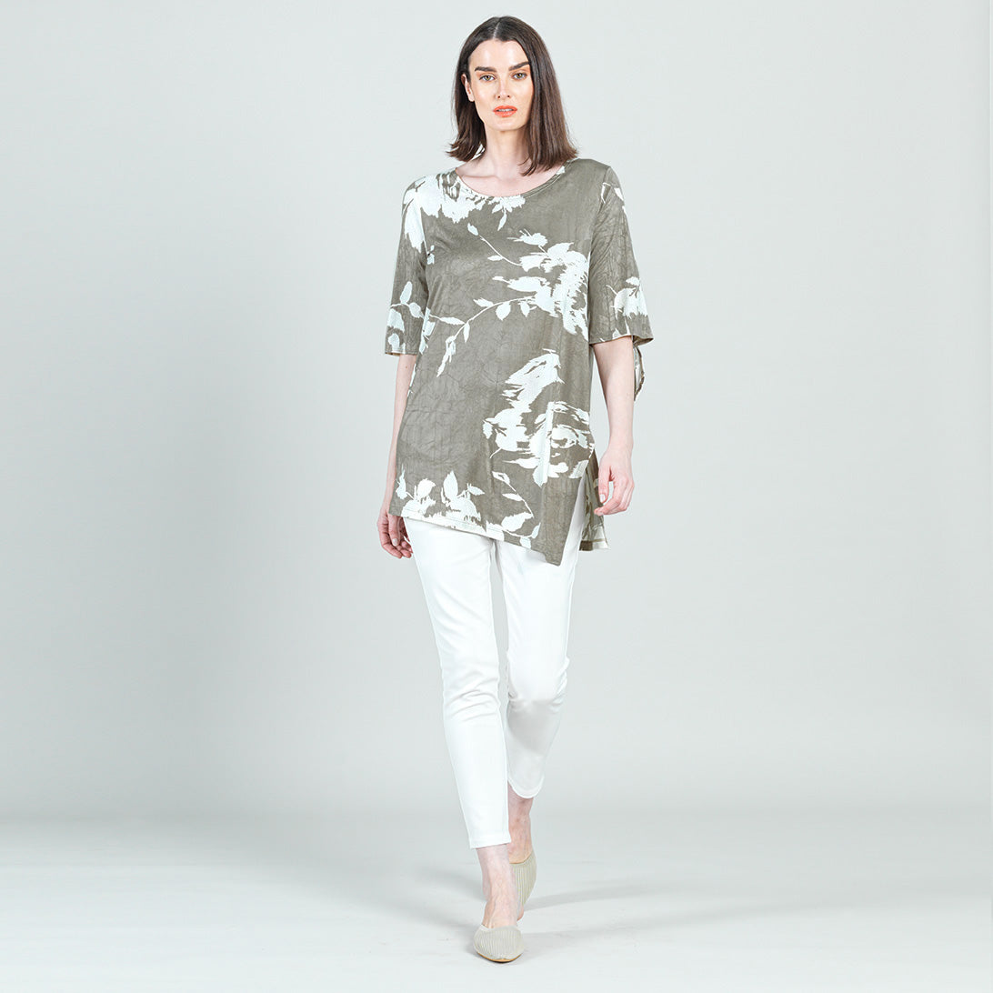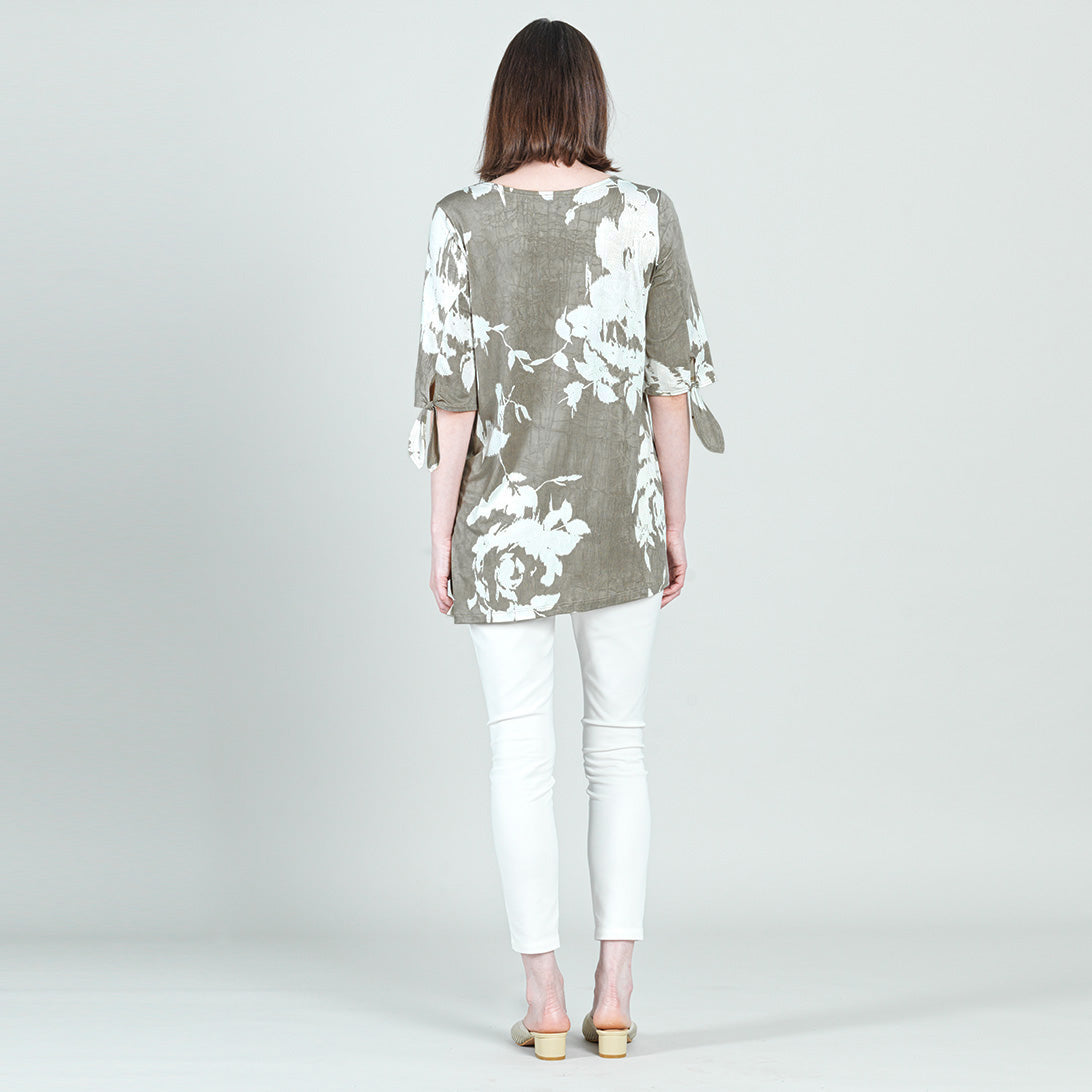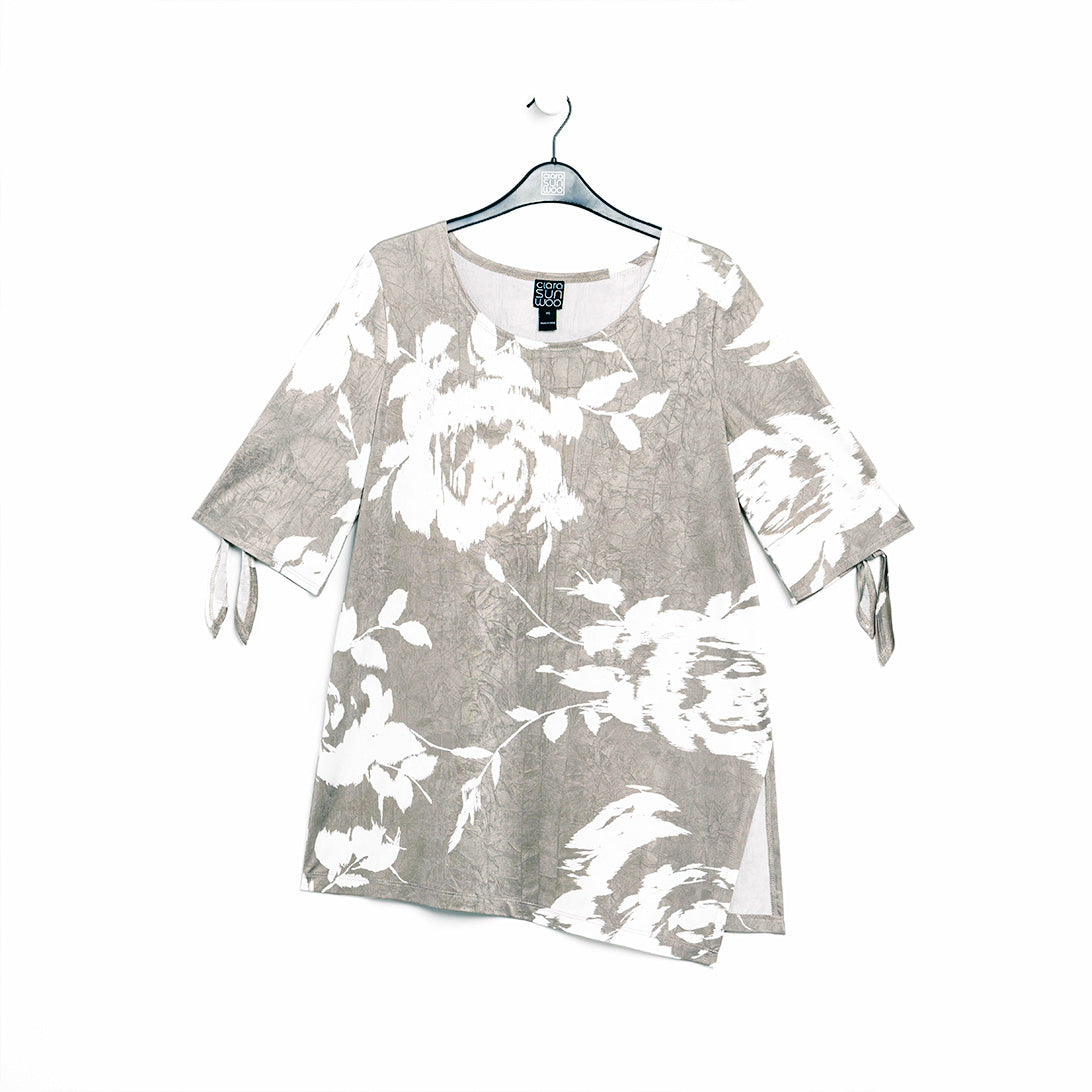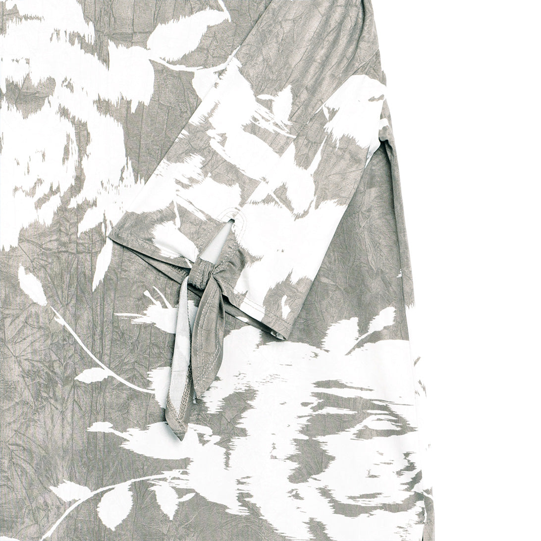 Our Dreamy Floral Crushed Silk Tie Cuff Asymmetrical Vent Tunic is what sweet dreams are made of! This style features a scoop neckline, elbow-length sleeves with tie-able cuffs, and an asymmetrical hemline with a left-side vent. A beautiful feminine print, featuring white, large-scale flower heads, with soft petal stems, displayed against a silky stone-taupe background. ♥ Each piece is a unique, one-of-a-kind print and print placement will vary. A new, luxuriously romantic fabric, inspired by delicate dupioni-silk fibers. Designed with a distinct, soft crushed texture, that gives off a sheen-like radiance, while being cool and smooth to the touch. Carefree Travel Fabric – Crushed-Silk Knit Our signature soft stretch poly blend mimics the texture of crushed silk, providing a lightweight and breathable fabric with easy care and quick-drying properties. This fabric is more breathable and cool to the touch compared to linen and cotton, perfect for warm-weather clothing. Pack it up and go with ease!Wrinkle Free Travel Friendly Ultra Lightweight Soft Knit Fabric Crushed Silky Texture