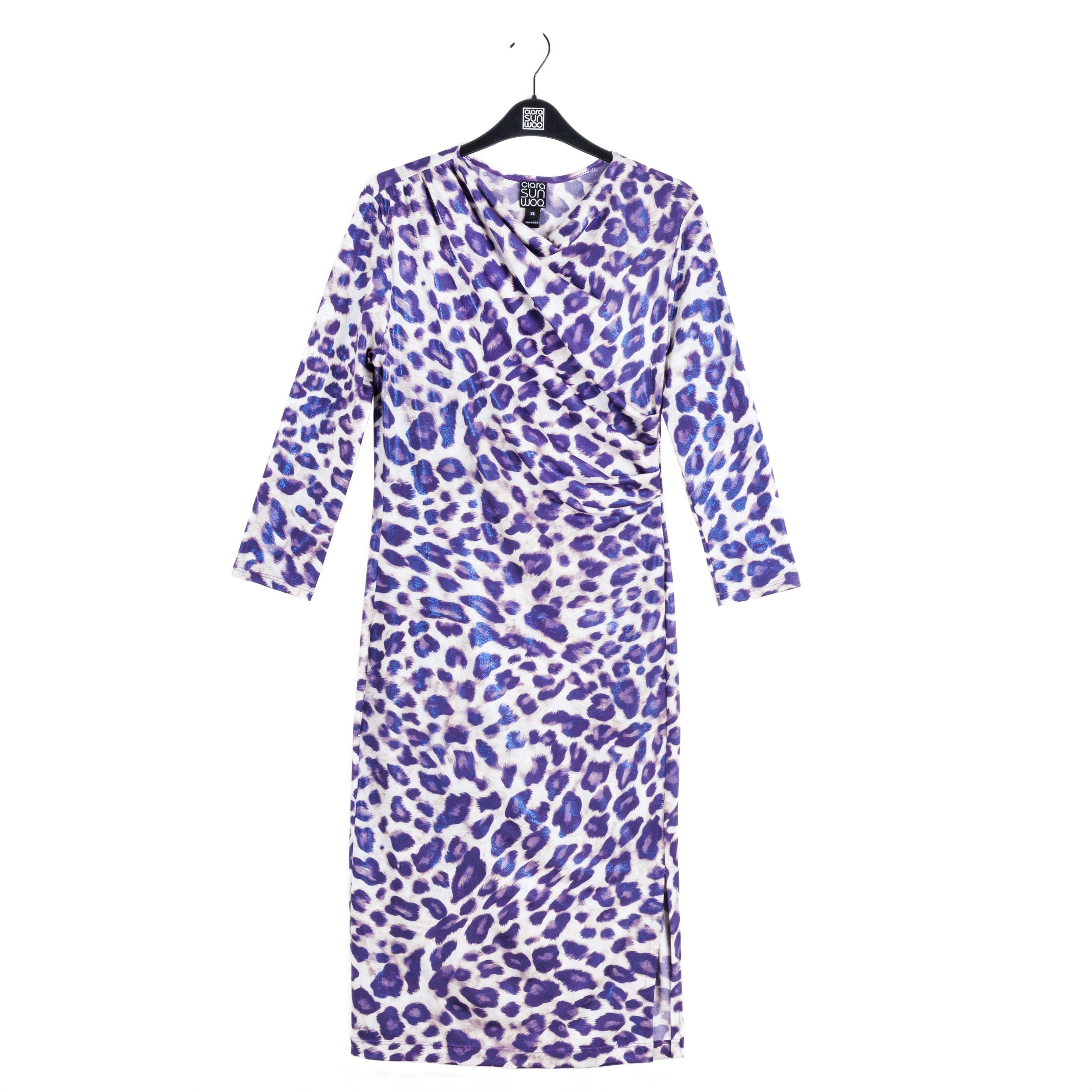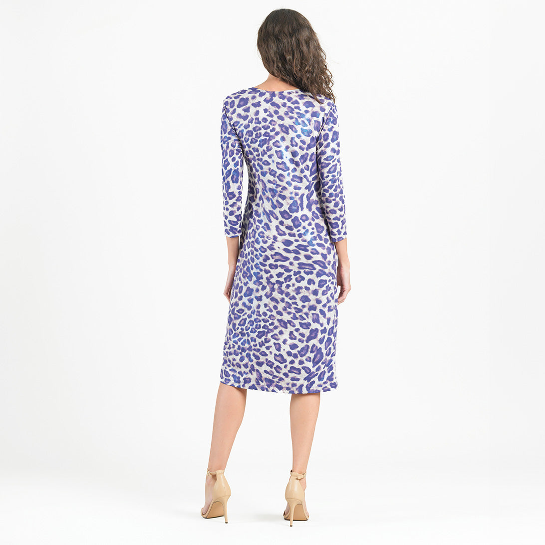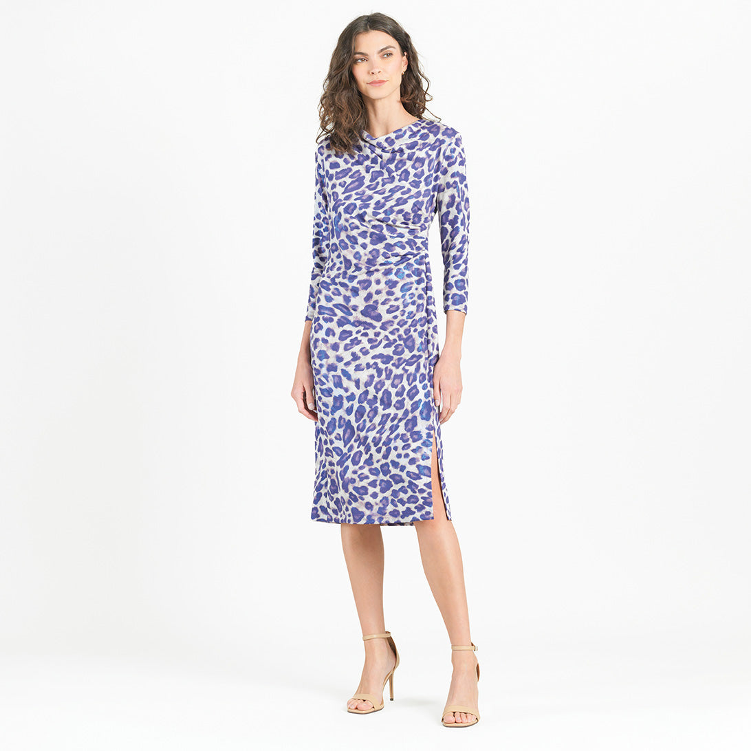 Get spotted for all the right reasons in our Plum Cheetah Side Slit 3/4 Sleeve Midi Dress! This stunning dress features a high draped neckline, 3/4 sleeves, a ruched side bodice that creates a flattering draped silhouette, and a 10″ left side slit with a midi hemline. An exquisite print, featuring cheetah spots in a pale plum with subtle undertones of taupe and ivory, encompassed by an iridescent, foil-like finish, in shimmery purple/blue hues. ♥ Each piece is a unique, one-of-a-kind print and print placement will vary. A luxuriously unique fabric, that is inspired by iridescent fibers which add a bit of sheen and luster to the finish. Designed to hold its shape with a firmer knit, while being cool and smooth to the touch. Carefree Travel Fabric – Soft Silky Foil Knit Our signature poly blend fibers offer luxurious softness with lightweight, wrinkle-free comfort. This easy-care fabric is quick drying and cooler than linen or cotton, making it perfect for on-the-go wear. Wrinkle Free Travel Friendly Ultra Lightweight Soft Knit Fabric Breathable Jersey-Like Feel 10″ Side Left Slit Sheen and Lustrous Finish