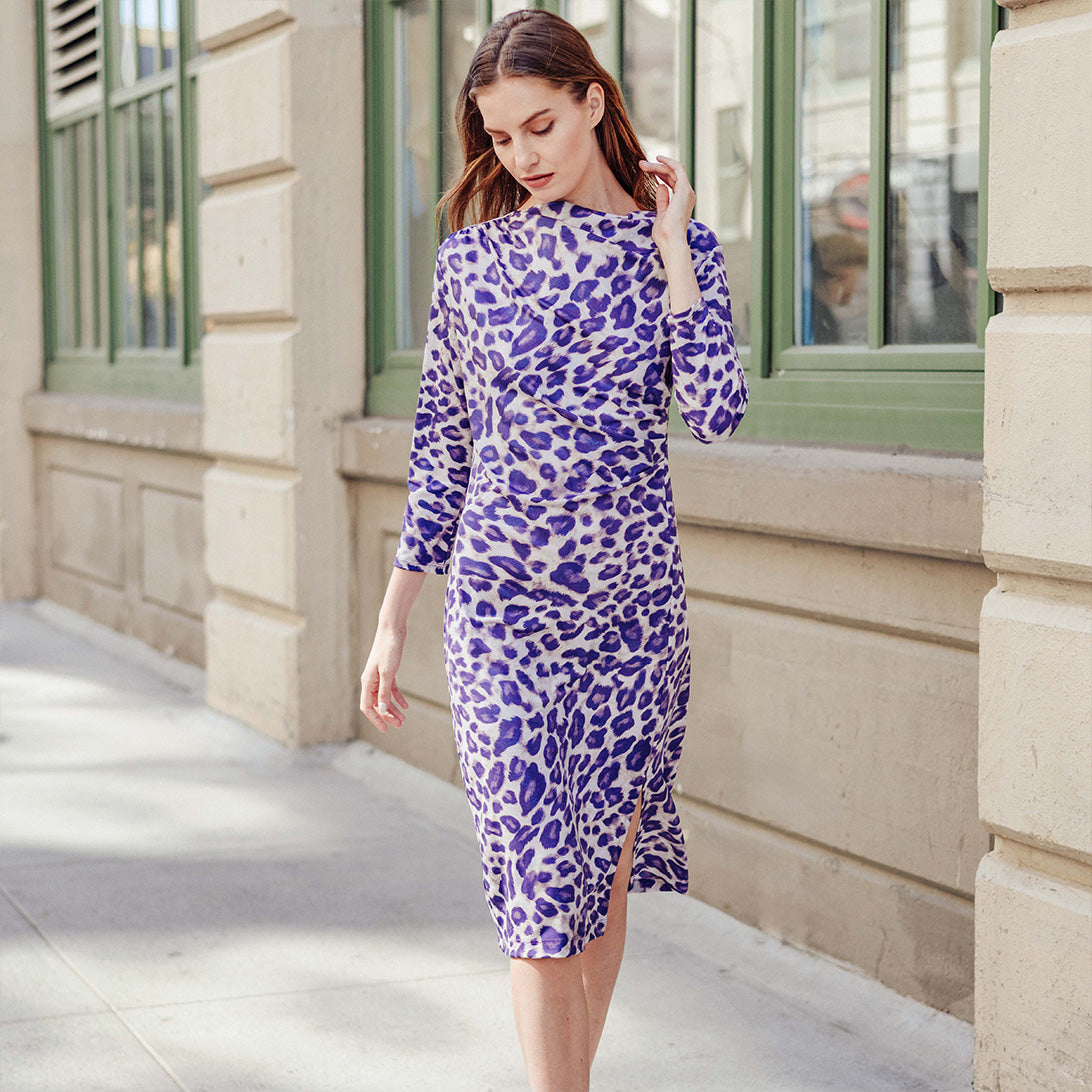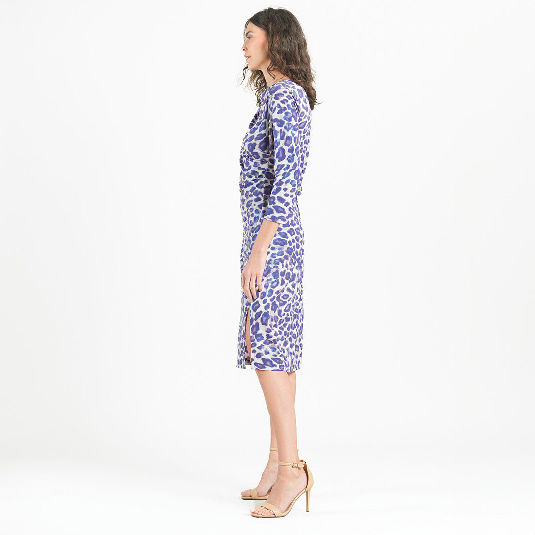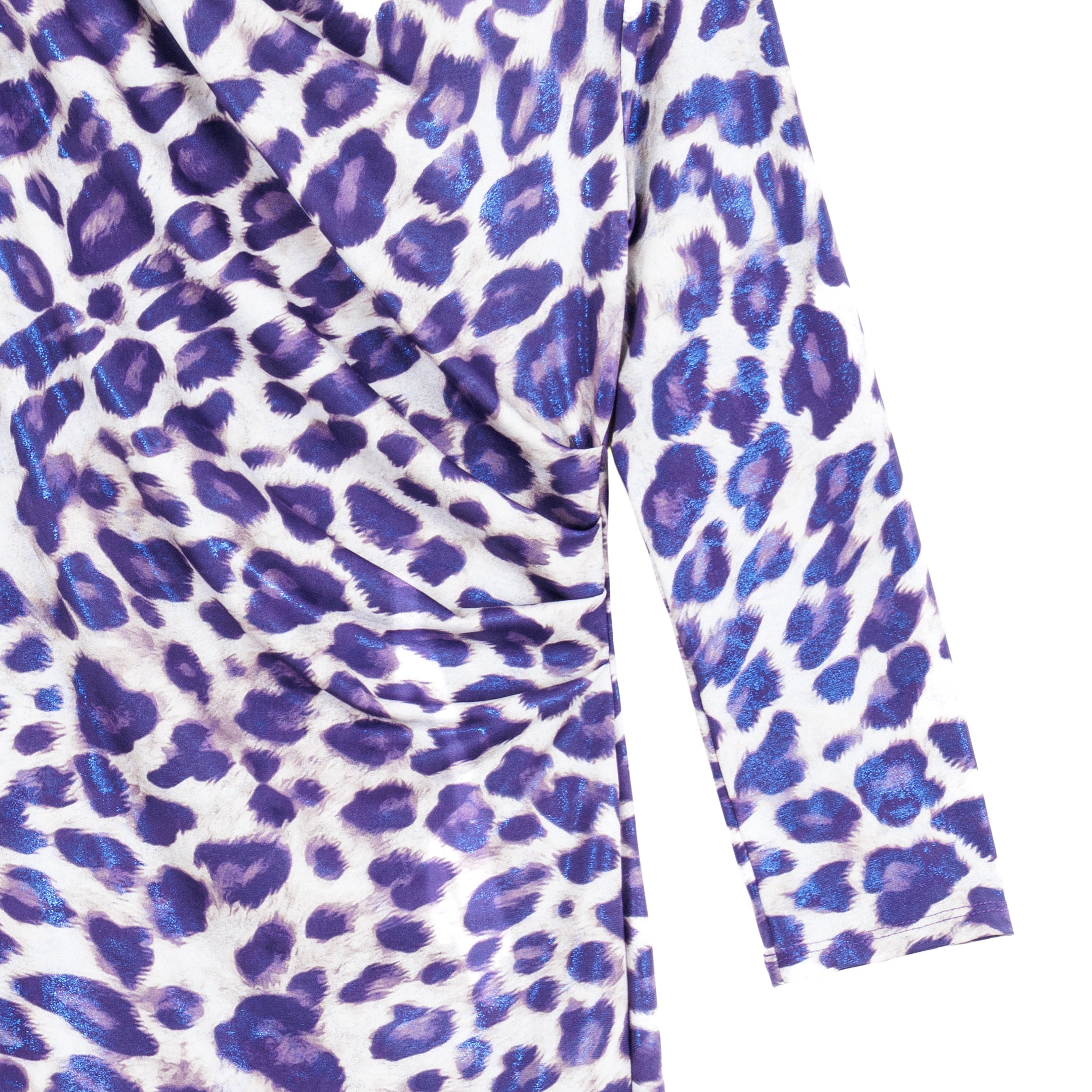 Get spotted for all the right reasons in our Plum Cheetah Side Slit 3/4 Sleeve Midi Dress! This stunning dress features a high draped neckline, 3/4 sleeves, a ruched side bodice that creates a flattering draped silhouette, and a 10″ left side slit with a midi hemline. An exquisite print, featuring cheetah spots in a pale plum with subtle undertones of taupe and ivory, encompassed by an iridescent, foil-like finish, in shimmery purple/blue hues. ♥ Each piece is a unique, one-of-a-kind print and print placement will vary. A luxuriously unique fabric, that is inspired by iridescent fibers which add a bit of sheen and luster to the finish. Designed to hold its shape with a firmer knit, while being cool and smooth to the touch. Carefree Travel Fabric – Soft Silky Foil Knit Our signature poly blend fibers offer luxurious softness with lightweight, wrinkle-free comfort. This easy-care fabric is quick drying and cooler than linen or cotton, making it perfect for on-the-go wear. Wrinkle Free Travel Friendly Ultra Lightweight Soft Knit Fabric Breathable Jersey-Like Feel 10″ Side Left Slit Sheen and Lustrous Finish