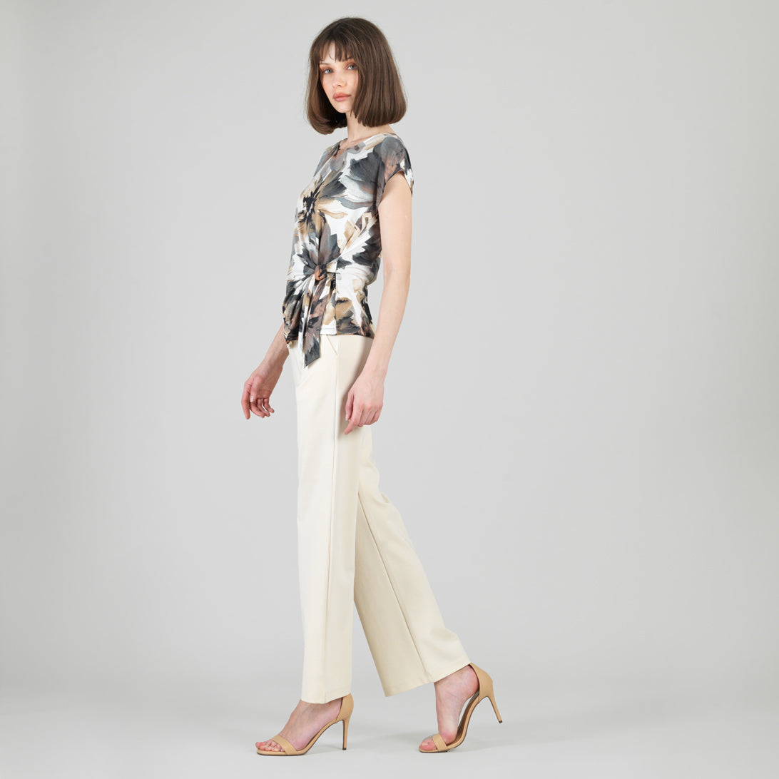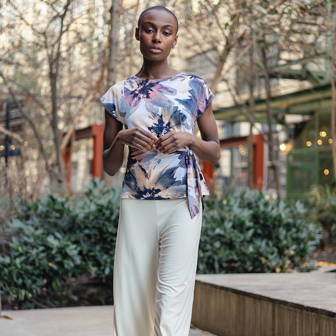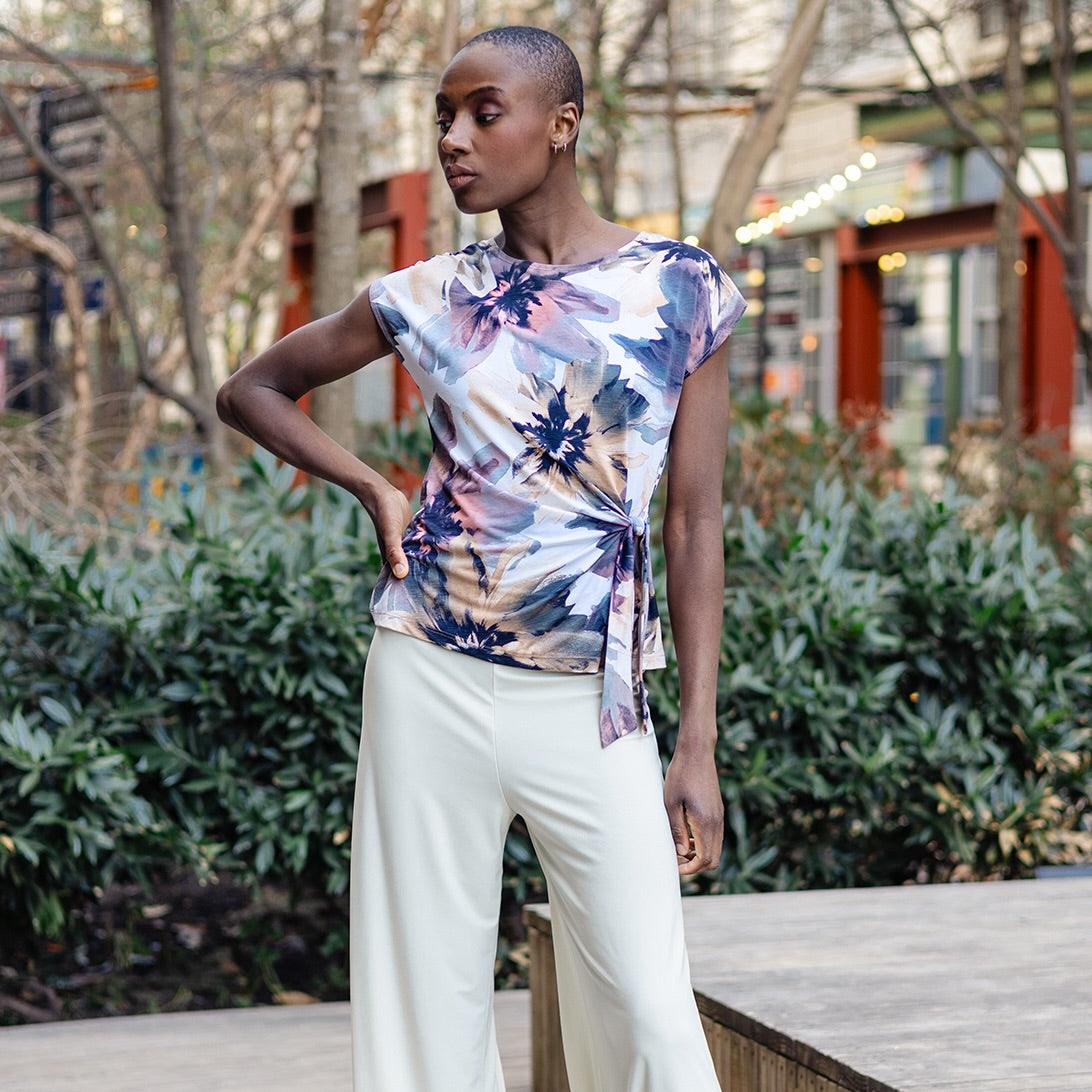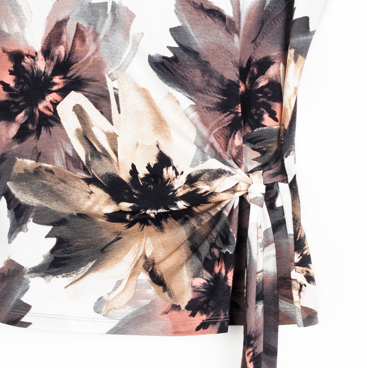 Whisper sweet somethings to your wardrobe in our Petal Whisper Gauze Knit Slant Sleeve Side Tie Top! This style features a scoop neckline, short slanted sleeves, a side tie detail that allows you to create a silhouette to your liking, and a straight hemline. A dreamy print comprised of a floral motif in beautiful earthy tones of muted mauve, rust, greys and taupes, black and ivory created by layered brush strokes giving off an artistic feel. ♥ Each piece is a unique, one-of-a-kind print and print placement will vary. A lightweight, breathable fabric with an airy, grainy-textured surface. Designed with a slightly open loose weave and a translucent finish. It has soft stretch and flexibility, allowing it to drape beautifully. Carefree Travel Fabric – Soft Gauze Textured Knit Our poly blend fabric is airy and translucent. It has a breathable, open, loose weave with a soft grainy texture for an organic, lived-in feel, and a natural drape giving it a relaxed, effortless look. It is quick-drying and cooler than linen or cotton, making it perfect for on-the-go wear.Wrinkle Free Travel Friendly Ultra-Lightweight, Thin Translucent Fabric Breathable, Loose, Open Weave Texture