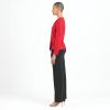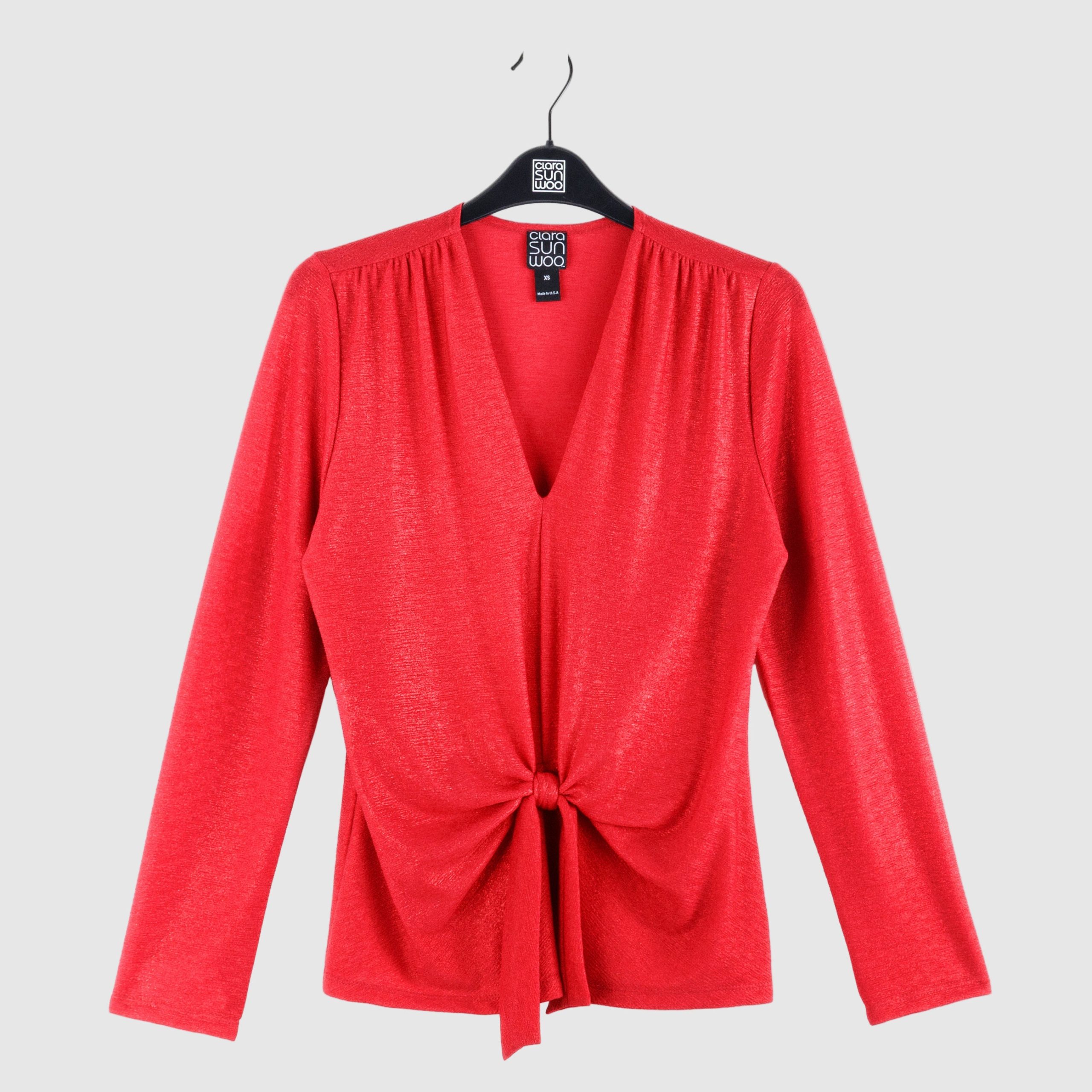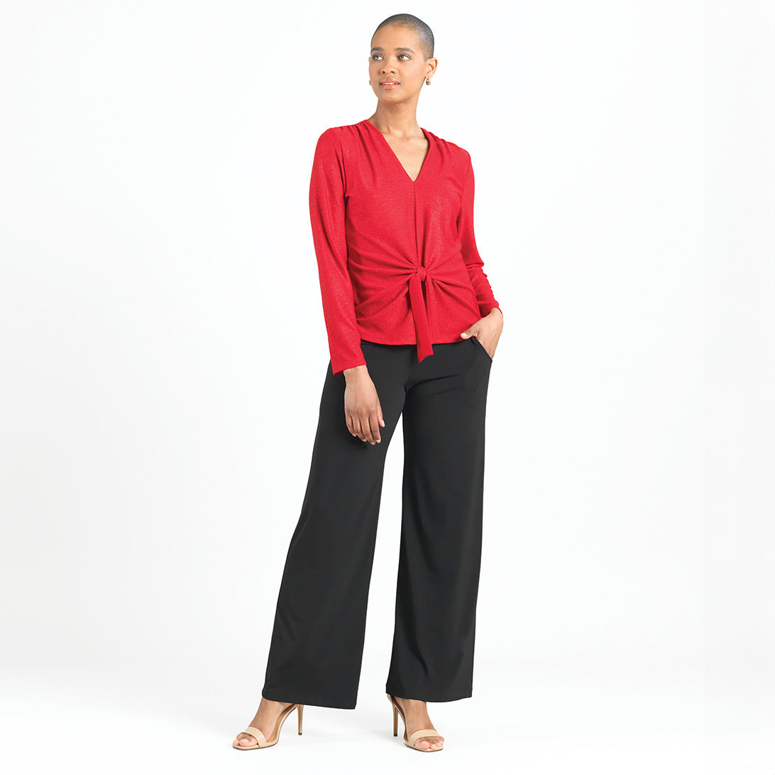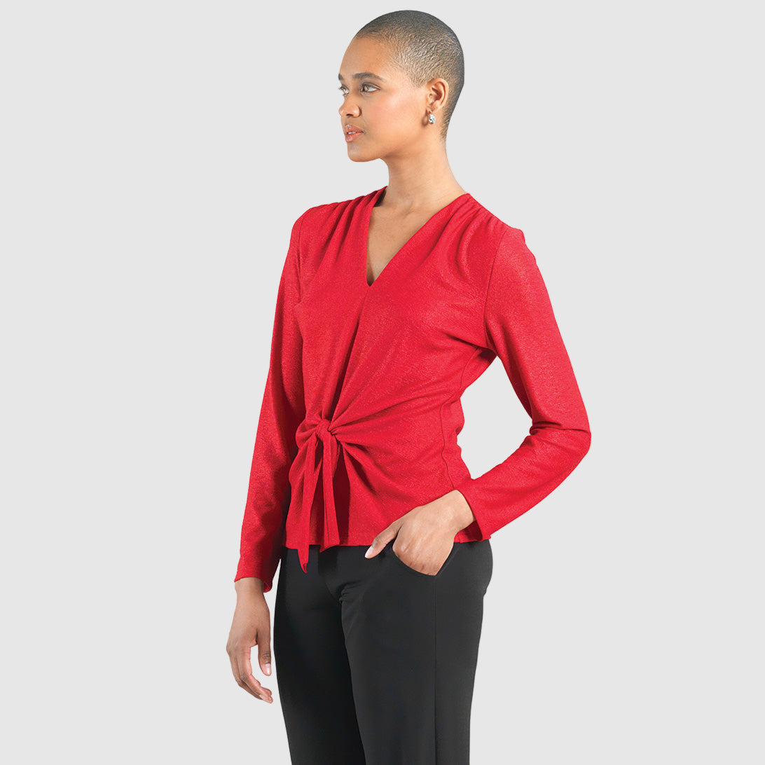 Having a style that allows you to shine in any room is the hope, and our Glimmer Speck V-Neck Center Front Tie Top does just that! This flattering sleeveless top features a classic v-neckline, pleated shoulder seam, a vertical neck-to-hem center seam, and a front-center waist tie that creates a beautiful draped effect that accentuates your natural figure. Our Red glimmer speck is a vivid scarlet red shade with sheen copper undertones. A new iridescent fabric, inspired by opulent Lurex fibers. Crafted with a radiant tinsel-like texture that creates an alluring sparkle with a multi-dimensional textile and sophisticated sheen. Designed with an overall richness and luxurious feel, that offers lightweight stretch, flexibility, and optimal balance. Carefree Travel Fabric – Glimmer Speck High-quality polyester and spandex blend fibers offer luxurious texture with lightweight, wrinkle-free comfort. A fabric elevated by tinsel-like particles and a radiant sheen. This easy-care fabric is quick drying and cooler than linen or cotton, making it perfect for on-the-go wear. Wrinkle Free Travel Friendly Sheen Radiance Tinsel-Speck Texture