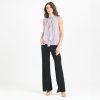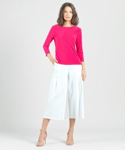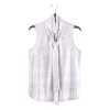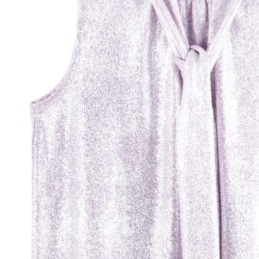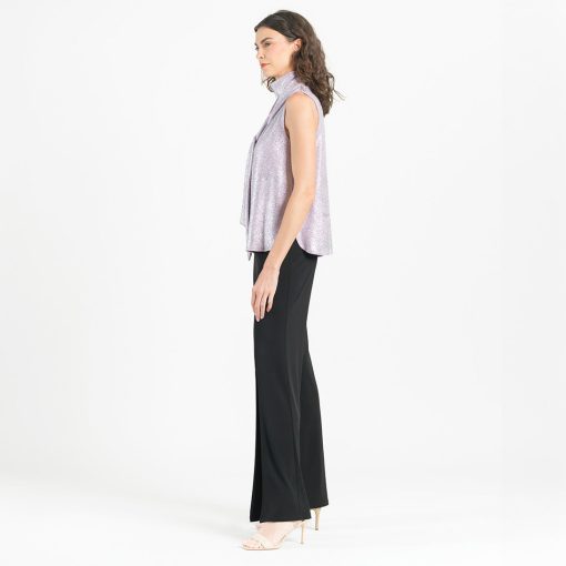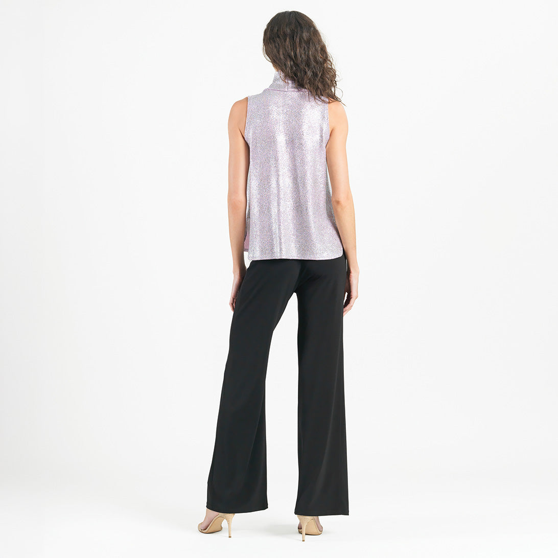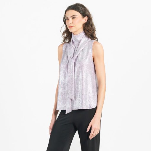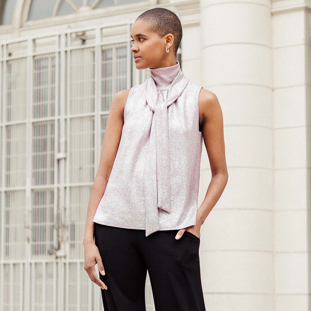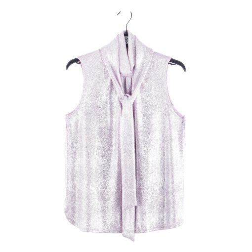 Don’t walk, run into a fashion wonderland wearing our Glitter Foil Mock Neck-Tie Detail Top! This sleeveless, bra-friendly style features a charming mock neck-tie detail that can be styled multiple ways, and feminine micro-pleats that begin at the neck and transition to a soft-draped body, with a 3″ side-vented scallop hemline. Our Pink glitter foil is a light carnation pink shade with pearlescent silver undertones. A new enchanting fabric, inspired by glam rock refinement. An illuminating, holographic foil texture that creates a rich textile, and exudes opulent shine. Infused with fine glitter particles for an extra layer of dimension and designed with superb stretch, strength and flexibility that maintains its integrity, radiant sheen, and translucent finish. **Please Note: Due to the textured nature of this fabric, we suggest refraining from pairing this item with delicate materials to avoid the risk of pilling. Carefree Travel Fabric – Nylon-Metallic Knit w/ Glitter Foil Texture High-quality nylon-metallic blend fibers offer luxurious texture with lightweight, wrinkle-free comfort. A fabric elevated by a metallic appearance and infused glitter particles. This easy-care fabric is quick drying and cooler than linen or cotton, making it perfect for on-the-go wear. Wrinkle Free Travel FriendlyLight-Mid-Weight FabricTranslucent, Breathable Nylon BaseGlitter Infused-Foil Texture