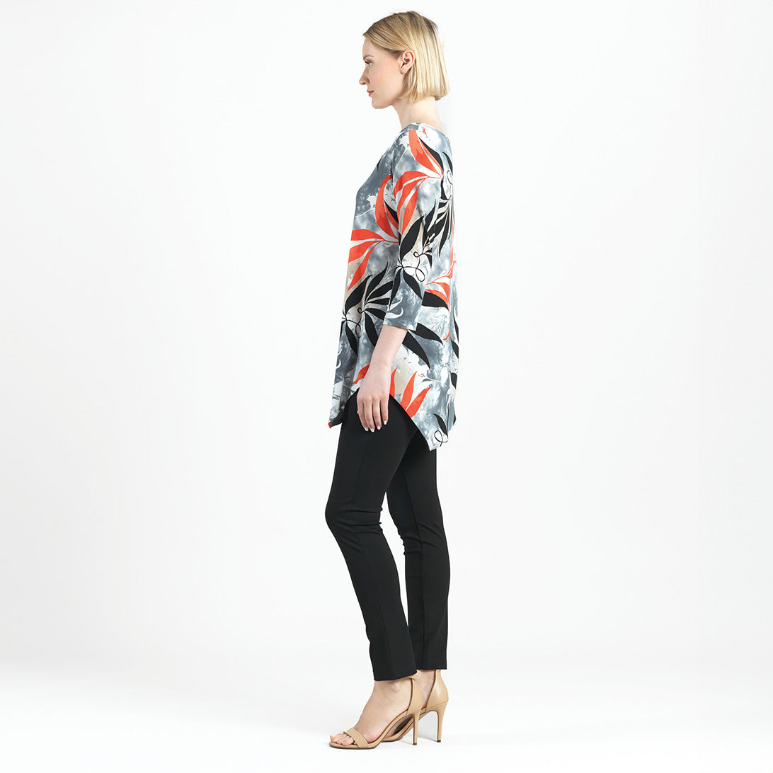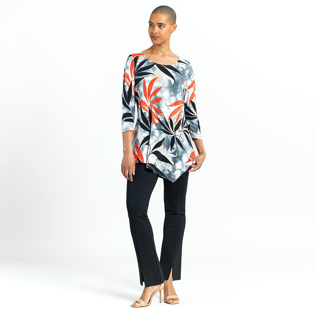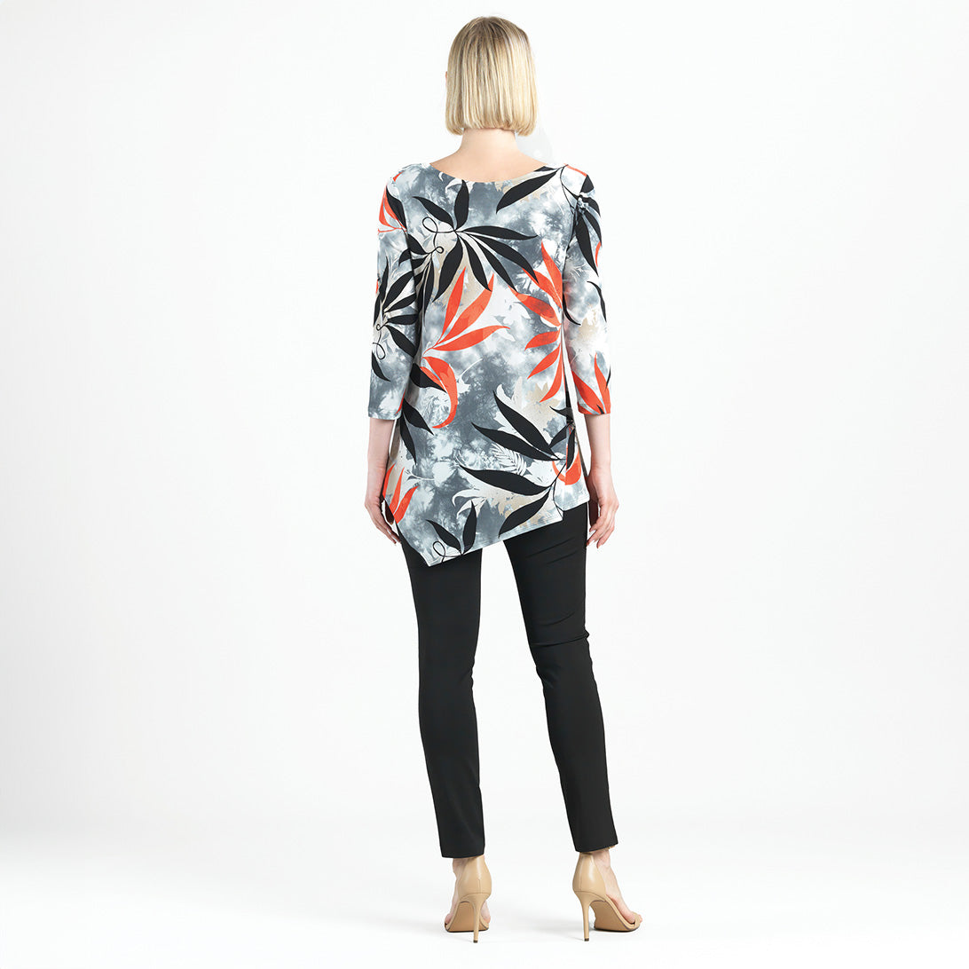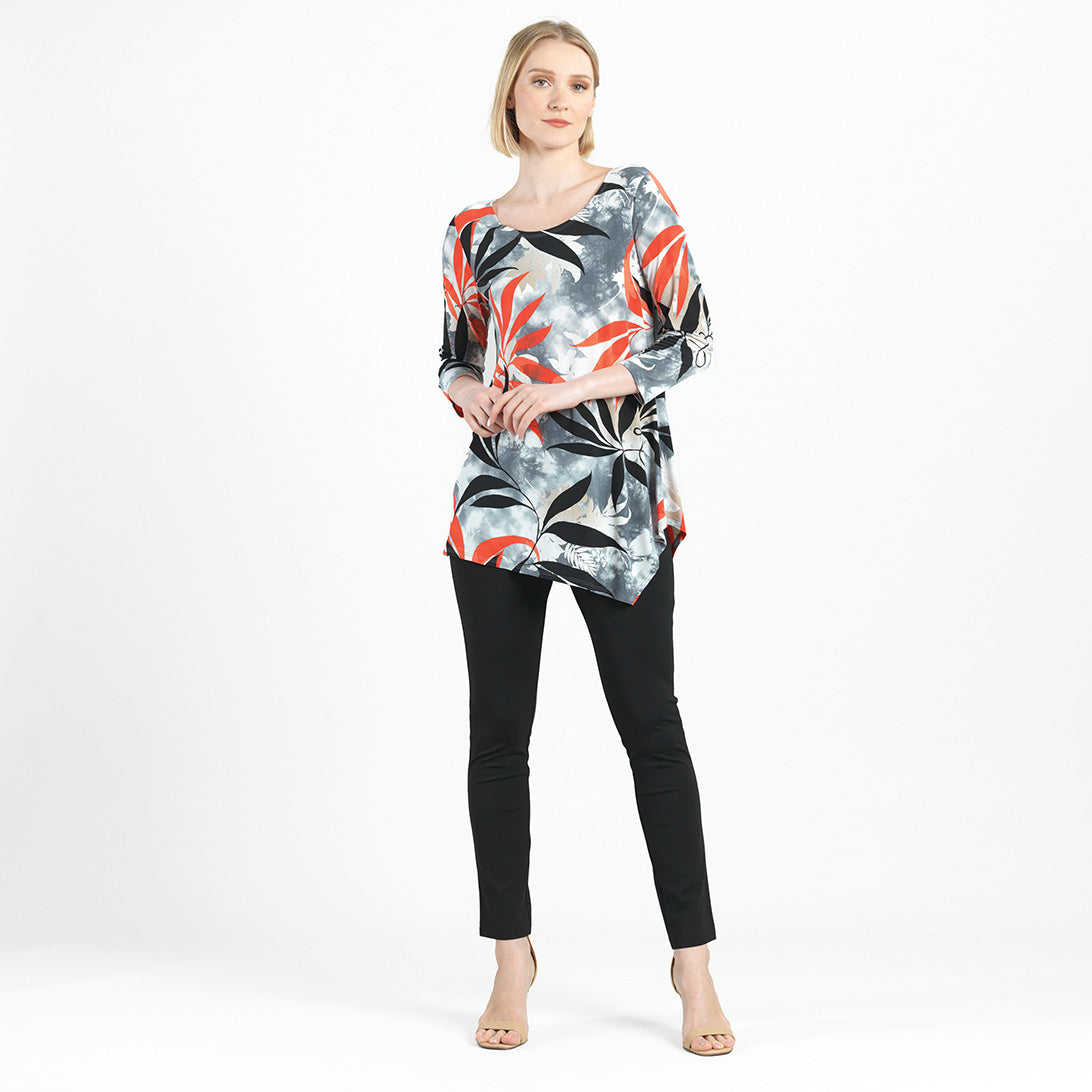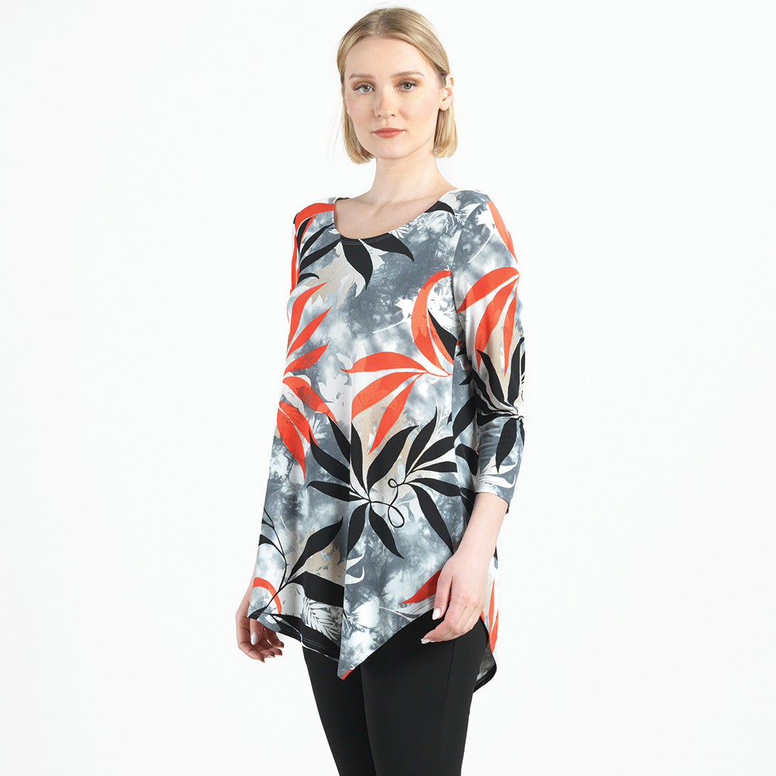 Add our Leaf Scatter Kerchief Angle Hem Tunic to your closet and watch your wardrobe bloom with style! This tunic features a scoop neckline, 3/4 length sleeves, and a kerchief-angled hemline that creates a modern, asymmetrical silhouette. A take-notice print, in bold leaf shapes of black and coral-red, encompassed by shades of beige-taupe and white, underlaid by a cool-grey cloud print effect with subtle hints of pale pink. ♥ Each piece is a unique, one-of-a-kind print and print placement will vary, Carefree Travel Fabric – Soft Silky Knit Our signature poly blend fibers offer luxurious softness with lightweight, wrinkle-free comfort. This easy-care fabric is quick drying and cooler than linen or cotton, making it perfect for on-the-go wear.Wrinkle Free Travel Friendly Ultra Lightweight Soft Knit Fabric Breathable Jersey-Like Feel