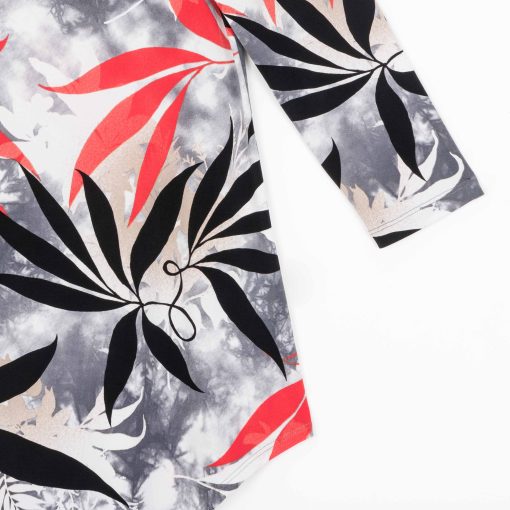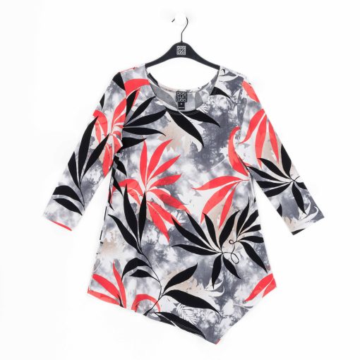 Add our Leaf Scatter Kerchief Angle Hem Tunic to your closet and watch your wardrobe bloom with style! This tunic features a scoop neckline, 3/4 length sleeves, and a kerchief-angled hemline that creates a modern, asymmetrical silhouette. A take-notice print, in bold leaf shapes of black and coral-red, encompassed by shades of beige-taupe and white, underlaid by a cool-grey cloud print effect with subtle hints of pale pink. ♥ Each piece is a unique, one-of-a-kind print and print placement will vary, Carefree Travel Fabric – Soft Silky Knit Our signature poly blend fibers offer luxurious softness with lightweight, wrinkle-free comfort. This easy-care fabric is quick drying and cooler than linen or cotton, making it perfect for on-the-go wear.Wrinkle Free Travel Friendly Ultra Lightweight Soft Knit Fabric Breathable Jersey-Like Feel