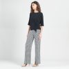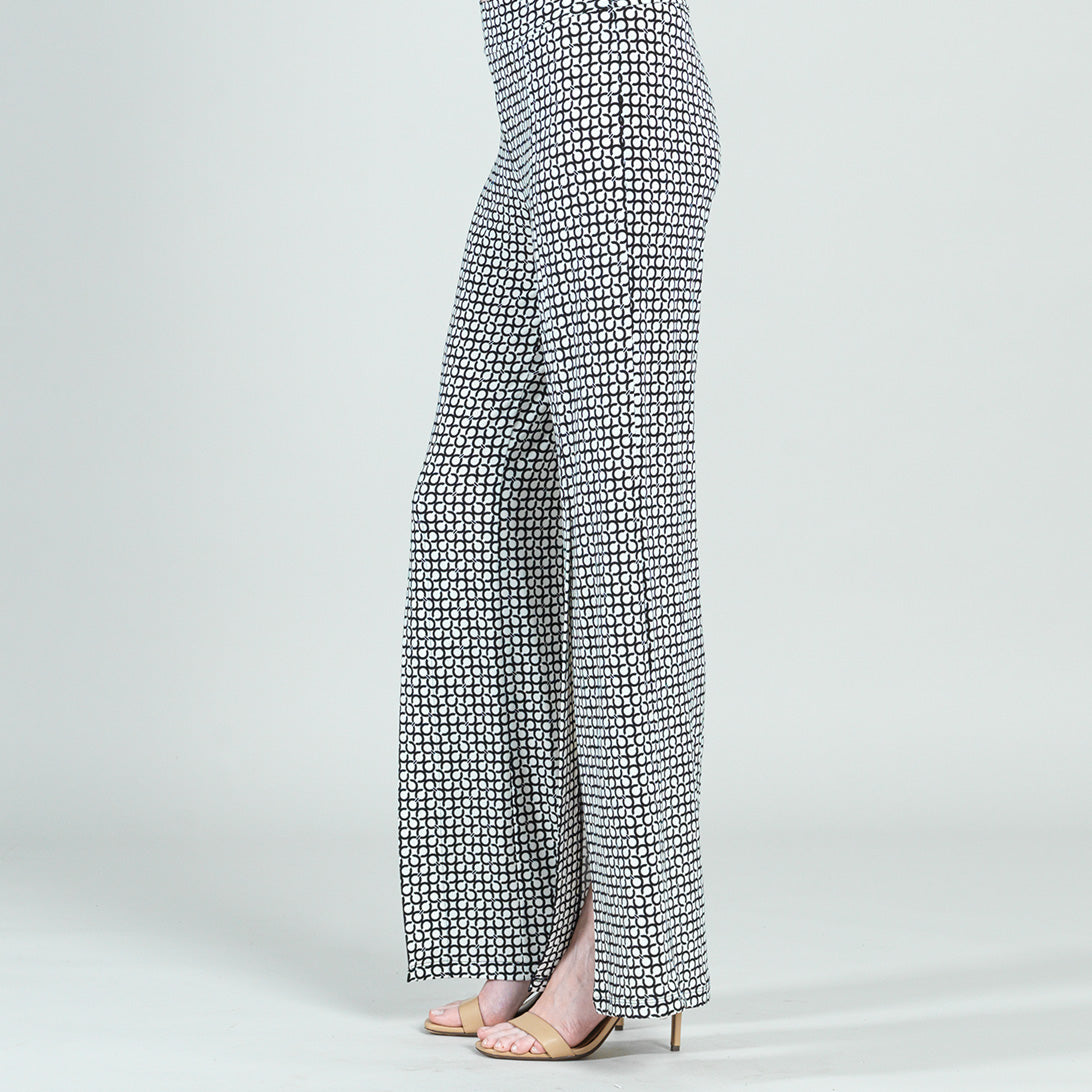 Our Chain Ring Kick Front High Slit Pant is definitely the missing link to updating your wardrobe! This pant features a 2” pull-on soft waistband with flared hem and a sleek 20″ front leg slit with center seam detail. Made to provide a slimming silhouette in the hip and thigh area while gradually flaring towards the hem. A graphic ivory and black pattern, displaying a cluster of mini chainrings. ♥ Each piece is a unique, one-of-a-kind print and print placement will vary. Carefree Travel Fabric – Soft Silky Knit Our signature poly blend fibers offer luxurious softness with lightweight, wrinkle-free comfort. This easy-care fabric is quick drying and cooler than linen or cotton, making it perfect for on-the-go wear.2″ Soft Waistband 20″ Front Slit Center Seam Detail Wrinkle Free Travel Friendly Ultra Lightweight Soft Knit Fabric Breathable Jersey-Like Feel