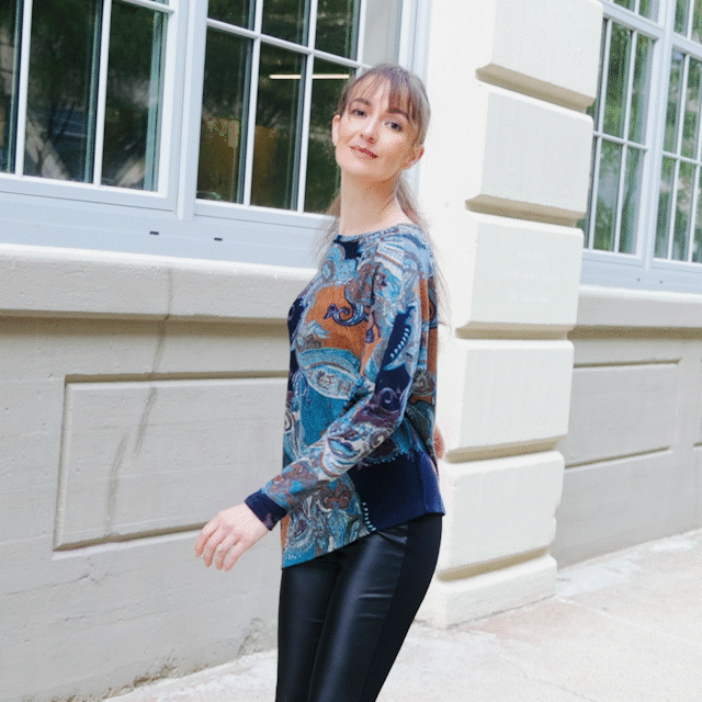 Our Paisley Lightweight Cozy Half & Half Sleeve Sweater Top is a new modern take on hippie chic! This sweater features a round neckline, left dolman sleeve, and fuller right batwing sleeve both in 3/4 length, with an angled hemline. Inspired by the vintage 70s, this paisley print consists of shades of tawny, navy, and turquoise, with subtle hints of white and maroon, making this item a real statement piece. ♥ Each piece is a unique, one-of-a-kind print and print placement will vary. Lightweight Cozy Sweater KnitOur cozy sweaters are designed for optimal comfort and convenience. Made from lightweight soft plush knit and Poly-Blend fibers, they are the perfect addition to any wardrobe. Ideal for layering and is travel-friendly but still breathable enough to keep you from getting too warm.Travel Friendly Lightweight Sweater Knit Soft Cozy Texture