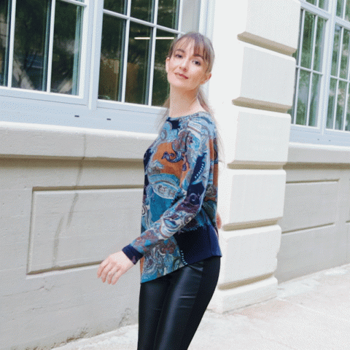 Our Paisley Lightweight Cozy Half & Half Sleeve Sweater Top is a new modern take on hippie chic! This sweater features a round neckline, left dolman sleeve, and fuller right batwing sleeve both in 3/4 length, with an angled hemline. Inspired by the vintage 70s, this paisley print consists of shades of tawny, navy, and turquoise, with subtle hints of white and maroon, making this item a real statement piece. ♥ Each piece is a unique, one-of-a-kind print and print placement will vary. Lightweight Cozy Sweater KnitOur cozy sweaters are designed for optimal comfort and convenience. Made from lightweight soft plush knit and Poly-Blend fibers, they are the perfect addition to any wardrobe. Ideal for layering and is travel-friendly but still breathable enough to keep you from getting too warm.Travel Friendly Lightweight Sweater Knit Soft Cozy Texture