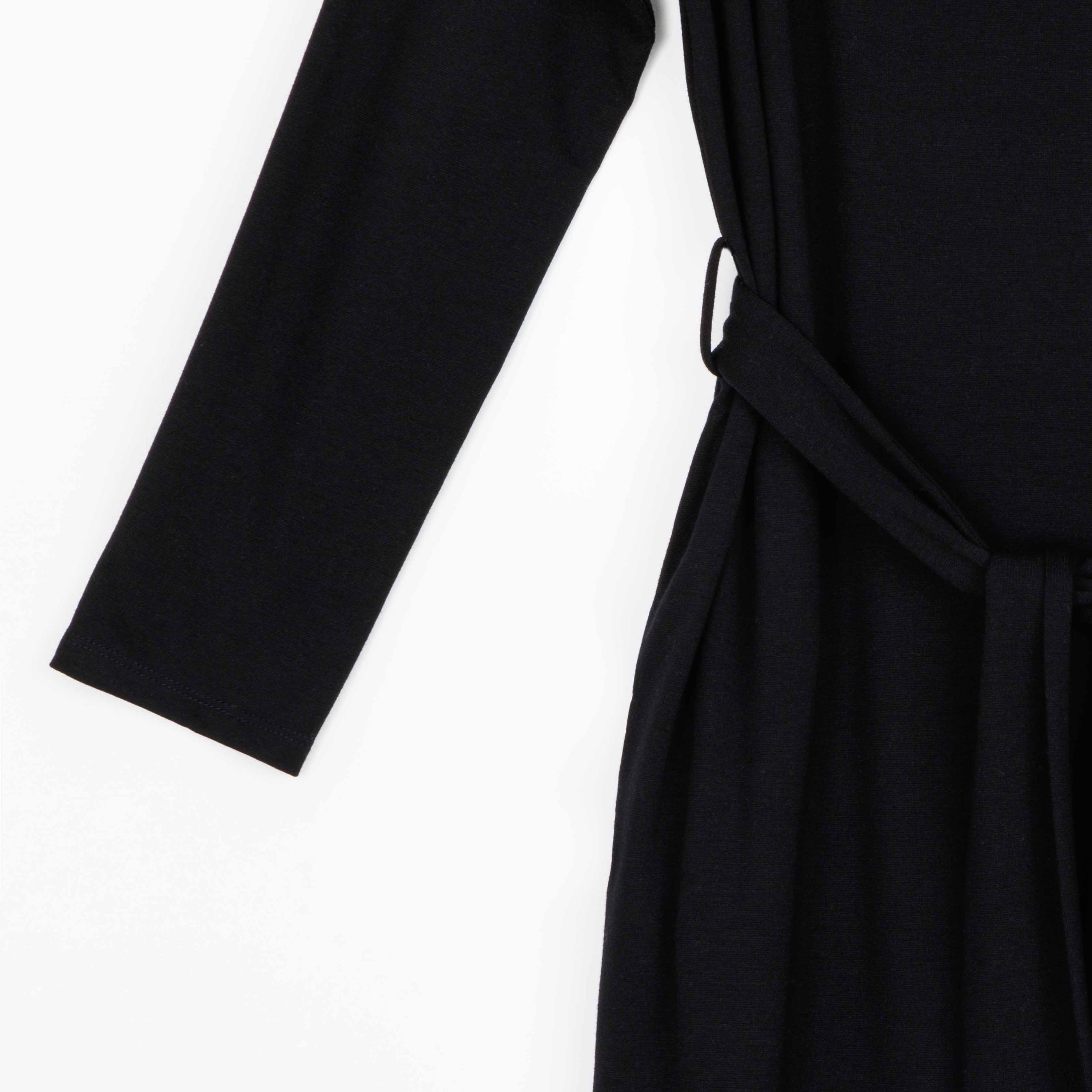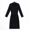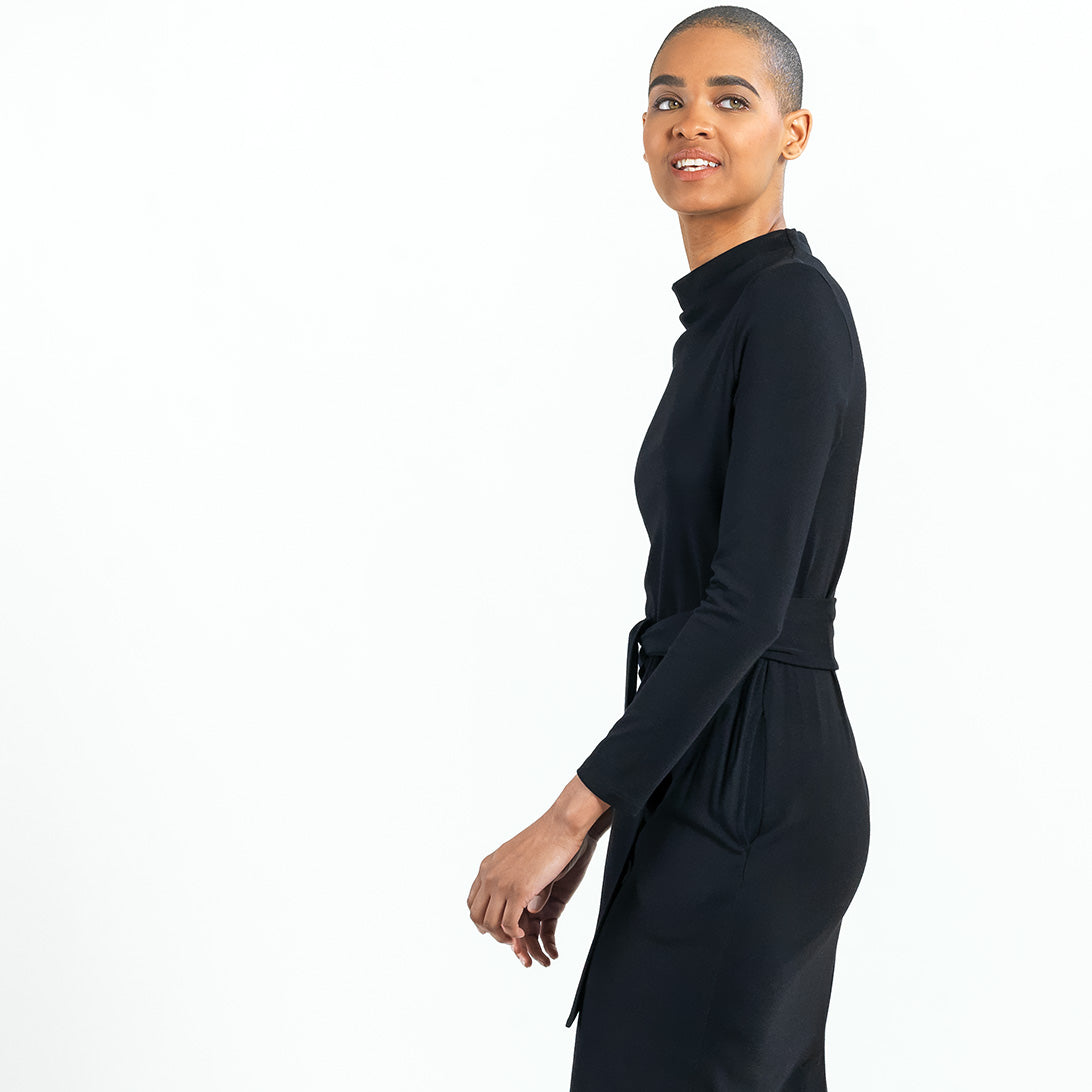 If you’re looking for that timeless dress that will last for years to come, then look no further than our Lightweight Ponte Tie Waist Pocket Midi Dress! This figure-flattering dress features a soft-draped funnel neckline, long sleeves, belt-loop tie waist, side pockets, a sheath midi hemline with a vertical back seam, and a 10″ back slit. Enjoy the same durable ponte fabric you know and love, only with a much softer, lightweight structure. Designed with less stiffness to create a finish that offers more free-flowing movement in the silhouette, while still retaining its shape and quality.Lightweight Ponte Knit Fabric Our Ponte Poly Blend Fabric is perfect for those seeking the ideal blend of stability and softness. Its thick double-knit composition provides superior shape retention and a luxurious matte finish, while the added thickness offers a premium feel. Enjoy a classic, polished look without sacrificing comfort. Soft, Structured Feel Thicker Than Jersey-Knit 10″ Back Hem Slit