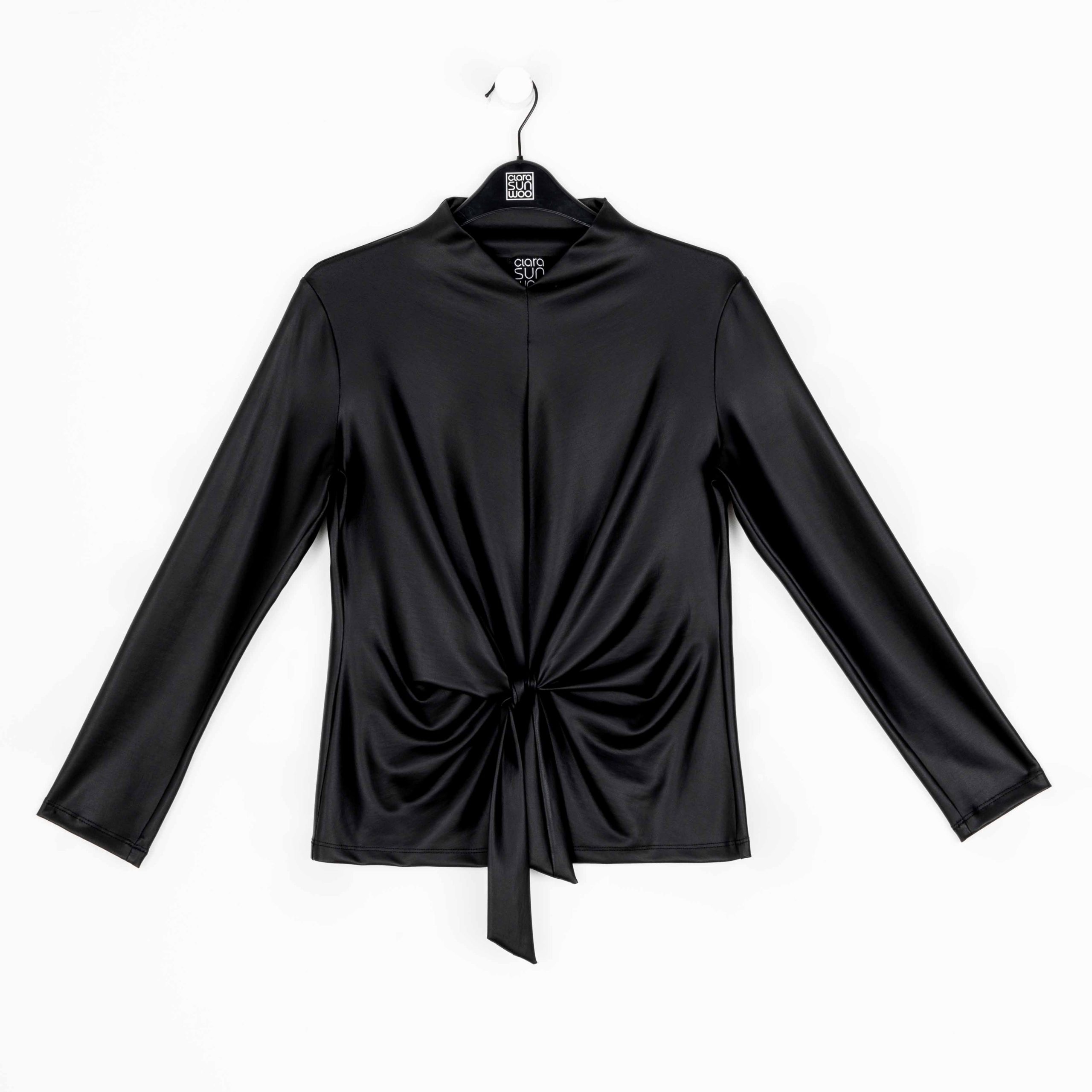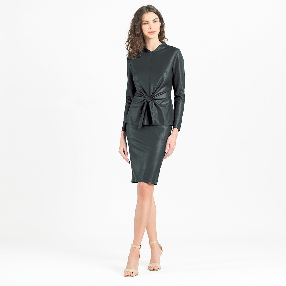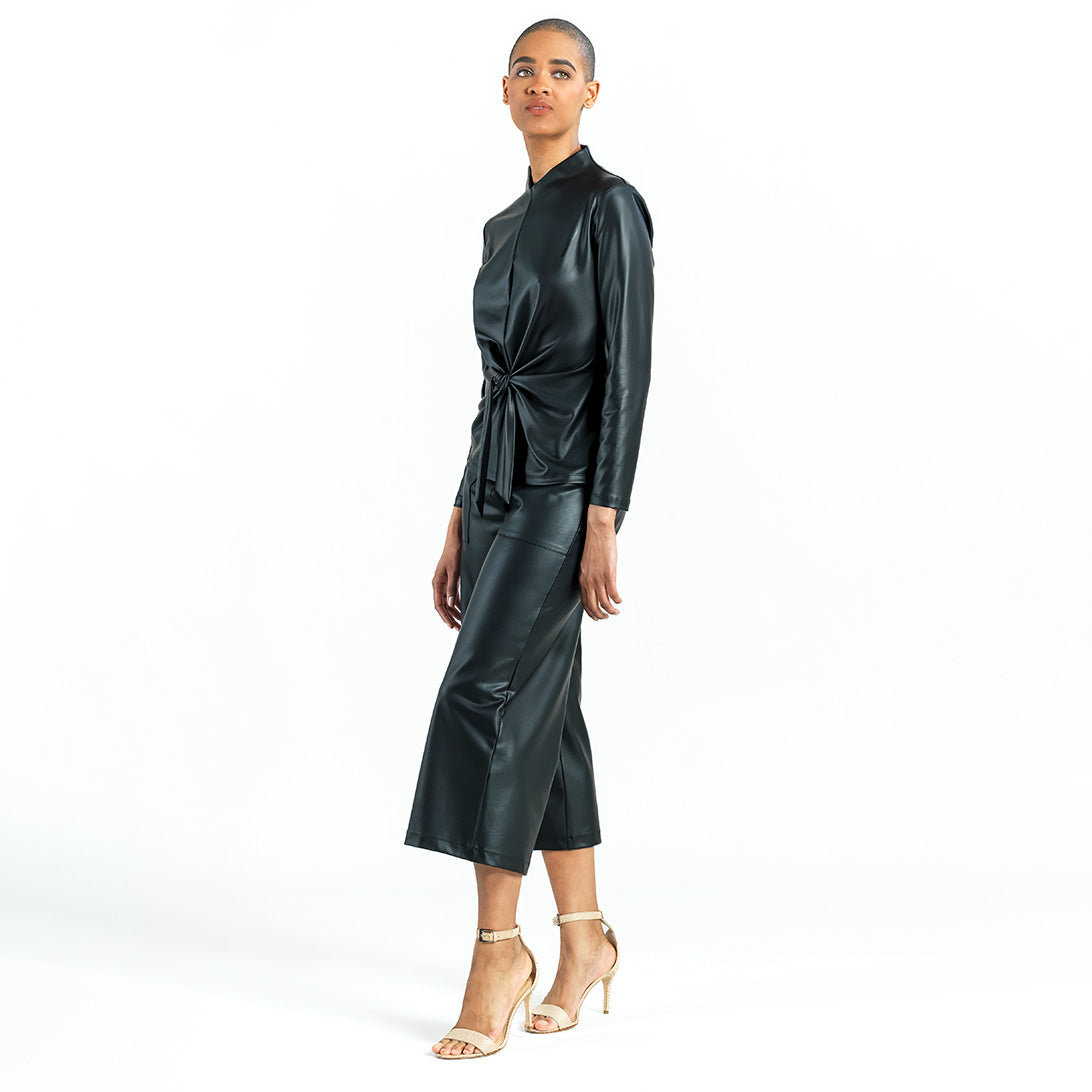 Our Liquid Leather Sheen Center Front Tie Top is in a class of its own! With a flattering shape and modernized edge, this top features a v-bottle neckline, a beautiful soft-sheen finish, a neck-to-hem seam, long sleeves, and a front-center waist tie that creates a beautiful draped effect that accentuates your natural figure.Liquid Leather KnitThis vegan-friendly fabric offers superior comfort and style. Crafted from our signature flexible polyester blend and coated in a faux leather-like soft sheen finish, it’s cool to the touch, quick-drying, and easy to maintain. Enjoy the look and feel of leather without the guilt. Ultra Lightweight Soft Knit Fabric – Faux Leather Soft-Sheen Finish Vegan Friendly!
