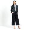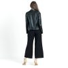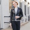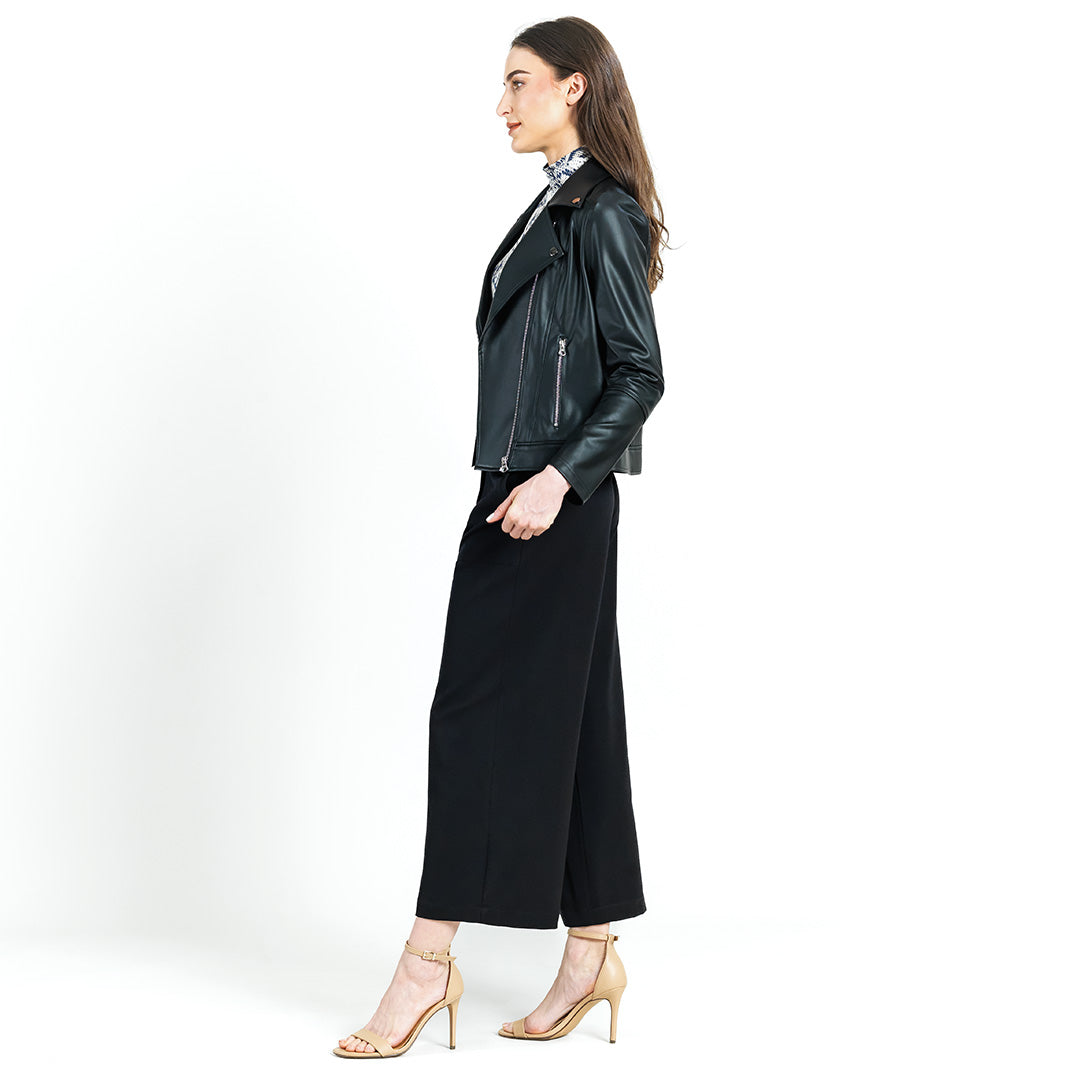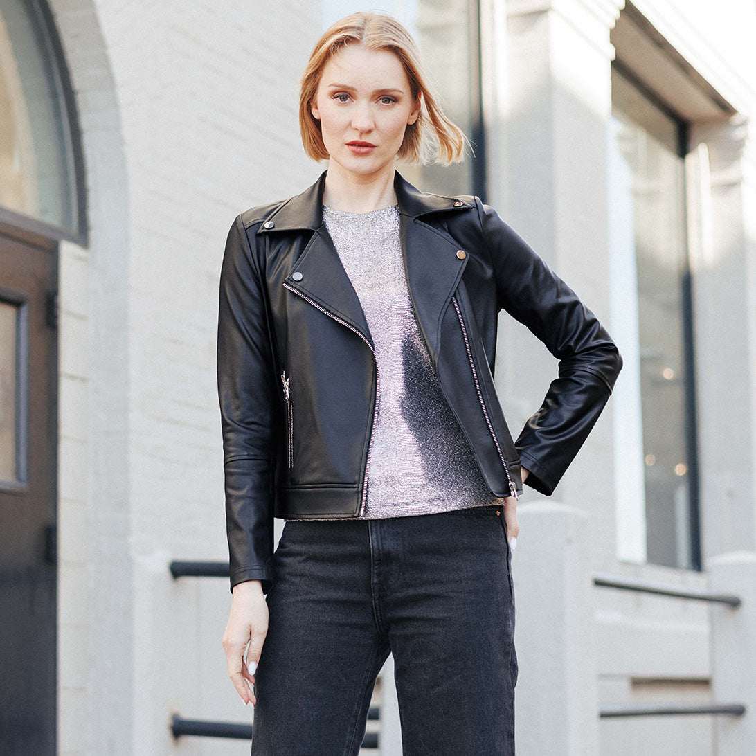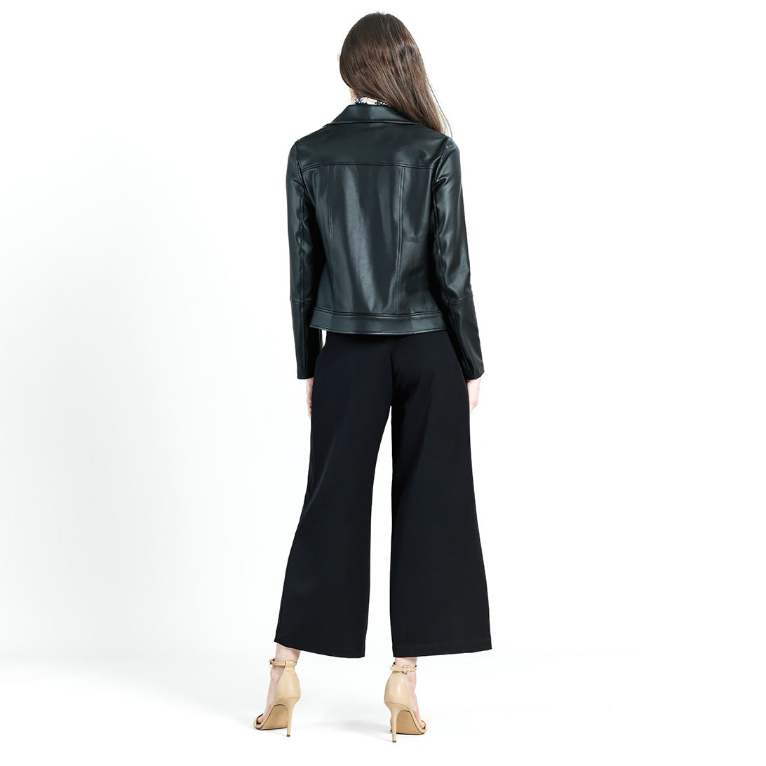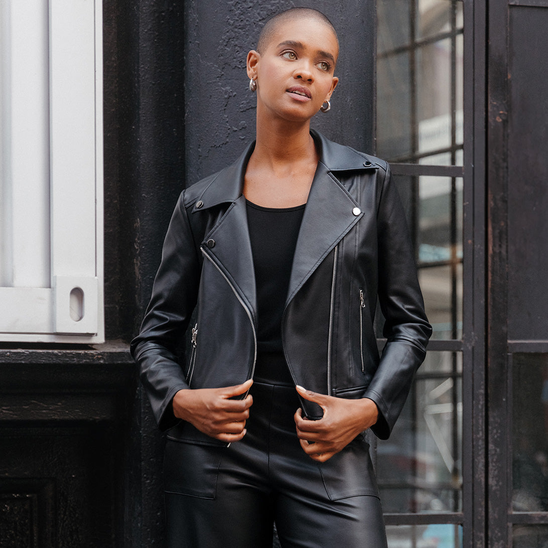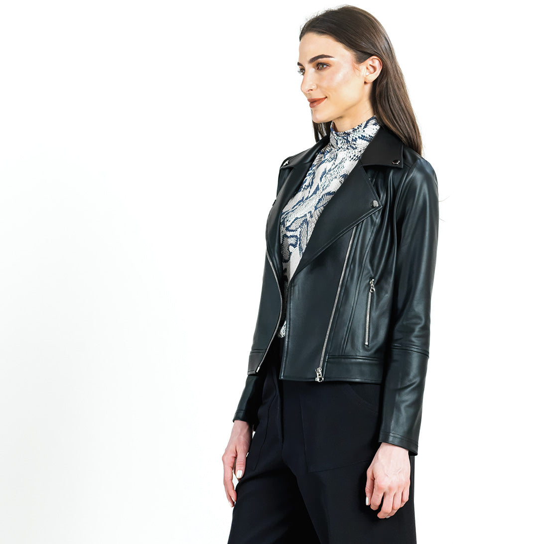 Take a ride and embrace your inner biker babe with our Liquid Leather Sheen Moto Zip Jacket! This contemporary jacket features a beautiful soft-sheen finish, a classic fold-over collar with a notched lapel and gunmetal snap corner details, silver-zipper asymmetrical body and side pocket closures with one faux pocket on the inner right side, long sleeves with 3/4 length cuff seams, back yoke and two vertical side back seams. A feminine take on men’s motorcycle jackets. Coated with extremely lightweight, vegan-friendly leather and an interior that is made from soft knit giving it the right amount of stretch with breathable superb wear that conforms to your body and provides you with the utmost comfort. Clara Sunwoo | Favorite Things from CS on Vimeo. Liquid Leather Sheen-Knit This vegan-friendly fabric offers superior comfort and style. Crafted from our signature flexible polyester blend and coated in a faux leather-like sheen finish, it’s cool to the touch, quick-drying, and easy to maintain. Enjoy the look and feel of leather without the guilt.Travel Friendly Ultra Lightweight Soft Knit Fabric – Faux LeatherSheen FinishVegan Friendly!