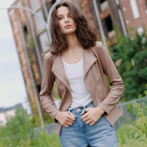 Let our faux Liquid Leather Signature Jacket pour all over you as it is made from our beautiful signature stretch knit, extremely lightweight soft “lambskin feel” fabric with a soft matte finish. This jacket features a notched lapel with an upright collar, long sleeves, a rustic gold a-symmetrical zip closure, faux pocket zipper slits as well as complimentary detailed front and backstitching.Our Taupe is a soft, cool sand shade with pinky-beige undertones. The interior is made from soft knit giving it the right amount of stretch with breathable superb wear that conforms to your body and provides you with a figure-flattering silhouette best of all it’s vegan-friendly! Clara Sunwoo | Favorite Things from CS on Vimeo.Liquid Leather KnitThis vegan-friendly fabric offers superior comfort and style. Crafted from our signature flexible polyester blend and coated in a faux leather-like matte finish, it’s cool to the touch, quick-drying, and easy to maintain. Enjoy the look and feel of leather without the guilt.Travel Friendly Ultra Lightweight Soft Knit Fabric – Faux Leather Matte Finish Vegan Friendly!