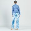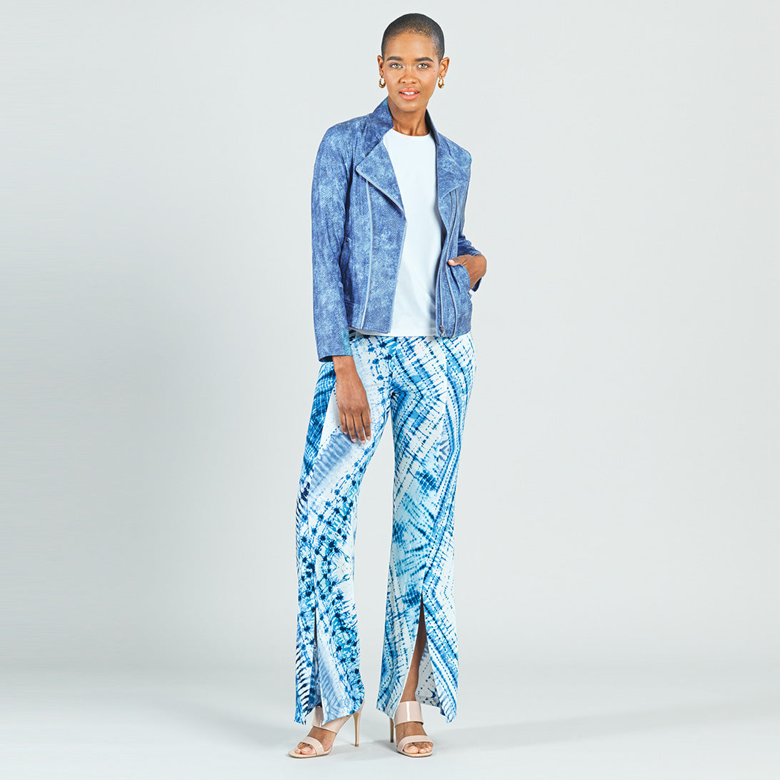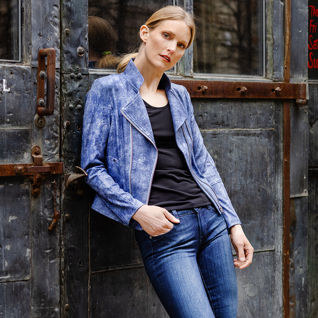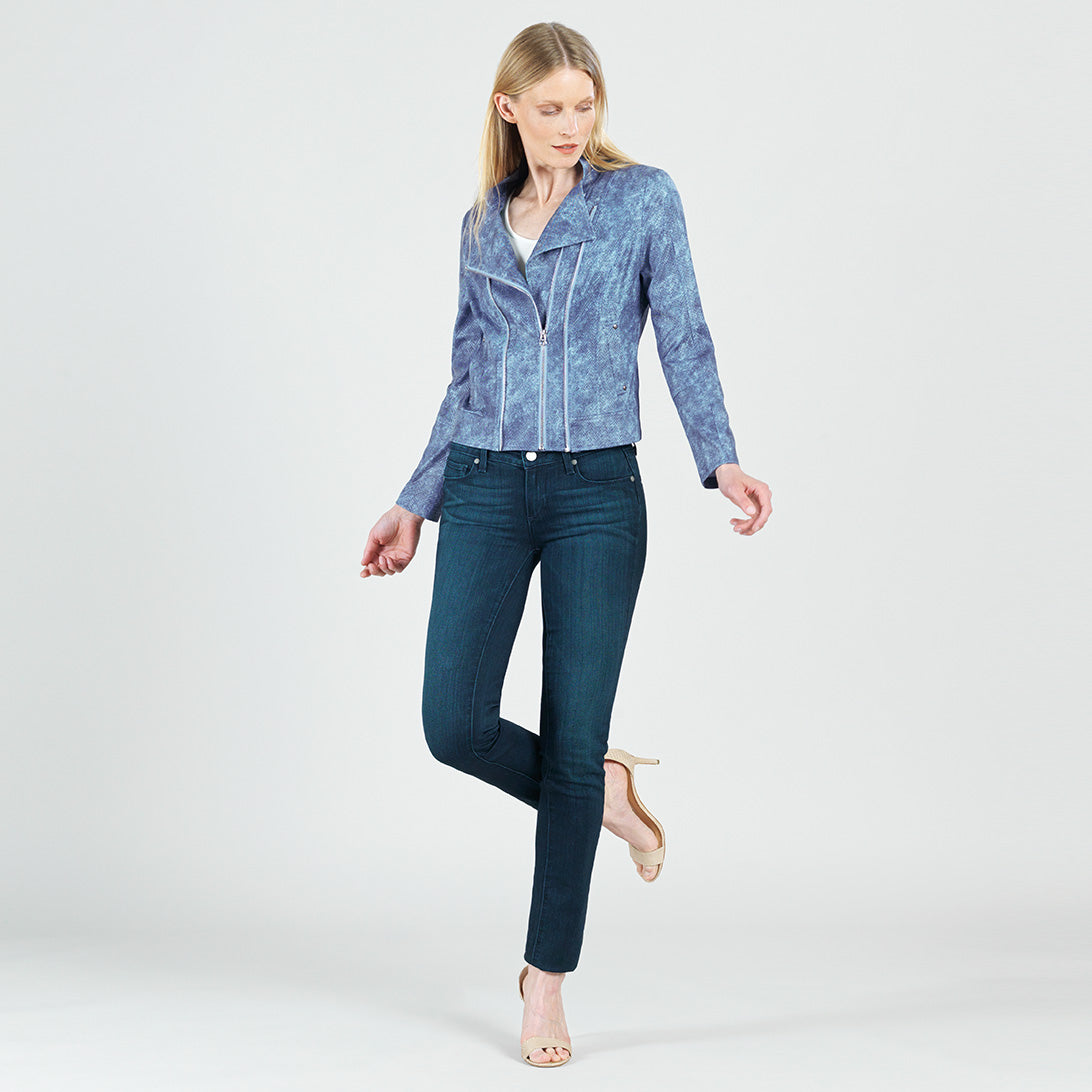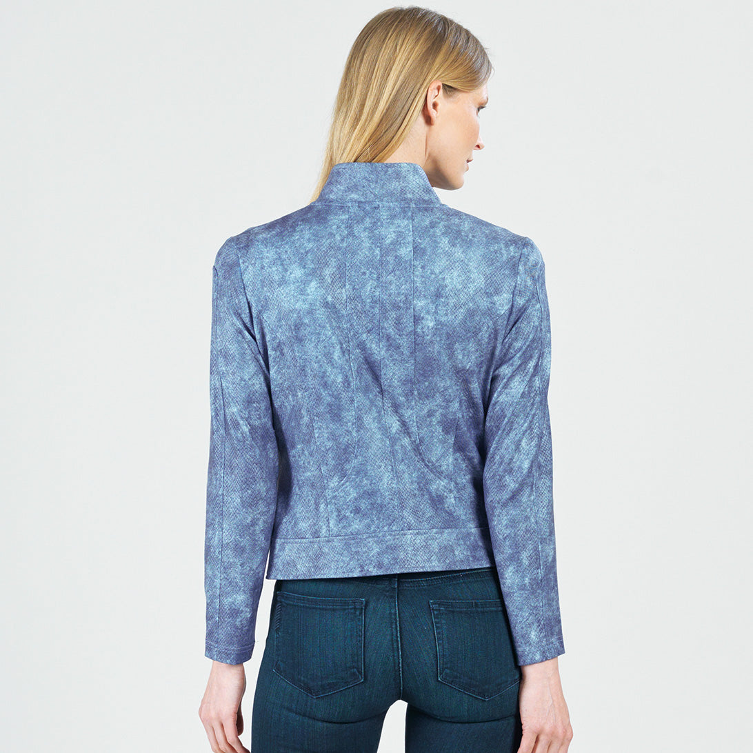 You’ll feel like a blue jean baby, wearing our Denim Liquid Leather Textured Double Zip Pocket Jacket! Featuring a notched lapel with an upright collar, silver vertical zip closure with a double zipper detail allowing for a customized silhouette, long sleeves, side pockets with snap details, and beautiful pipe stitching throughout the jacket. Our Denim print displays an acid wash of denim blue, navy, and subtle hints of white with a scale-like texture that creates a realistic jean effect. Made from our beautiful signature stretch knit, extremely lightweight soft “lambskin feel” fabric with a soft matte finish. The interior is made from soft knit giving it the right amount of stretch and providing you with breathable superb wear and best of all it’s vegan friendly! Clara Sunwoo | Favorite Things from CS on Vimeo.Textured Liquid Leather KnitThis vegan-friendly fabric offers superior comfort and style. Crafted from our signature flexible polyester blend and coated in a faux leather-like scale-like matte finish, it’s cool to the touch, quick-drying, and easy to maintain. Enjoy the look and feel of leather without the guilt.Travel Friendly Ultra Lightweight Soft Knit Fabric – Faux Leather Scale-Like Textured Matte FinishDouble Zip Detail Vegan Friendly!