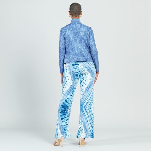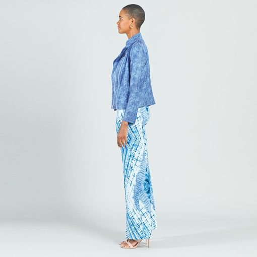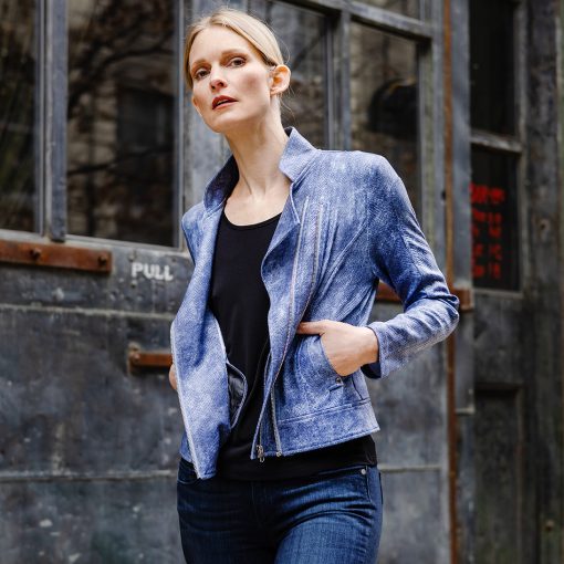 You’ll feel like a blue jean baby, wearing our Denim Liquid Leather Textured Double Zip Pocket Jacket! Featuring a notched lapel with an upright collar, silver vertical zip closure with a double zipper detail allowing for a customized silhouette, long sleeves, side pockets with snap details, and beautiful pipe stitching throughout the jacket. Our Denim print displays an acid wash of denim blue, navy, and subtle hints of white with a scale-like texture that creates a realistic jean effect. Made from our beautiful signature stretch knit, extremely lightweight soft “lambskin feel” fabric with a soft matte finish. The interior is made from soft knit giving it the right amount of stretch and providing you with breathable superb wear and best of all it’s vegan friendly! Clara Sunwoo | Favorite Things from CS on Vimeo.Textured Liquid Leather KnitThis vegan-friendly fabric offers superior comfort and style. Crafted from our signature flexible polyester blend and coated in a faux leather-like scale-like matte finish, it’s cool to the touch, quick-drying, and easy to maintain. Enjoy the look and feel of leather without the guilt.Travel Friendly Ultra Lightweight Soft Knit Fabric – Faux Leather Scale-Like Textured Matte FinishDouble Zip Detail Vegan Friendly!