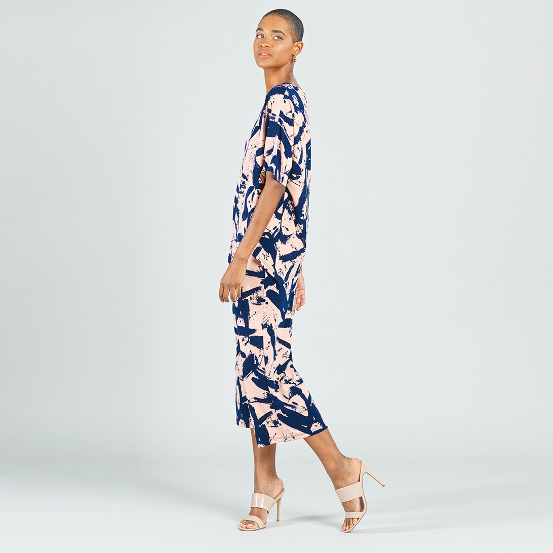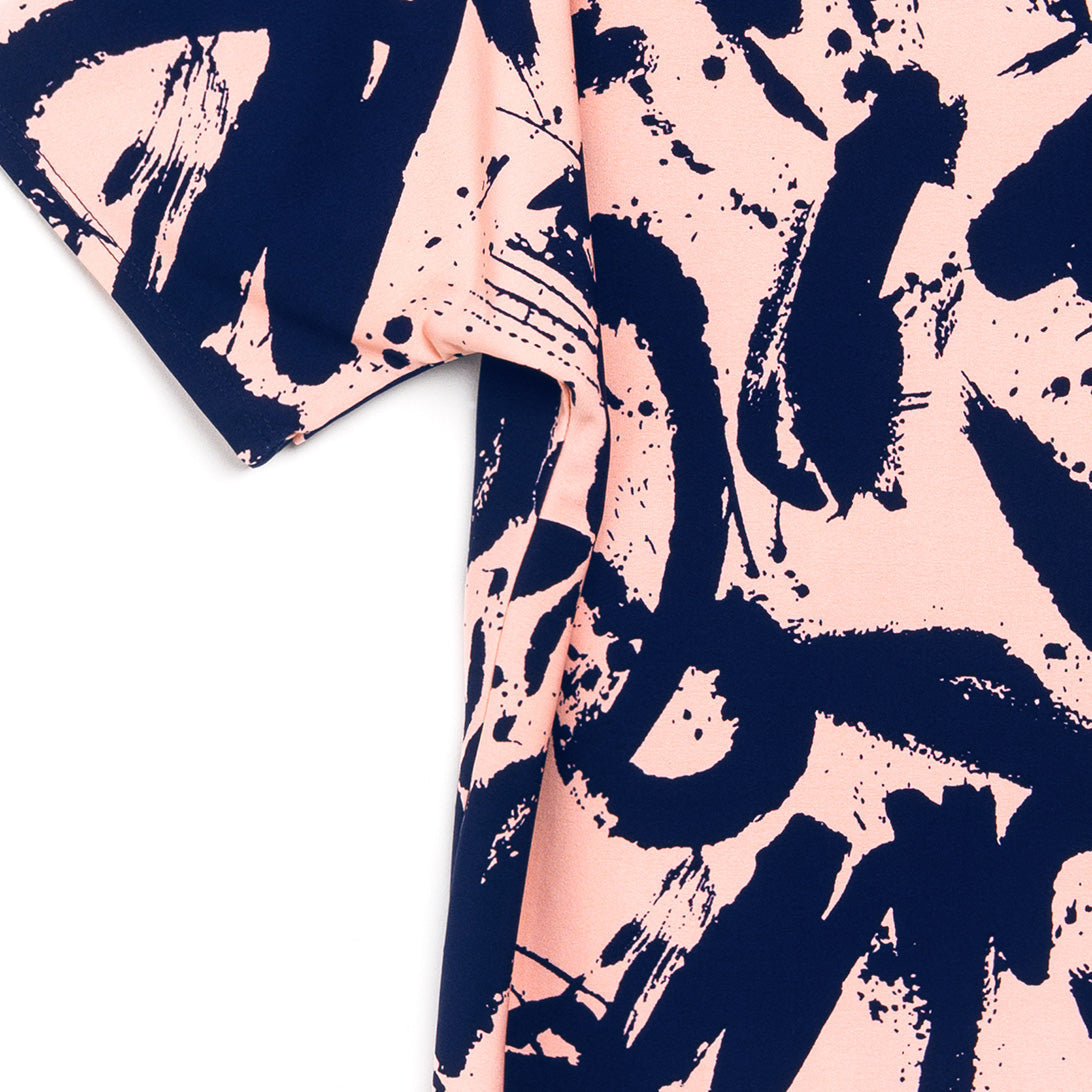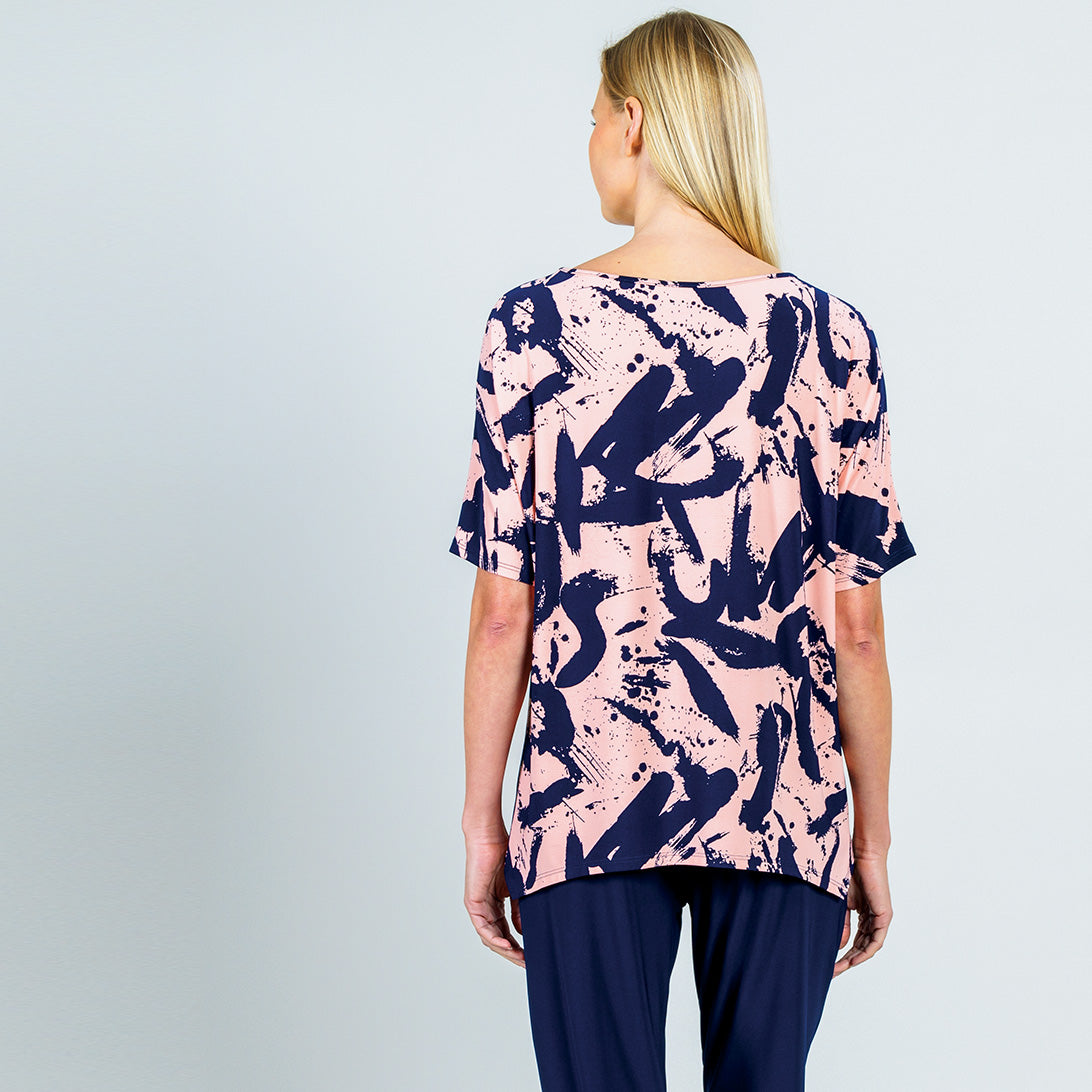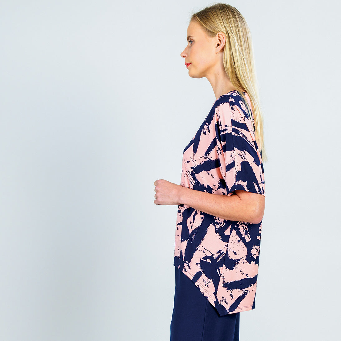 Burst into color wearing our Splash Stroke Loose Cut Hi-Low Top! This top features a round neckline, elbow-length dolman sleeves, and an up-curved, hi-low hemline. An artistic print, featuring paint splash strokes in shades of navy, against a light coral background with neutral undertones. ♥ Each piece is a unique, one-of-a-kind print and print placement will vary. Carefree Travel Fabric – Soft Silky Knit Our signature poly blend fibers offer luxurious softness with lightweight, wrinkle-free comfort. This easy-care fabric is quick drying and cooler than linen or cotton, making it perfect for on-the-go wear.Wrinkle Free Travel Friendly Ultra Lightweight Soft Knit Fabric Breathable Jersey-Like Feel