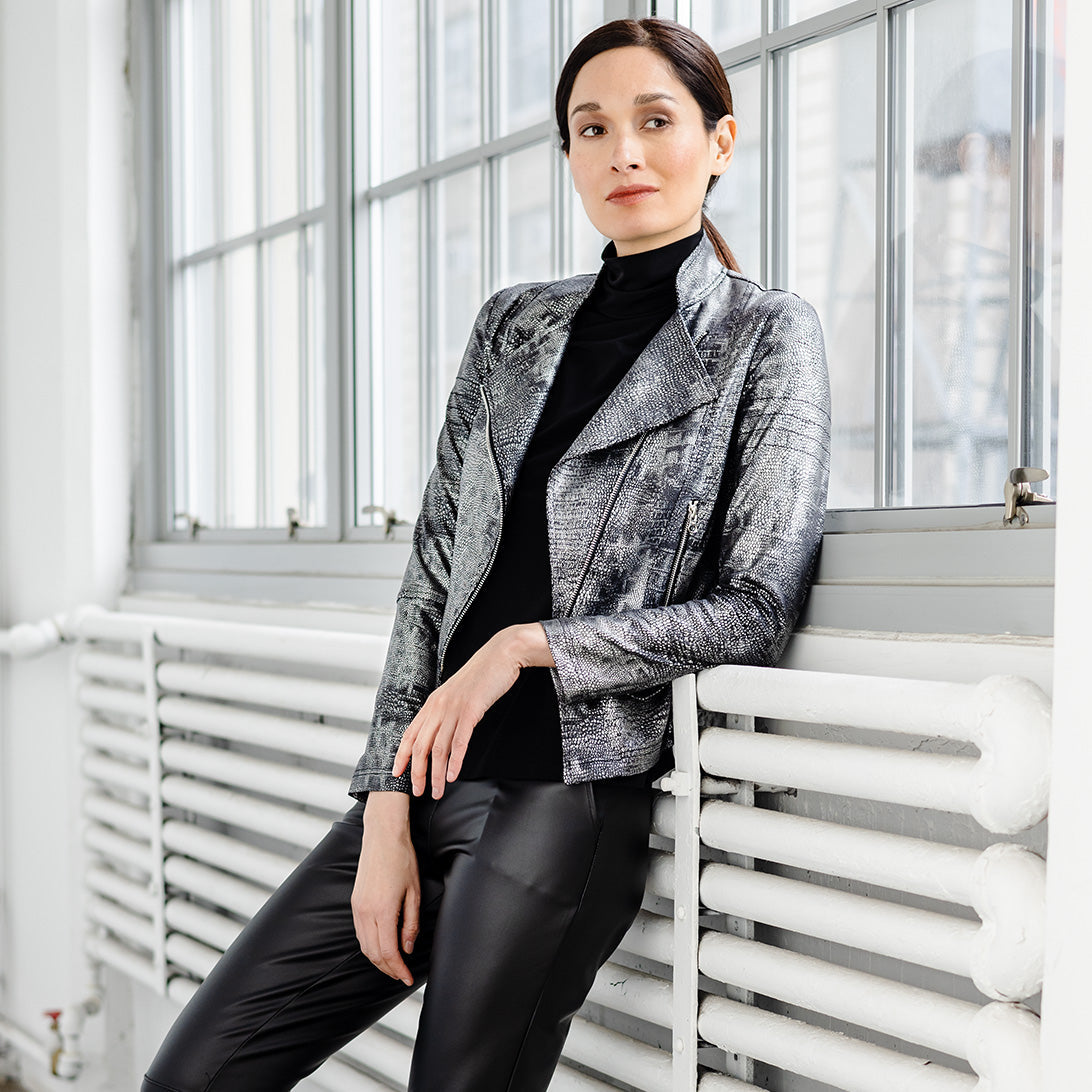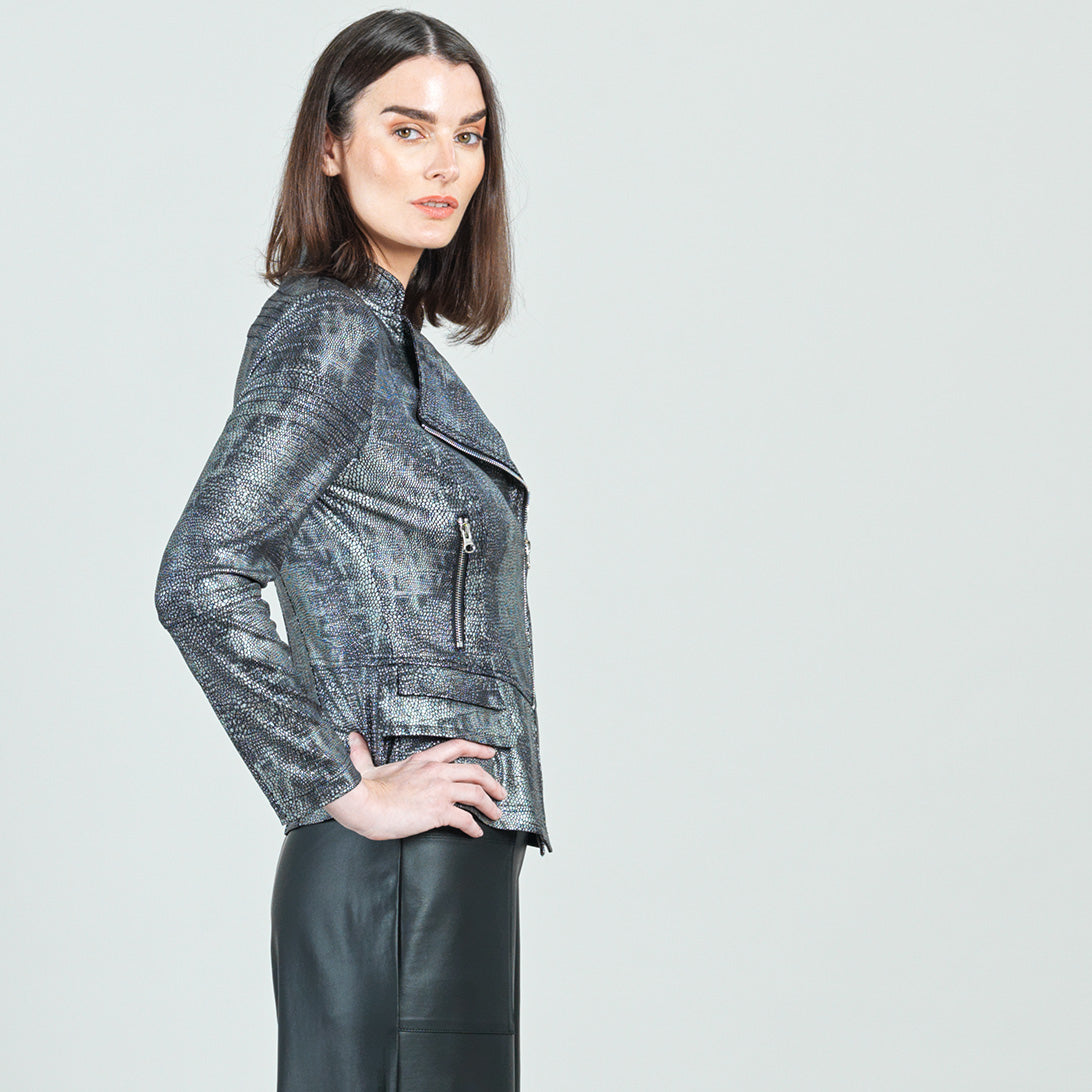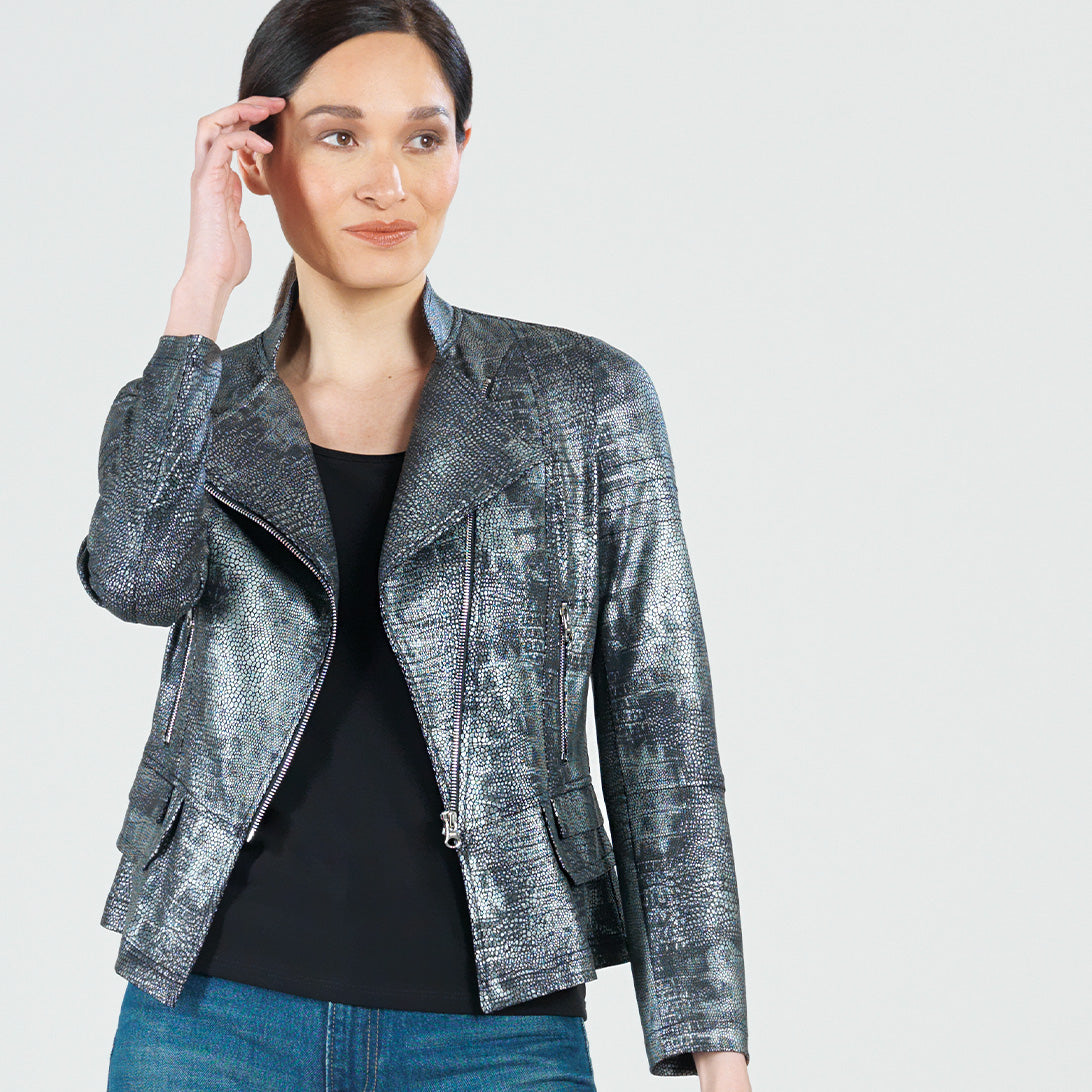 When innovation is combined with an edge you’ll be sure to see our Metallic Liquid Leather Textured Biker Jacket! This unique design is made from our beautiful signature stretch knit, extremely lightweight soft “lambskin feel” fabric with a soft, textured metallic shimmer finish. This jacket features a notched lapel with upright collar, long sleeves with upper arm stitching, a silver asymmetrical waist zip-up closure, faux pocket zipper slits, and peplum waist seam with structured double-tiered flaps, as well as curved and vertical back seams that provide a more shaped and slender silhouette… and best of all it’s vegan friendly! Our Gunmetal shade is a metallic, silver foiled color with black undertones, with a textured finish that gives off a three-dimension effect. ♥ Each piece is a unique, one-of-a-kind print and print placement will vary. Inspired by luxury motorcycle jackets, the interior is made from soft knit giving it the right amount of stretch with breathable superb wear that conforms to your body and provides you with the utmost comfort. Clara Sunwoo | Favorite Things from CS on Vimeo. Metallic Liquid Leather Knit Feel the touch of luxury with our signature soft stretch poly blend fibers, enhanced with a unique coating of faux liquid leather with a luxurious metallic finish for an elegant look. Enjoy the convenience of easy care, quick drying, and a cooler touch than linen or cotton.Travel Friendly Ultra Lightweight Soft Knit Fabric – Faux Leather Textured Metallic Shimmer Finish Vegan Friendly!