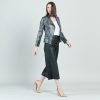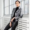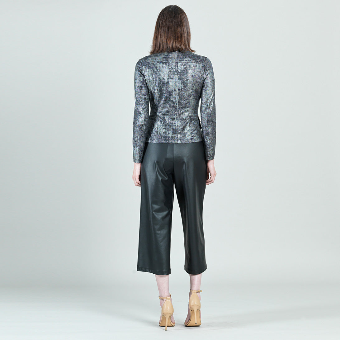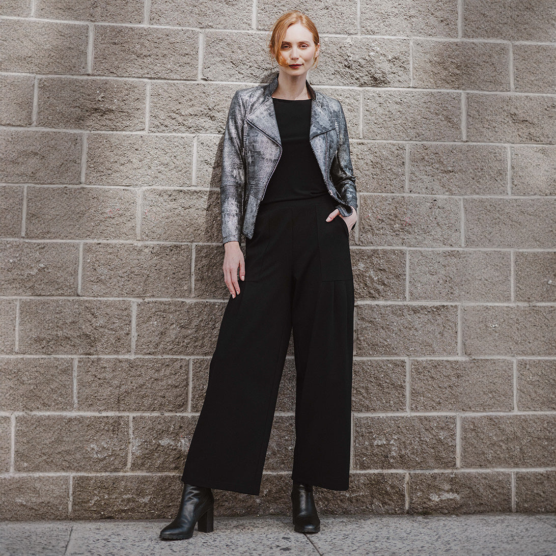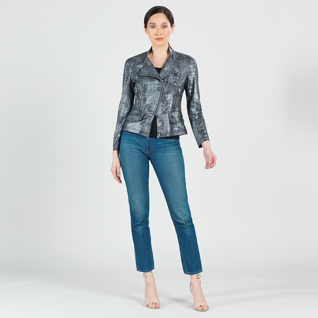 When innovation is combined with an edge you’ll be sure to see our Metallic Liquid Leather Textured Biker Jacket! This unique design is made from our beautiful signature stretch knit, extremely lightweight soft “lambskin feel” fabric with a soft, textured metallic shimmer finish. This jacket features a notched lapel with upright collar, long sleeves with upper arm stitching, a silver asymmetrical waist zip-up closure, faux pocket zipper slits, and peplum waist seam with structured double-tiered flaps, as well as curved and vertical back seams that provide a more shaped and slender silhouette… and best of all it’s vegan friendly! Our Gunmetal shade is a metallic, silver foiled color with black undertones, with a textured finish that gives off a three-dimension effect. ♥ Each piece is a unique, one-of-a-kind print and print placement will vary. Inspired by luxury motorcycle jackets, the interior is made from soft knit giving it the right amount of stretch with breathable superb wear that conforms to your body and provides you with the utmost comfort. Clara Sunwoo | Favorite Things from CS on Vimeo. Metallic Liquid Leather Knit Feel the touch of luxury with our signature soft stretch poly blend fibers, enhanced with a unique coating of faux liquid leather with a luxurious metallic finish for an elegant look. Enjoy the convenience of easy care, quick drying, and a cooler touch than linen or cotton.Travel Friendly Ultra Lightweight Soft Knit Fabric – Faux Leather Textured Metallic Shimmer Finish Vegan Friendly!