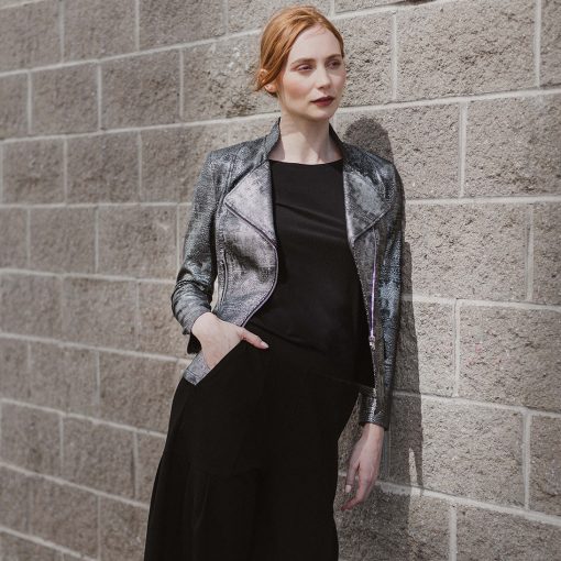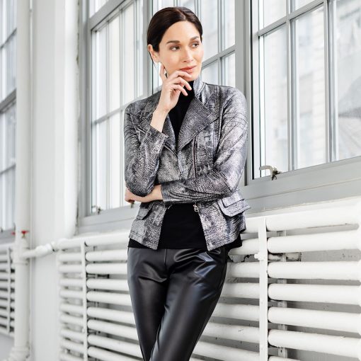 When innovation is combined with an edge you’ll be sure to see our Metallic Liquid Leather Textured Biker Jacket! This unique design is made from our beautiful signature stretch knit, extremely lightweight soft “lambskin feel” fabric with a soft, textured metallic shimmer finish. This jacket features a notched lapel with upright collar, long sleeves with upper arm stitching, a silver asymmetrical waist zip-up closure, faux pocket zipper slits, and peplum waist seam with structured double-tiered flaps, as well as curved and vertical back seams that provide a more shaped and slender silhouette… and best of all it’s vegan friendly! Our Gunmetal shade is a metallic, silver foiled color with black undertones, with a textured finish that gives off a three-dimension effect. ♥ Each piece is a unique, one-of-a-kind print and print placement will vary. Inspired by luxury motorcycle jackets, the interior is made from soft knit giving it the right amount of stretch with breathable superb wear that conforms to your body and provides you with the utmost comfort. Clara Sunwoo | Favorite Things from CS on Vimeo. Metallic Liquid Leather Knit Feel the touch of luxury with our signature soft stretch poly blend fibers, enhanced with a unique coating of faux liquid leather with a luxurious metallic finish for an elegant look. Enjoy the convenience of easy care, quick drying, and a cooler touch than linen or cotton.Travel Friendly Ultra Lightweight Soft Knit Fabric – Faux Leather Textured Metallic Shimmer Finish Vegan Friendly!