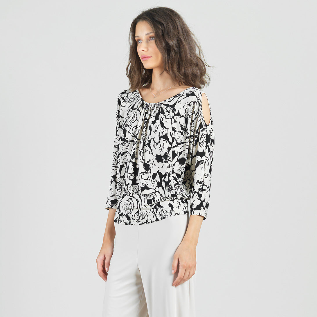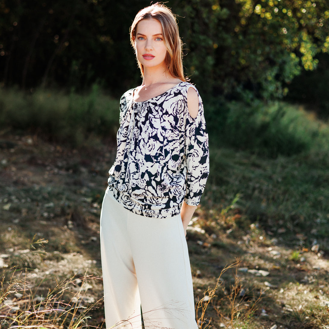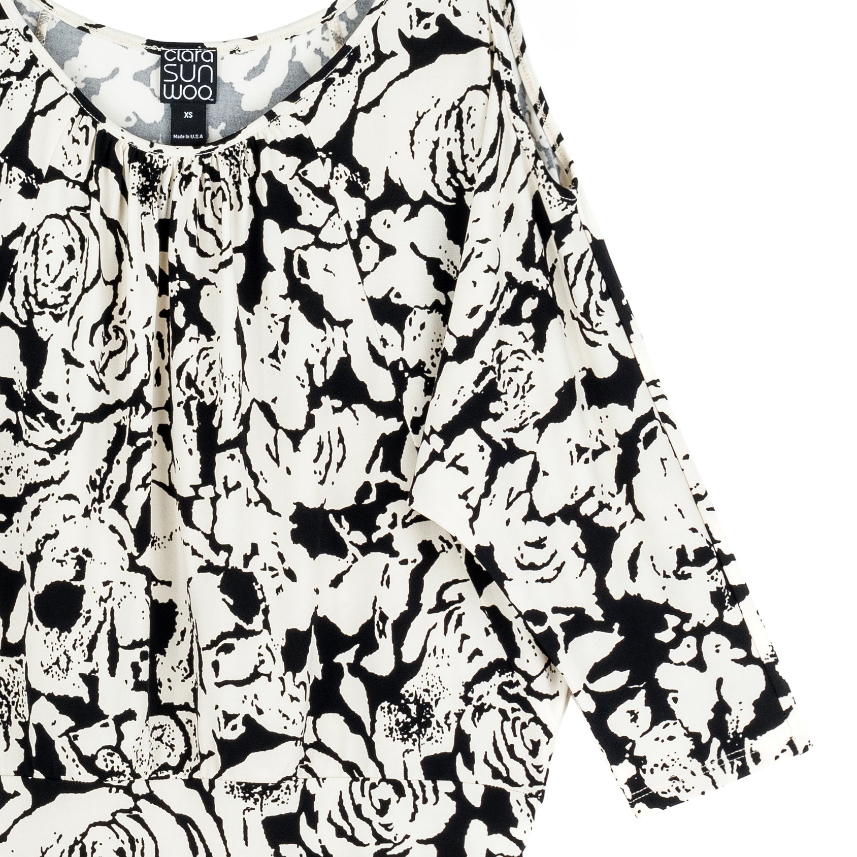 A style so beautiful you’ll look as fresh as our Abstract Rose Open Shoulder Blouson Waist Top! Featuring an open shoulder with 3/4 length dolman sleeves, a scoop neckline with a gathered detail that creates beautiful soft pleats, front and back side diagonal princess seams, and a waist-hugging hemline, that displays an elegant blouson silhouette. A minimalist print comprised of shades of bone and black that create soft and subtle abstract rosettes. ♥ Each piece is a unique, one-of-a-kind print and print placement will vary.Carefree Travel Fabric – Soft Silky Knit Our signature poly blend fibers offer luxurious softness with lightweight, wrinkle-free comfort. This easy-care fabric is quick drying and cooler than linen or cotton, making it perfect for on-the-go wear.Open Shoulder Wrinkle Free Travel Friendly Ultra Lightweight Soft Knit Fabric Breathable Jersey-Like Feel