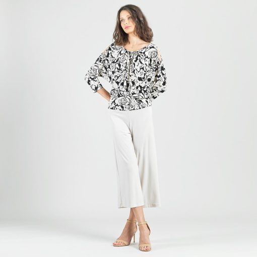 A style so beautiful you’ll look as fresh as our Abstract Rose Open Shoulder Blouson Waist Top! Featuring an open shoulder with 3/4 length dolman sleeves, a scoop neckline with a gathered detail that creates beautiful soft pleats, front and back side diagonal princess seams, and a waist-hugging hemline, that displays an elegant blouson silhouette. A minimalist print comprised of shades of bone and black that create soft and subtle abstract rosettes. ♥ Each piece is a unique, one-of-a-kind print and print placement will vary.Carefree Travel Fabric – Soft Silky Knit Our signature poly blend fibers offer luxurious softness with lightweight, wrinkle-free comfort. This easy-care fabric is quick drying and cooler than linen or cotton, making it perfect for on-the-go wear.Open Shoulder Wrinkle Free Travel Friendly Ultra Lightweight Soft Knit Fabric Breathable Jersey-Like Feel