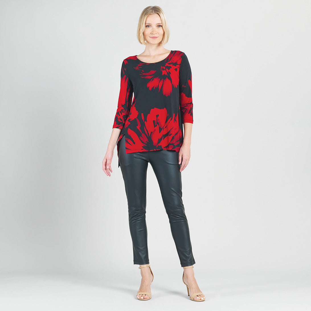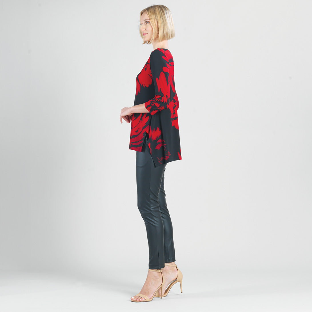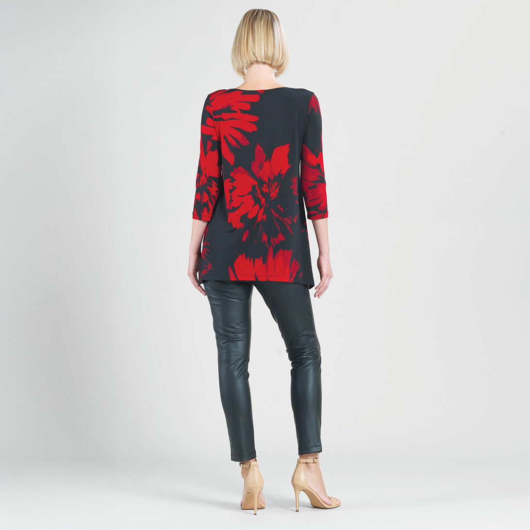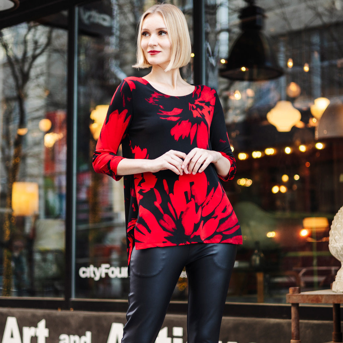 Add some romance to your wardrobe with our Hibiscus Petal Parachute Hem Tunic! Featuring a round neckline, 3/4 length sleeves, and a side vent parachute hemline. A beautiful print, displaying large-scale hibiscus flowers and petals in a gradient of red tones, against a black background. ♥ Each piece is a unique, one-of-a-kind print and print placement will vary. Carefree Travel Fabric – Soft Silky Knit Our signature poly blend fibers offer luxurious softness with lightweight, wrinkle-free comfort. This easy-care fabric is quick drying and cooler than linen or cotton, making it perfect for on-the-go wear.Wrinkle Free Travel Friendly Ultra Lightweight Soft Knit Fabric Breathable Jersey-Like Feel