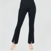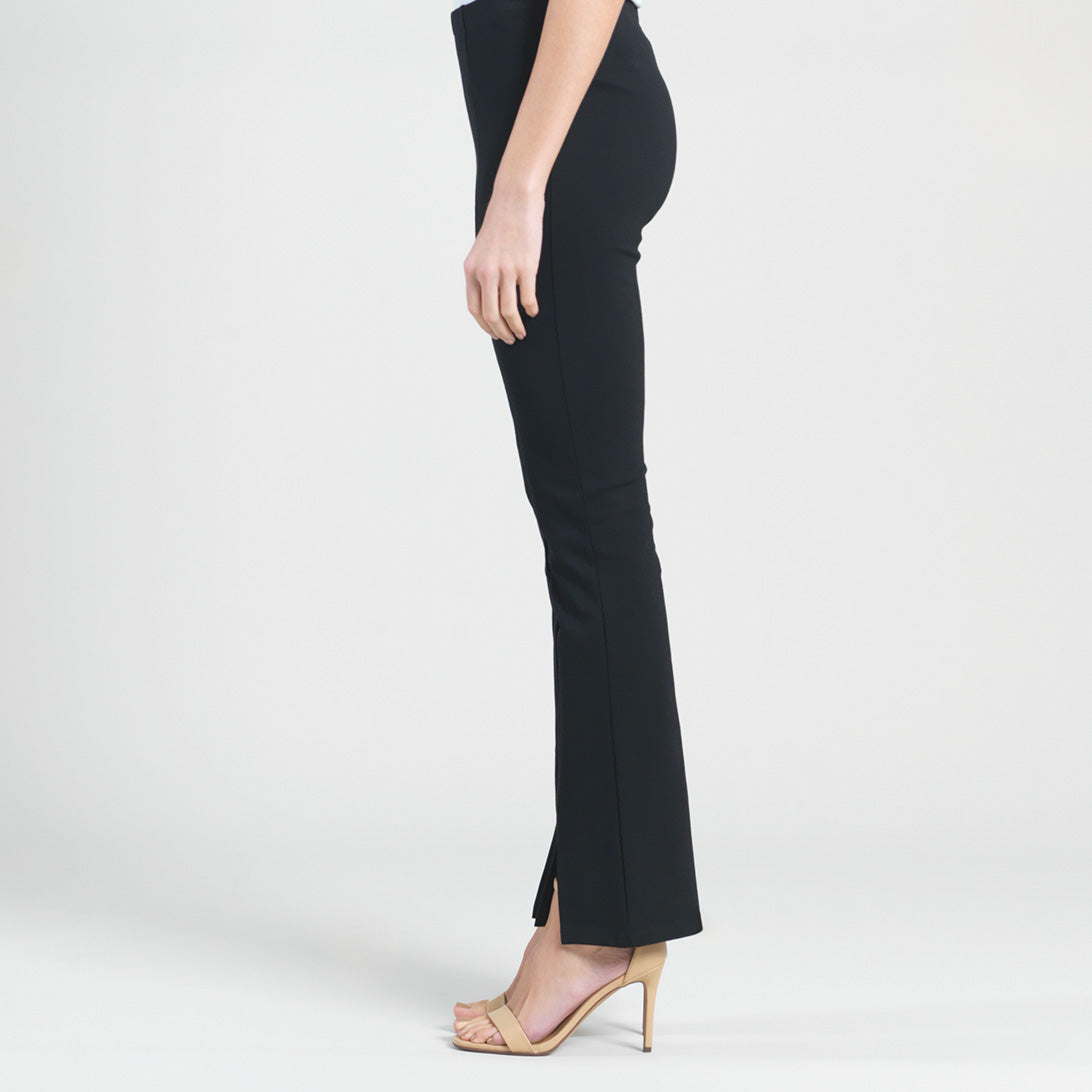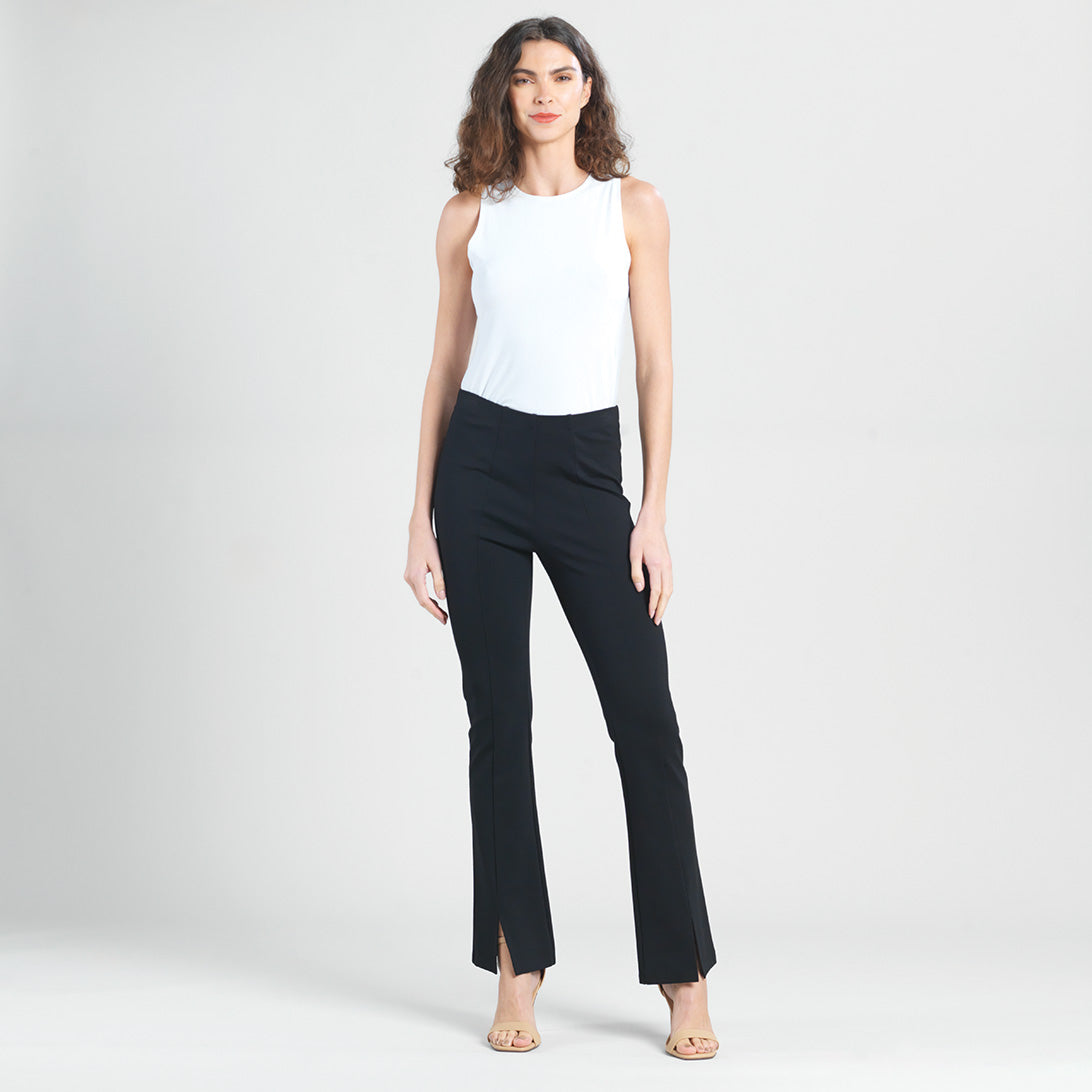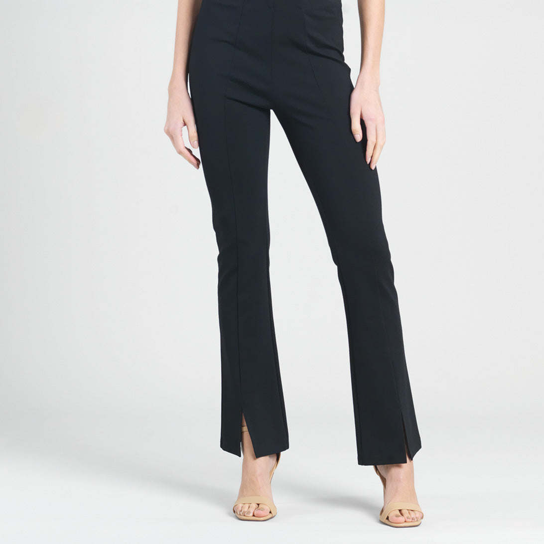 Our sleek and chic Ponte Kick Front Slit Pant is all the style you need. This pant features a 1” pull-on elastic waistband, vertical center leg seam with a flared hem, and sleek front leg slit. Made to provide a slimming silhouette in the hip and thigh area while gradually flaring towards the hem. Standard Ponte Knit Fabric Our Ponte Poly Blend Fabric is perfect for those seeking the ideal blend of stability and softness. Its thick double-knit composition provides superior shape retention and a luxurious matte finish, while the added thickness offers a premium feel. Enjoy a classic, polished look without sacrificing comfort. 1″ Elastic Waistband 4.5″ to 5″ Front Slit Flared Opening Soft, Structured Feel Thicker Than Jersey-Knit
