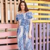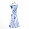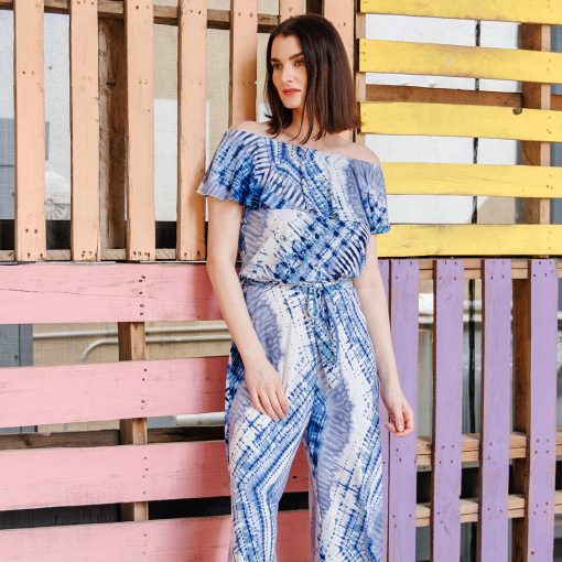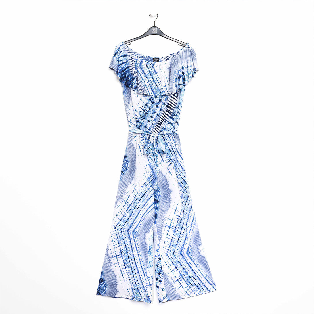 Our Acid Wash Ruffle Off Shoulder Pocket Jumpsuit is to dye for! Featuring a feminine off-shoulder, ruffled overlay neckline, an elastic waistband with tie-waist detail to accentuate your shape, two modern pockets, and a cropped gaucho silhouette. **Can also be worn on the shoulder for an alternative neckline! A stunning acid wash print, comprised of oceanic shades of navy, sky, baby blues, and white, with subtle hints of teal and beige, that display a tie-dye effect, in sunburst shapes. ♥ Each piece is a unique, one-of-a-kind print and print placement will vary. Carefree Travel Fabric – Soft Silky Knit Our signature poly blend fibers offer luxurious softness with lightweight, wrinkle-free comfort. This easy-care fabric is quick drying and cooler than linen or cotton, making it perfect for on-the-go wear.Wrinkle Free Travel Friendly Ultra Lightweight Soft Knit Fabric Breathable Jersey-Like Feel Alternative Neckline