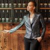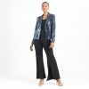 Blaze a new fashion trail and leave a little sparkle behind in our Sequin Knit Modern Button Blazer! This beautiful blazer features a standard collar with a peak lapel, inner shoulder pads, long sleeves, single-breasted-diamond-shaped shiny black 2-button closure, and bodice princess seaming. Our Gunmetal shimmer sequin is a dark silver chrome that creates a galactic coloration comprised of blue and purple undertones. A new intricately delicate fabric, inspired by art-deco glamour. A lustrous formation of shimmer created by mini textured holographic sequins that showcase an enchanting spectrum of colors. Designed with a mid-weight finish, fluid drape, and structured flexibility, offering unparalleled longevity. **Please Note: Due to the textured nature of this fabric, we suggest refraining from pairing this item with delicate materials to avoid the risk of pilling. Nylon-Shimmer Sequin Texture KnitHigh-quality nylon-sequin blend fibers offer luxurious texture with soft comfort and reflective shine. A fabric elevated by small reflective sequins that coat a lightly lined jersey knit base. Single Breasted, 2-Button ClosureTextured Sequin Knit Breathable Jersey-Knit BaseDelicate Finish, Lightly-LinedTravel Friendly