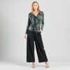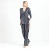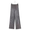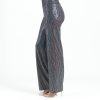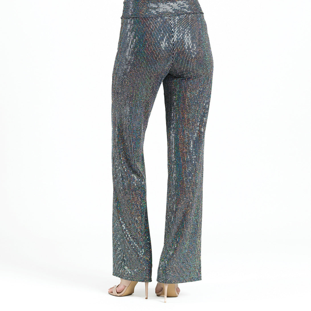 Turn heads while lighting up any room in our Silver Pinstripe Wide Leg Pant! Featuring a loose-fitting straight-leg silhouette with a 3” pull-on soft waistband and is designed to naturally flow against the body. A new intricately delicate fabric, inspired by art-deco glamour. A lustrous formation of pinstripes created by mini textured silver holographic sequins that showcase an enchanting spectrum of rainbow colors. Designed with a mid-weight finish, fluid drape, and structured flexibility, offering unparalleled longevity. **Please Note: Due to the textured nature of this fabric, we suggest refraining from pairing this item with delicate materials to avoid the risk of pilling. Carefree Travel Fabric – Soft Silky Knit w/ Shimmer Sequin Texture Our signature poly blend fibers offer luxurious softness with lightweight, wrinkle-free comfort. A fabric elevated by delicately textured silver holographic sequins. This easy-care fabric is quick drying and cooler than linen or cotton, making it perfect for on-the-go wear. 3″ Soft Waistband Wrinkle Free Travel Friendly Mid-Weight Fabric Breathable Jersey-Knit Base Shimmer Sequin Textured Delicate Finish, Lightly-Lined