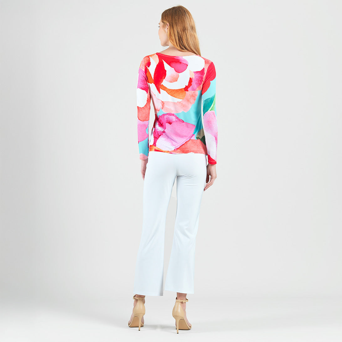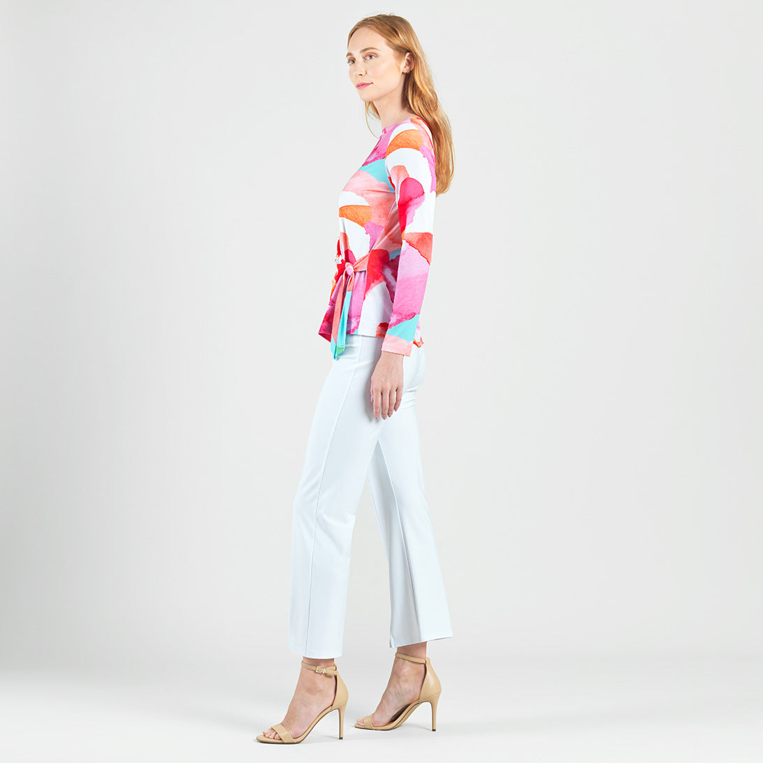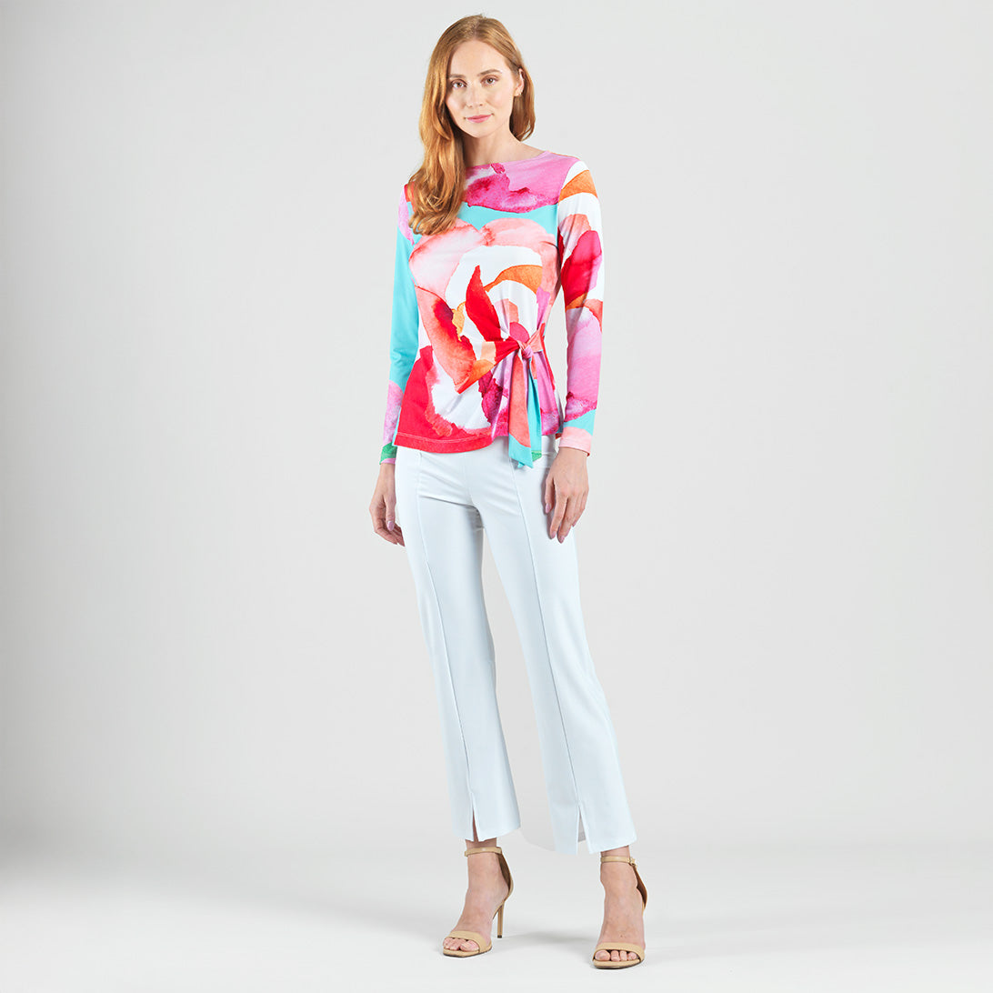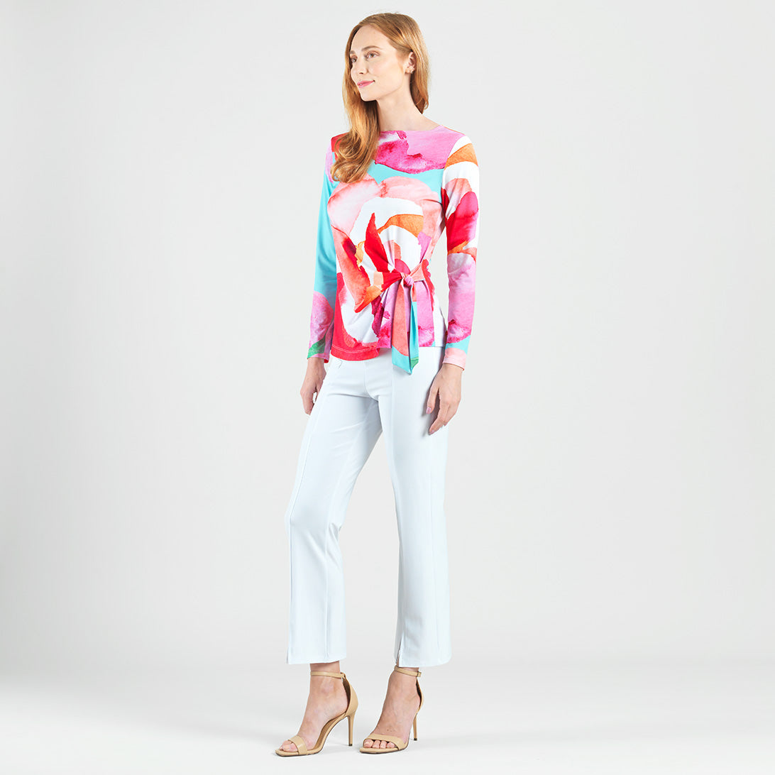 No water is required to bloom in style when you wear our Petal Watercolor Side Tie Waist Top! This stunning top features a wide round neckline, long sleeves, and a side-tie waist detail with a straight hip hemline. A charming print comprised of blending oversized petals in shades of red, pink, turquoise, orange, green, and white with subtle maroon lines that melt into each other to create a dreamy watercolor effect. ♥ Each piece is a unique, one-of-a-kind print and print placement will vary. Carefree Travel Fabric – Soft Silky Knit Our signature poly blend fibers offer luxurious softness with lightweight, wrinkle-free comfort. This easy-care fabric is quick drying and cooler than linen or cotton, making it perfect for on-the-go wear.Wrinkle Free Travel Friendly Ultra Lightweight Soft Knit Fabric Breathable Jersey-Like Feel