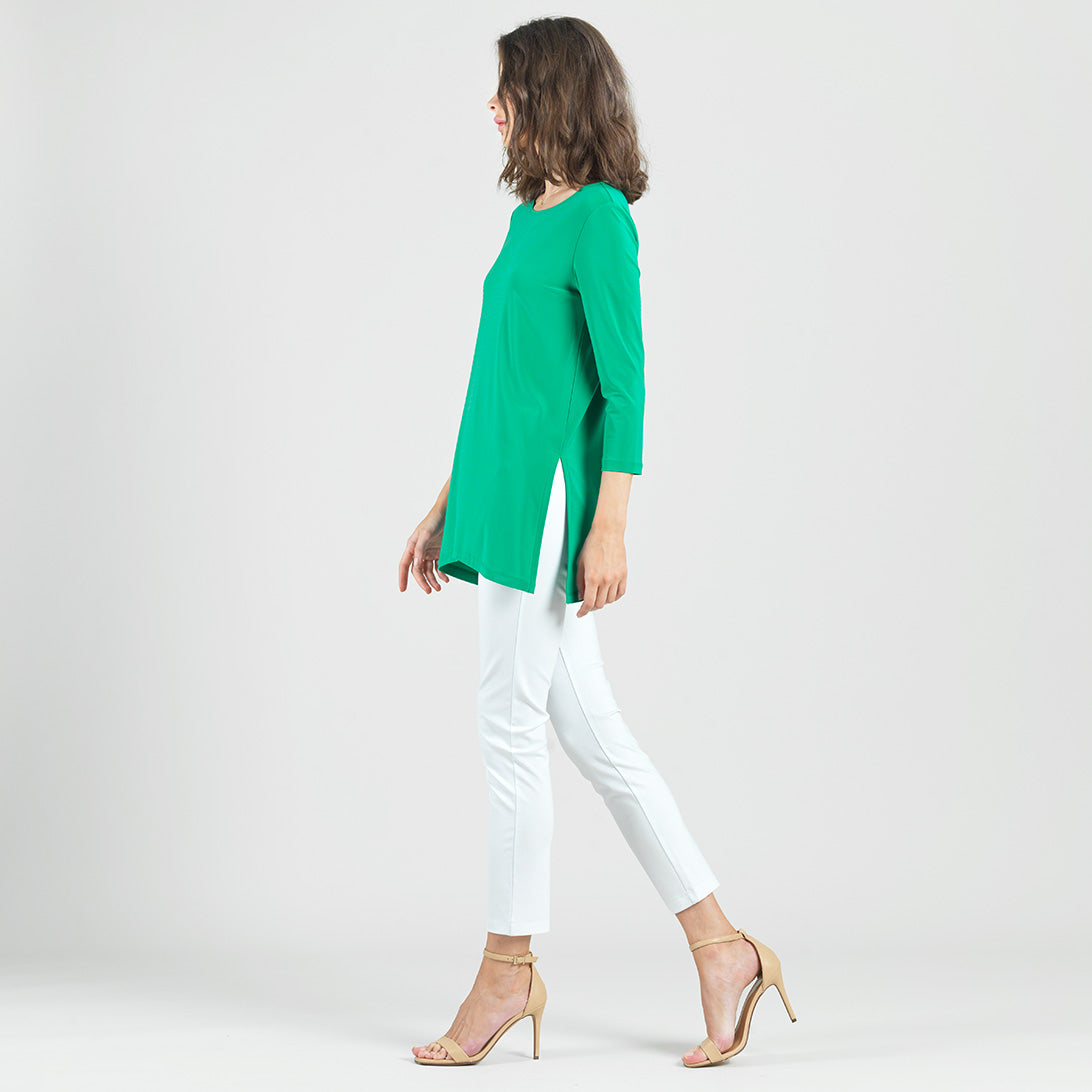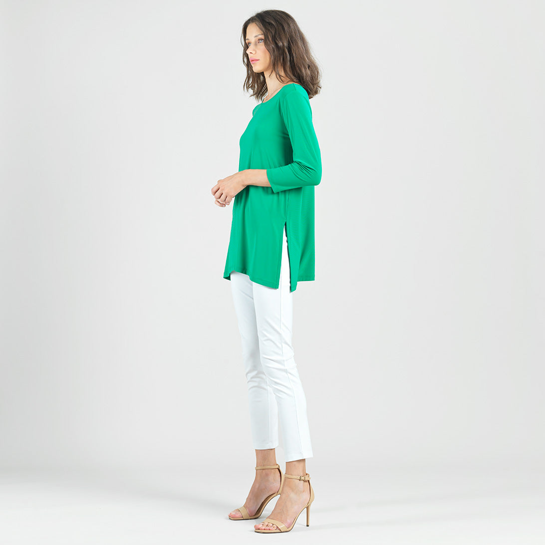 No need to be green with envy, when you can modernize your basic pieces with something as simple as our Side Vent Kerchief Hem Tunic! This tunic features a round neckline, 3/4 length sleeves, and a kerchief hemline with dual side vents that create a flattering silhouette. Our Emerald shade is a vibrant, mid-tone color, with kelly green undertones. Carefree Travel Fabric – Soft Silky Knit Our signature poly blend fibers offer luxurious softness with lightweight, wrinkle-free comfort. This easy-care fabric is quick drying and cooler than linen or cotton, making it perfect for on-the-go wear.Wrinkle Free Travel Friendly Ultra Lightweight Soft Knit Fabric Breathable Jersey-Like Feel