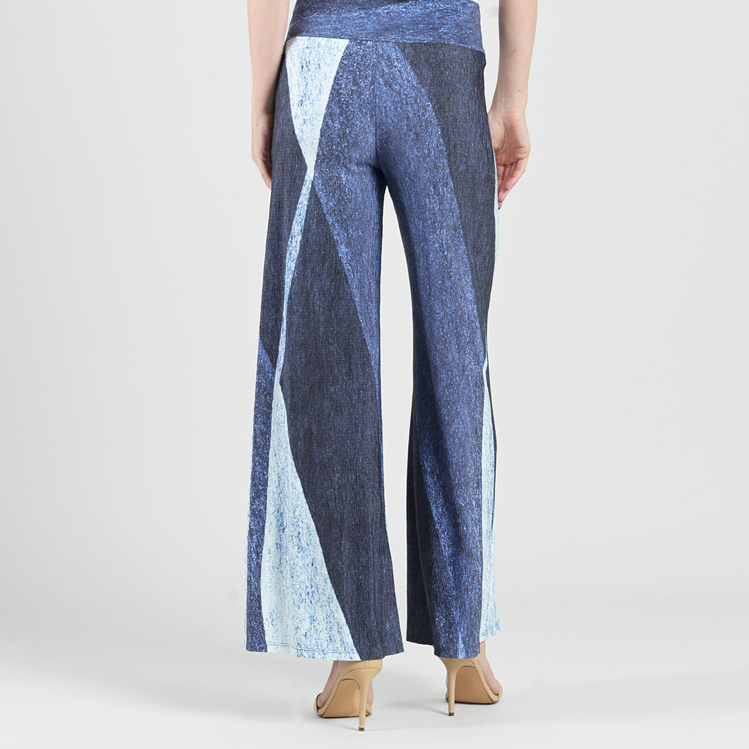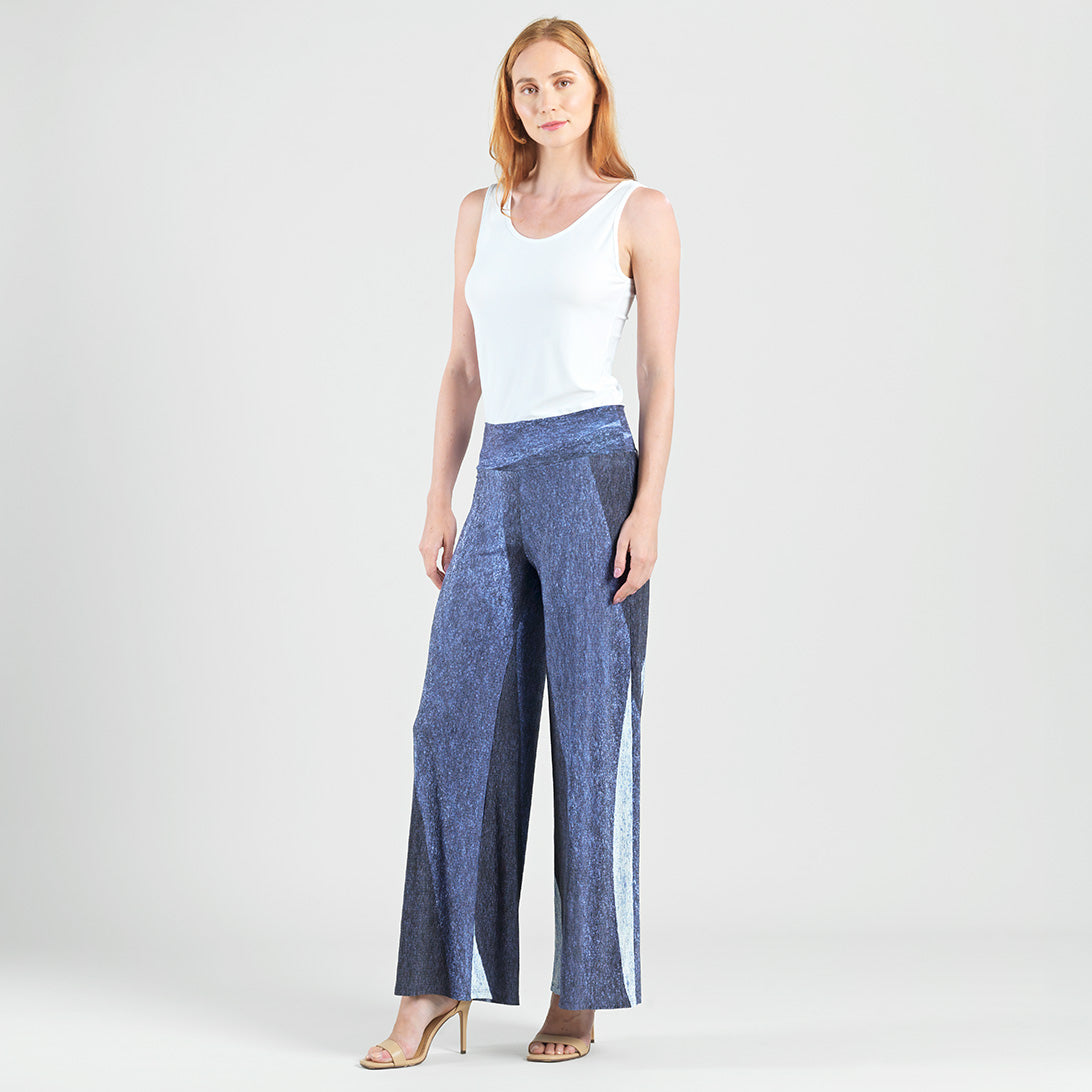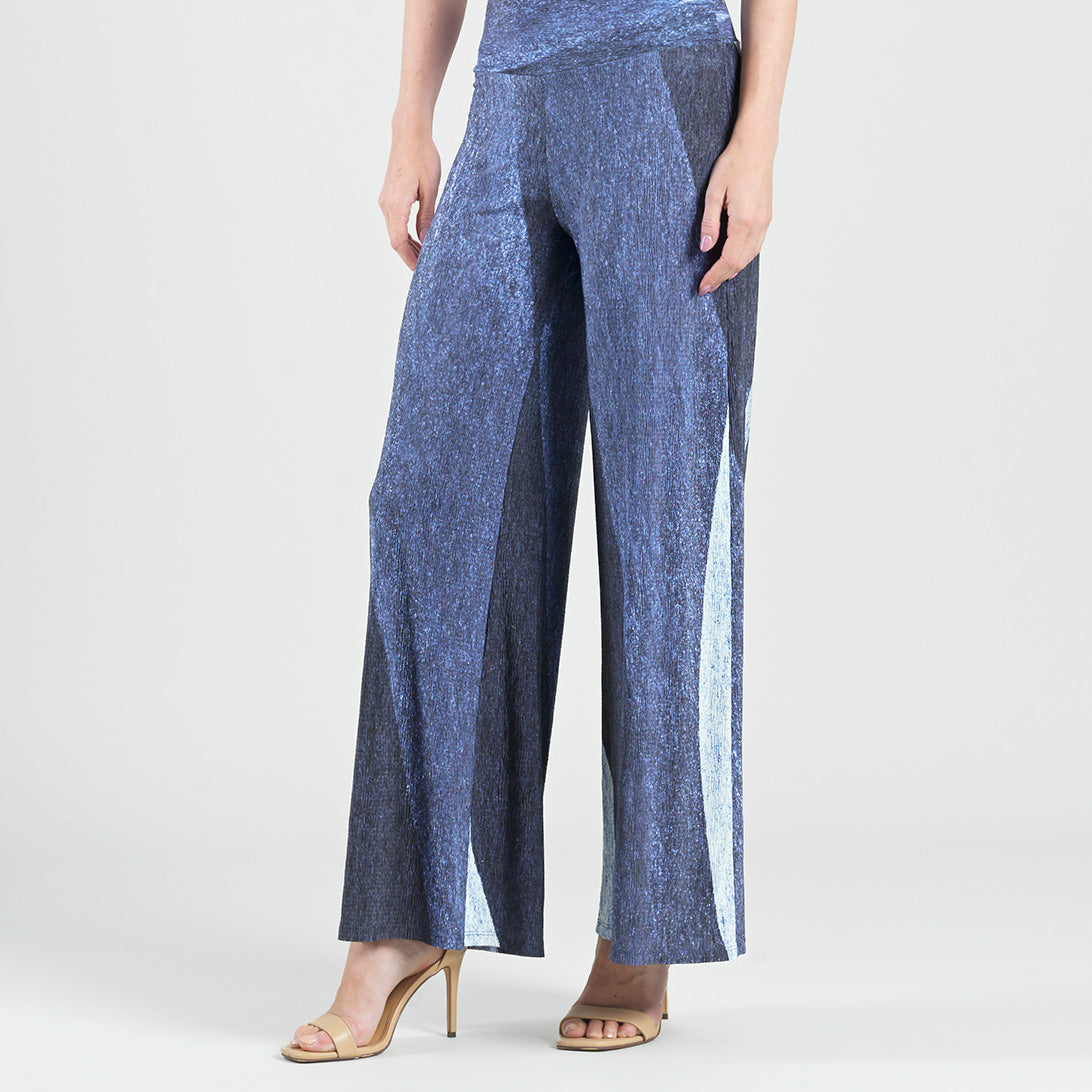 Shine beyond the stars in our Lunar Stripe Silky Pleat Palazzo Pant! This style features a 3.5” pull-on soft waistband and ultra-flattering wide-leg silhouette that naturally flows against the body. A print that beautifully captures the essence of a moonlit night, featuring shades of indigo, soft black, deep blue specks, and white in scattered stripe-like formations that create a contrast of light and shadow for an ethereal effect. ♥ Each piece is a unique, one-of-a-kind print and print placement will vary. A new, elegant jersey knit fabric, inspired by micro pleated silks. Designed with a silky, texture combined with finely pleated detailing, giving it a soft drape and modern look. It has a lightweight, airy feel, that is cool to the touch and breathable, with modest stretch. Carefree Travel Fabric – Silky Pleat Knit Our signature poly blend fibers offer a luxurious silky feel with a micro-pleated finish. This fabric is rich in texture while being soft, lightweight, and breathable with quick-drying properties. It is cooler than linen or cotton, making it perfect for on-the-go wear.3.5″ Soft Waistband Wrinkle Free Travel Friendly Micro-Pleated Detailing Silky Texture