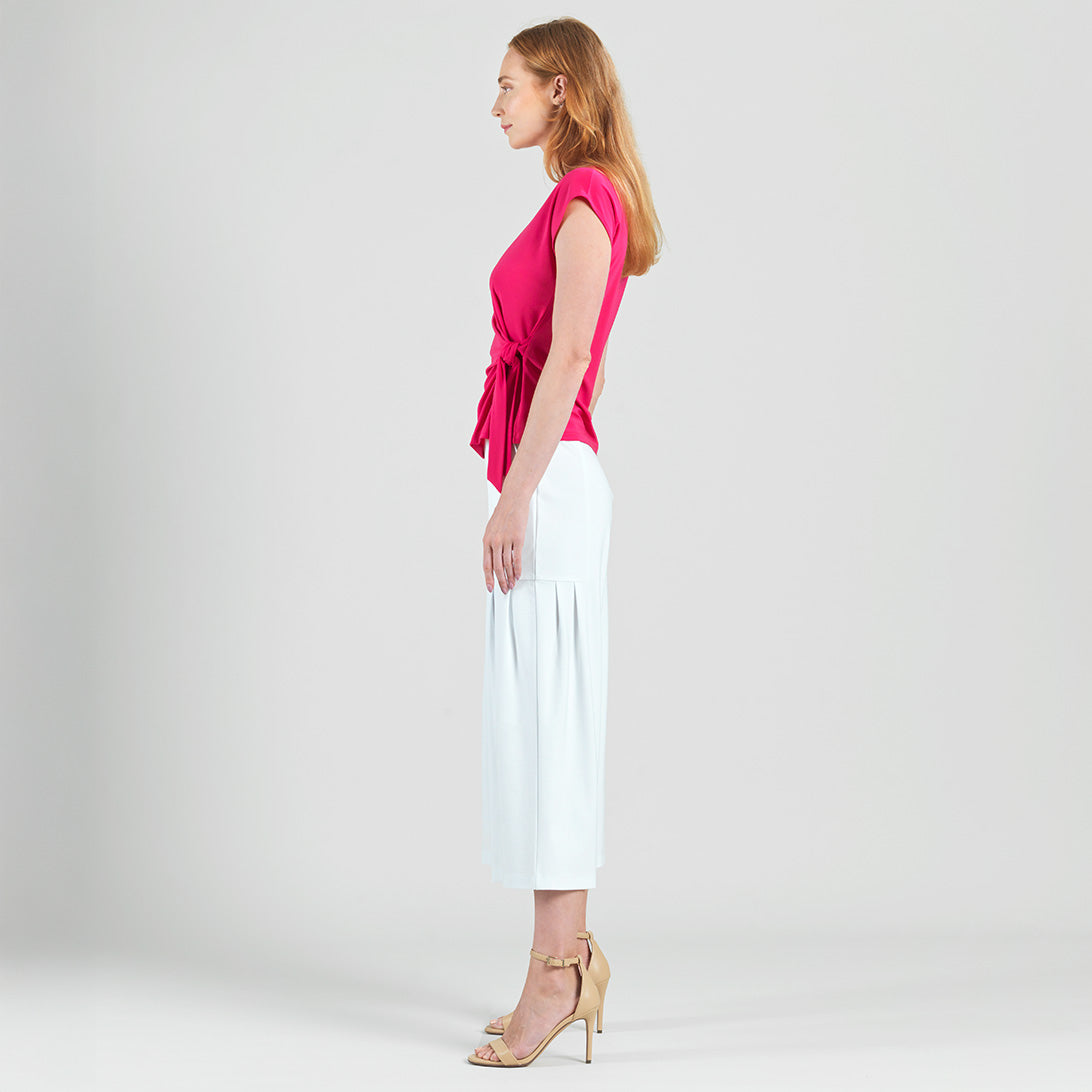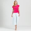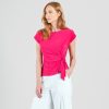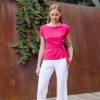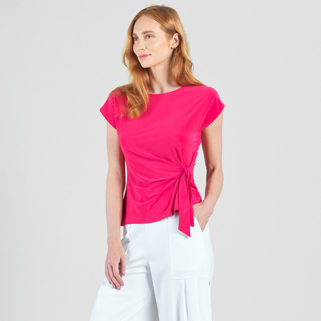 Allow our Slant Sleeve Side Tie Top to add some visual interest to your wardrobe! This style features a scoop neckline, short slanted sleeves, a side tie detail that allows you to create a silhouette to your liking, and a straight hemline. Our Hot Pink shade is a warm, vibrant color with magenta undertones. Carefree Travel Fabric – Soft Silky Knit Our signature poly blend fibers offer luxurious softness with lightweight, wrinkle-free comfort. This easy-care fabric is quick drying and cooler than linen or cotton, making it perfect for on-the-go wear.Wrinkle Free Travel Friendly Ultra Lightweight Soft Knit Fabric Breathable Jersey-Like Feel