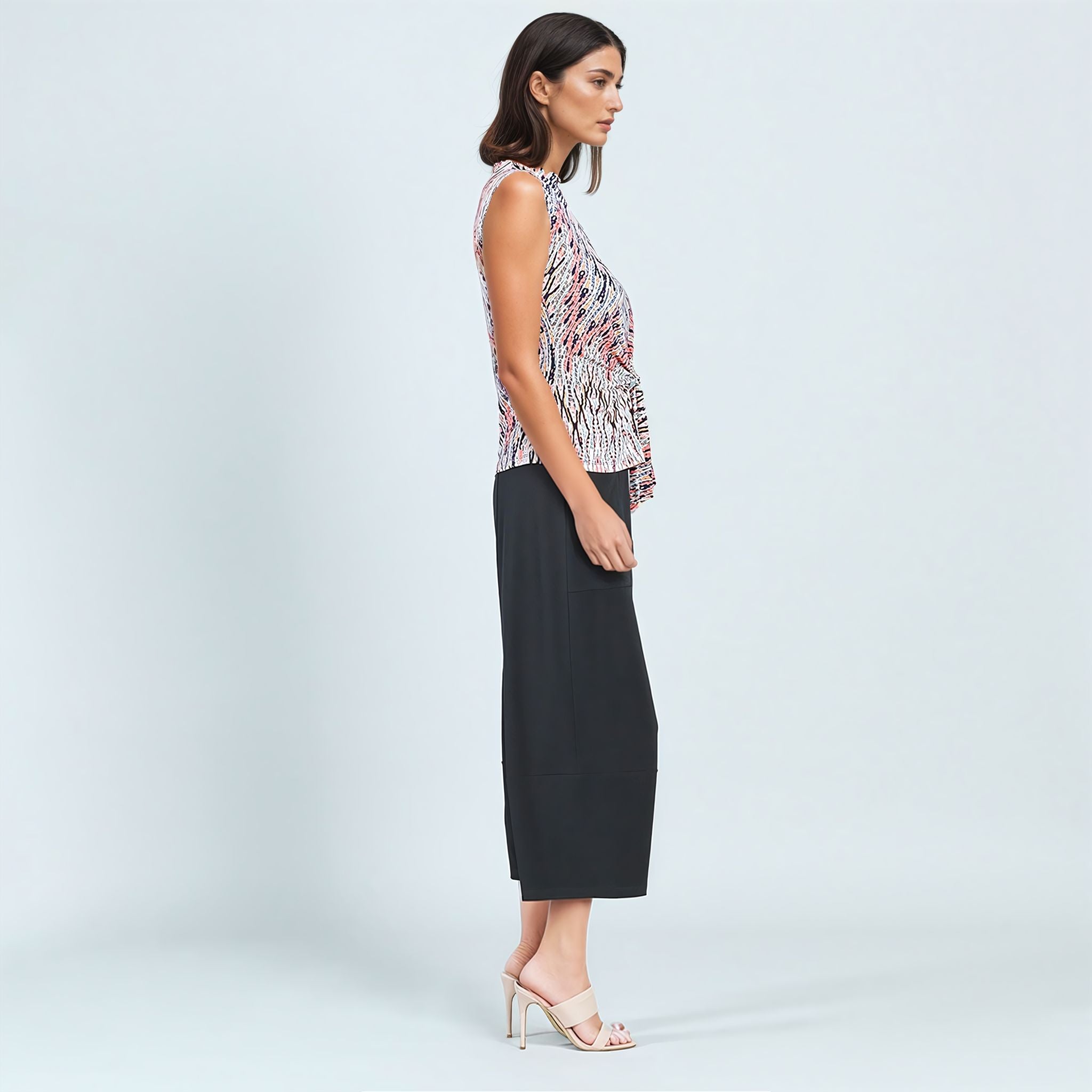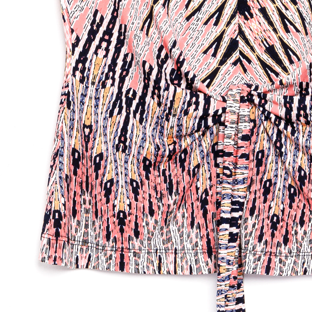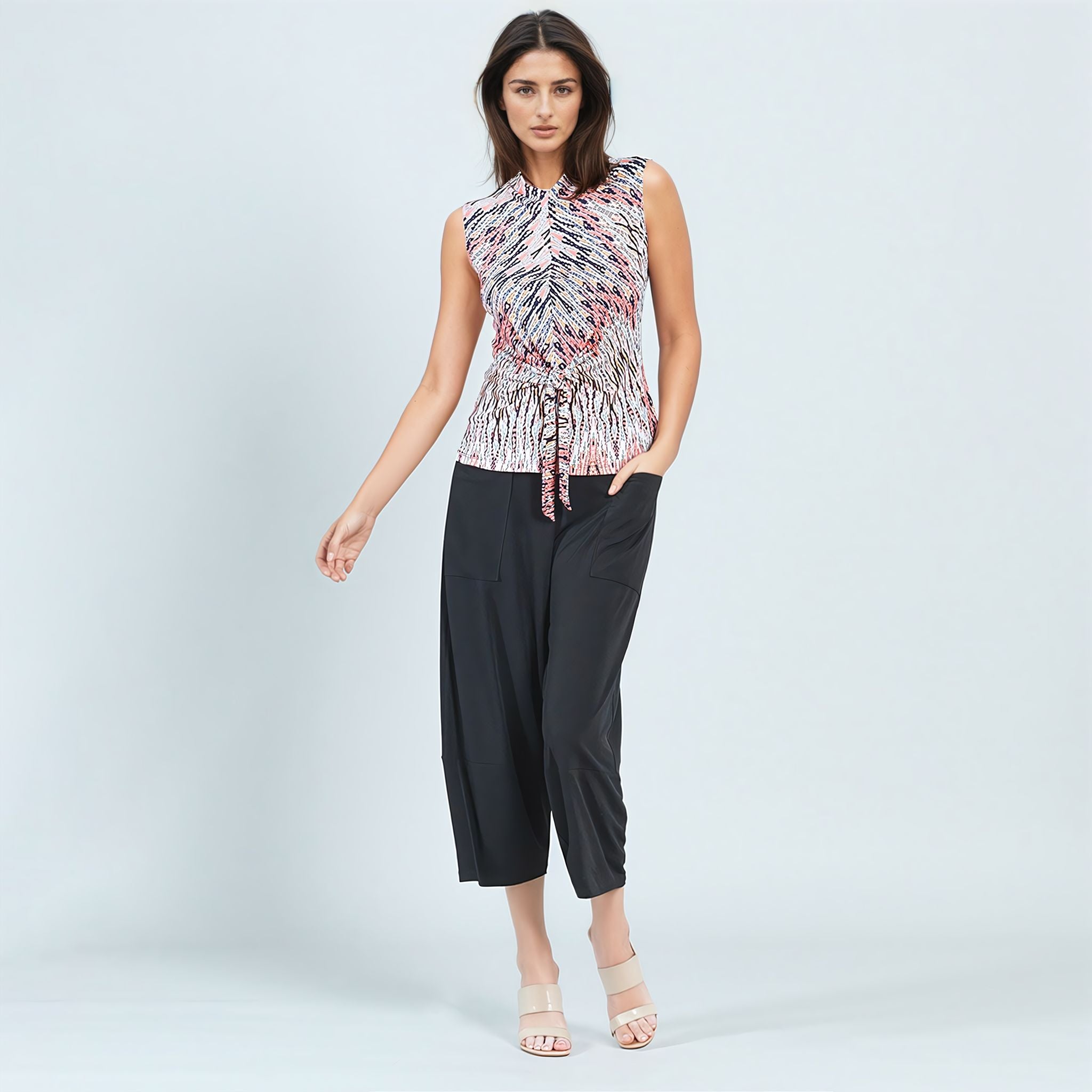 Our Boho Weave Sleeveless Center Front Tie Top is a style you won’t mind putting all your eggs in one basket for! This flattering sleeveless top features a v-bottle neckline, a vertical neck-to-hem center seam, and a front-center waist tie that creates a beautiful draped effect that accentuates your natural figure. A Bohemian-chic print, featuring a basket weave pattern, in shades of coral and black with subtle hints of white and mustard. ♥ Each piece is a unique, one-of-a-kind print and print placement will vary. Carefree Travel Fabric – Soft Silky Knit Our signature poly blend fibers offer luxurious softness with lightweight, wrinkle-free comfort. This easy-care fabric is quick drying and cooler than linen or cotton, making it perfect for on-the-go wear.Wrinkle Free Travel Friendly Ultra Lightweight Soft Knit Fabric Breathable Jersey-Like Feel